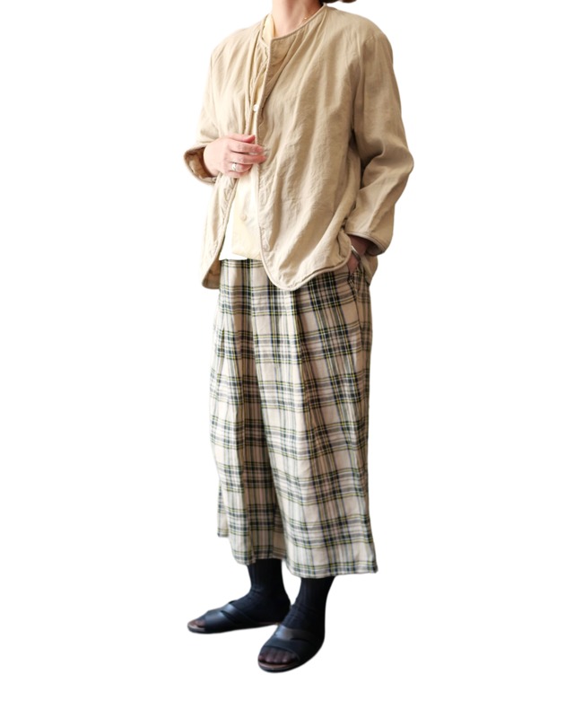コットン生地に格子状に刺繍を施した素敵な生地「トレリス」。透けて見えるシャーロット柄が爽やかです。 柔らかな肌触りで、着心地も軽やかな夏のノーカラージャケットです。身幅と袖幅に余裕があり、着丈が長すぎないので、着た時のシルエットはすっきりとスタイル良く見せてくれます。Tシャツやワンピースに羽織るのもおすすめです。 cotton100% Mサイズ:肩幅45 身幅55 袖幅25 袖丈43 着丈56.5cm オールドマンズテーラー 日本製