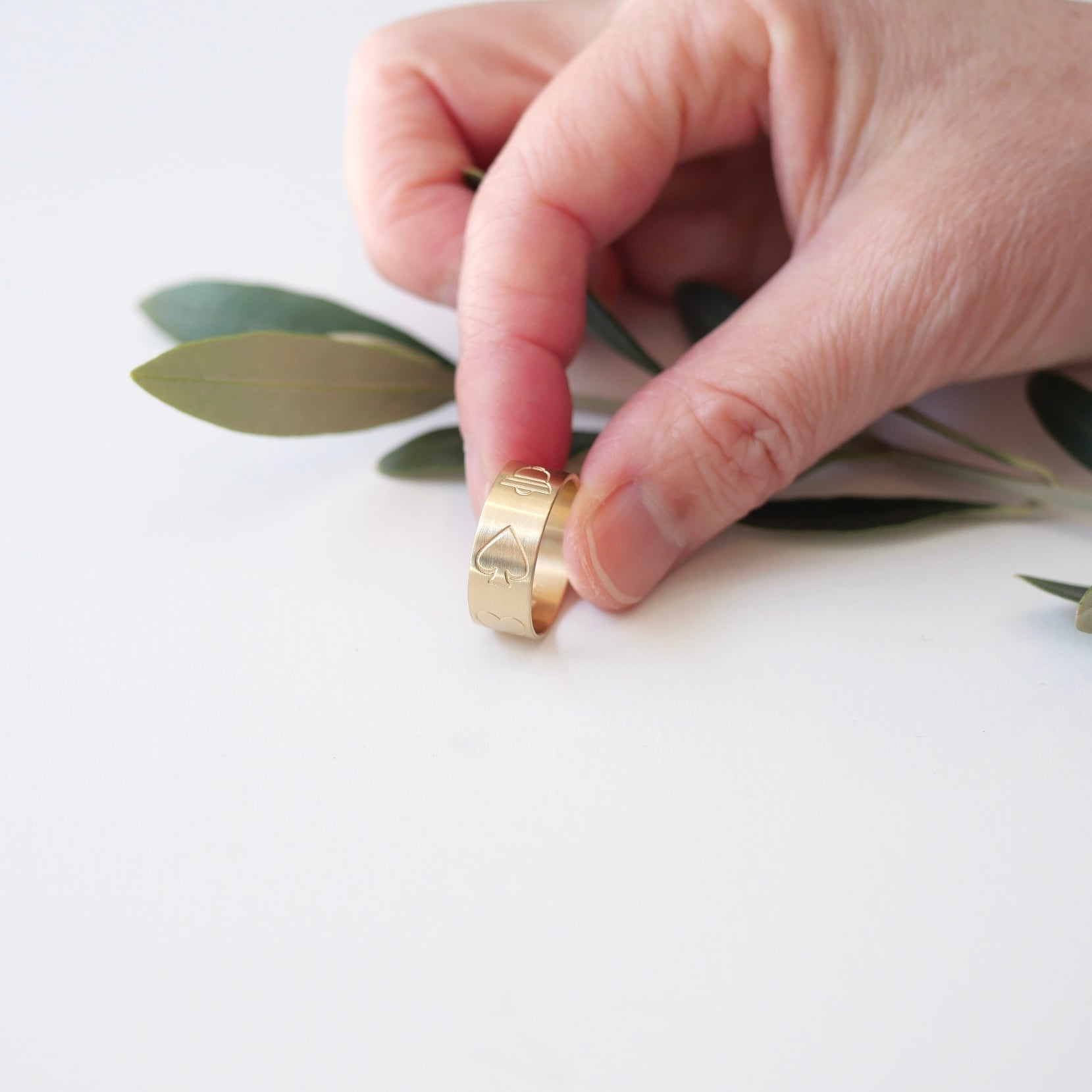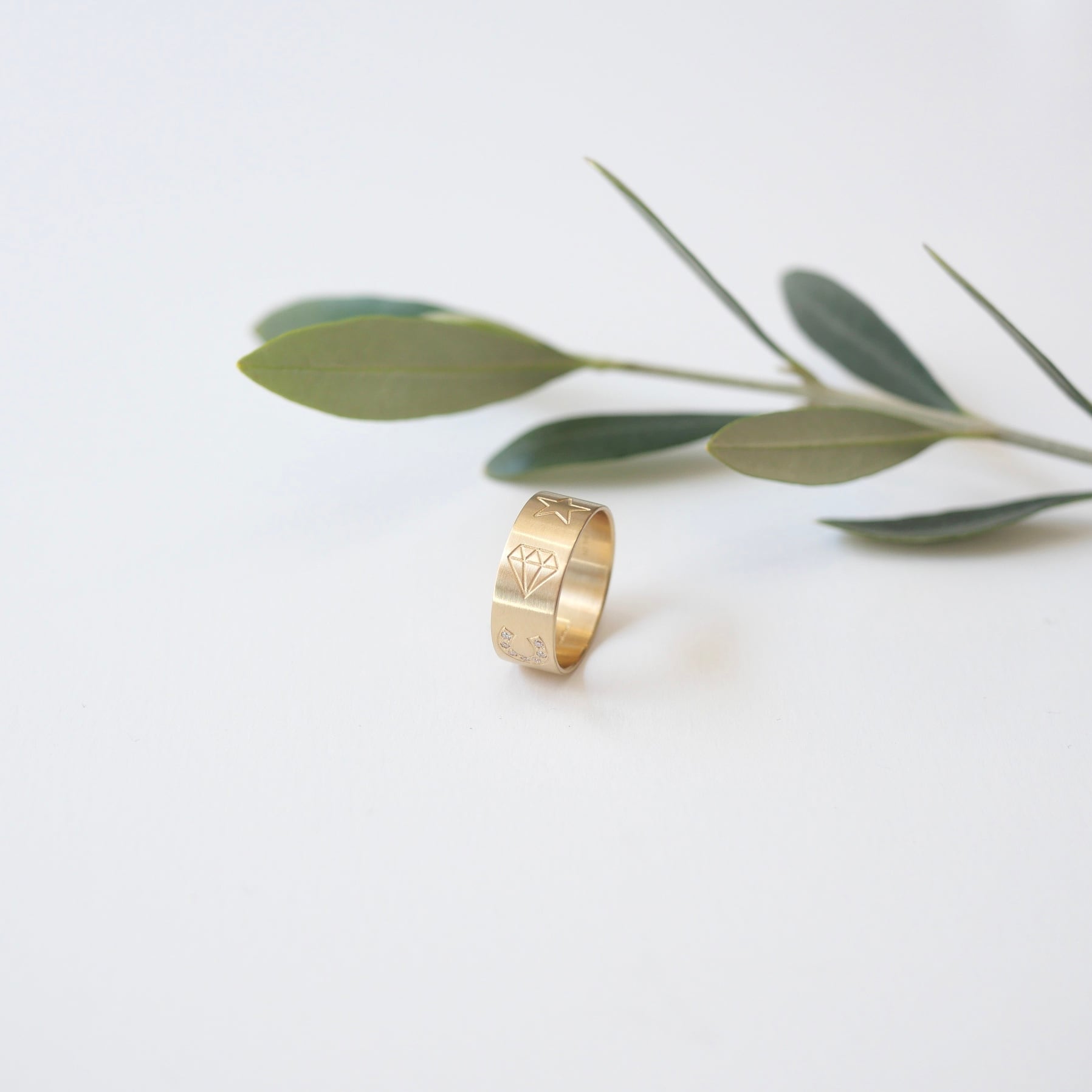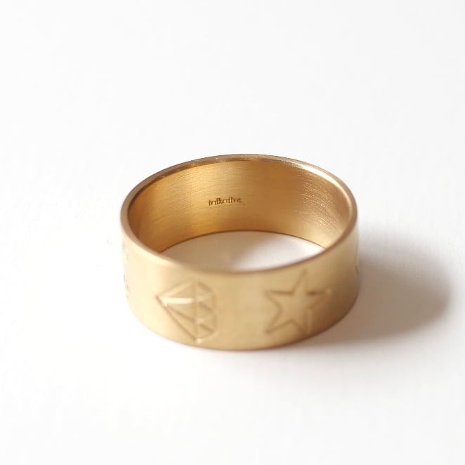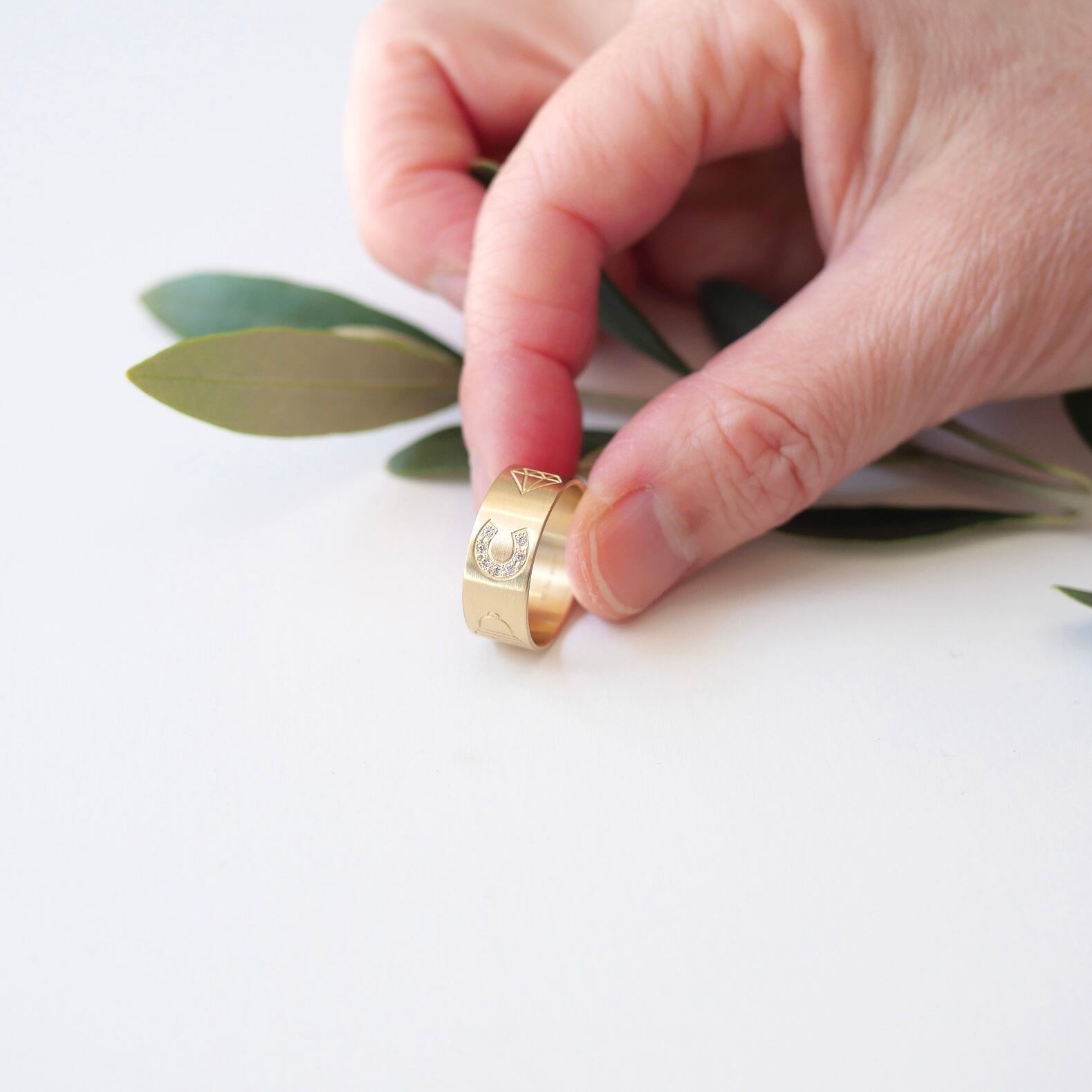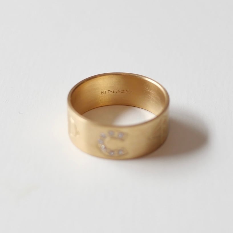 カジノゲームのひとつ、スロットマシーンのリールの一つをそのままリングに。初めて作られた「リバティーベル」というマシーンには「馬蹄、星、スペード、ハート、ベル、ダイヤモンド」の幸運モチーフが使われていたそうです。リングに一周そのモチーフをあしらって、馬蹄にはダイヤモンドを、リングの内側には