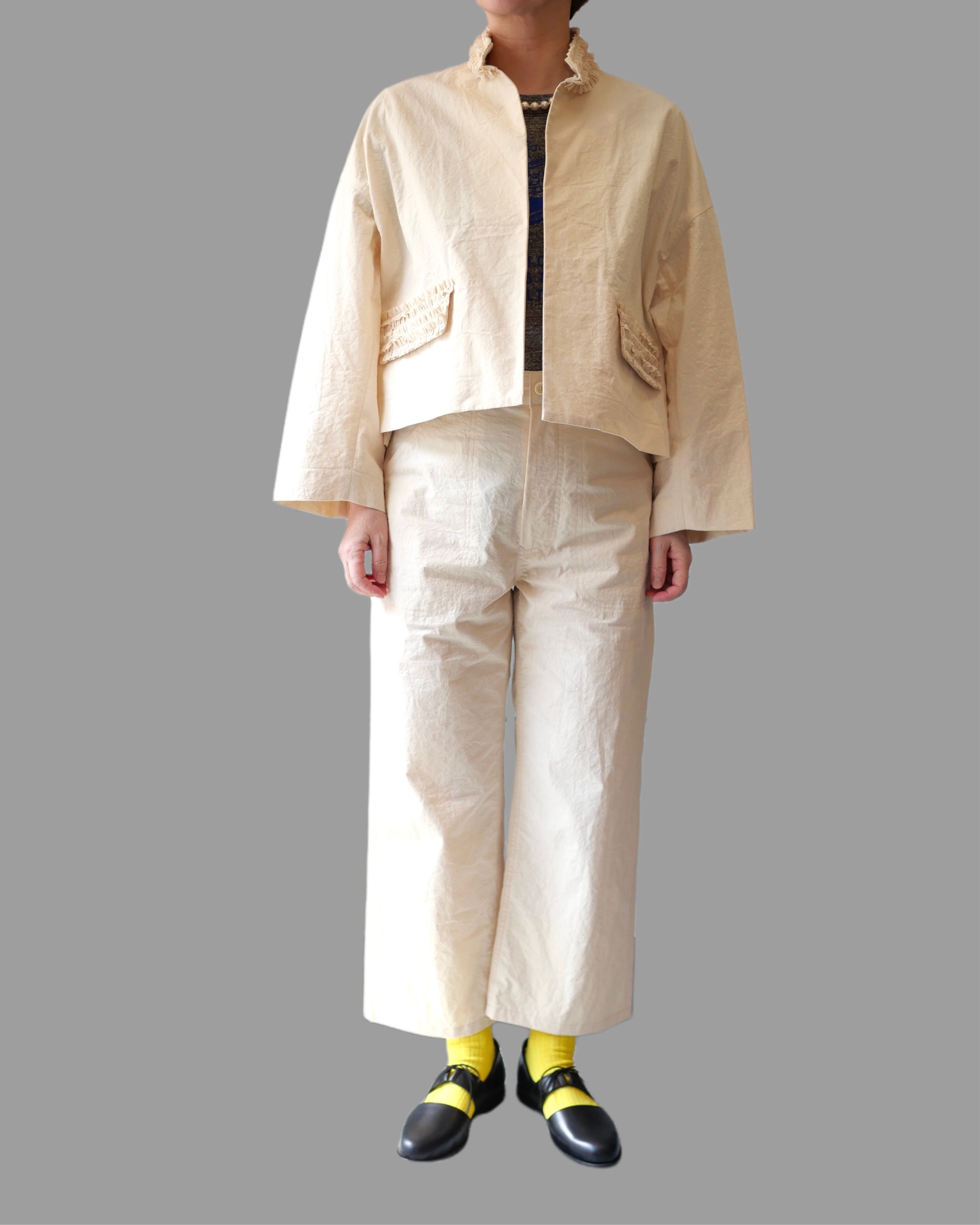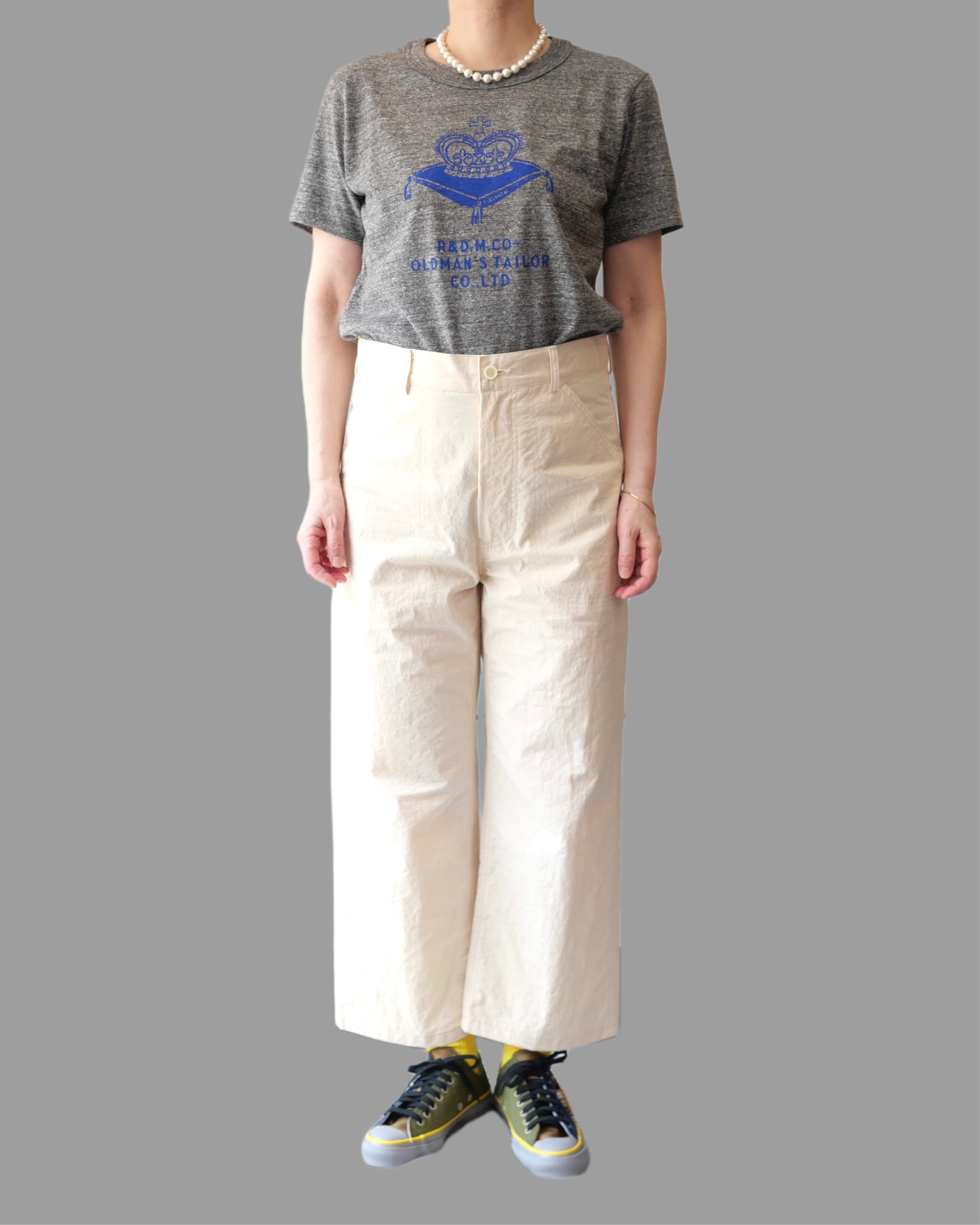 二重織り組織のハイカウントコットン生地を使用した上品な光沢とハリのある爽やかな手触りです。しっかりとした生地感ですが真夏でも涼しい履き心地のワークパンツ。程よい太さで動きやすく履きやすいデザインが人気です。