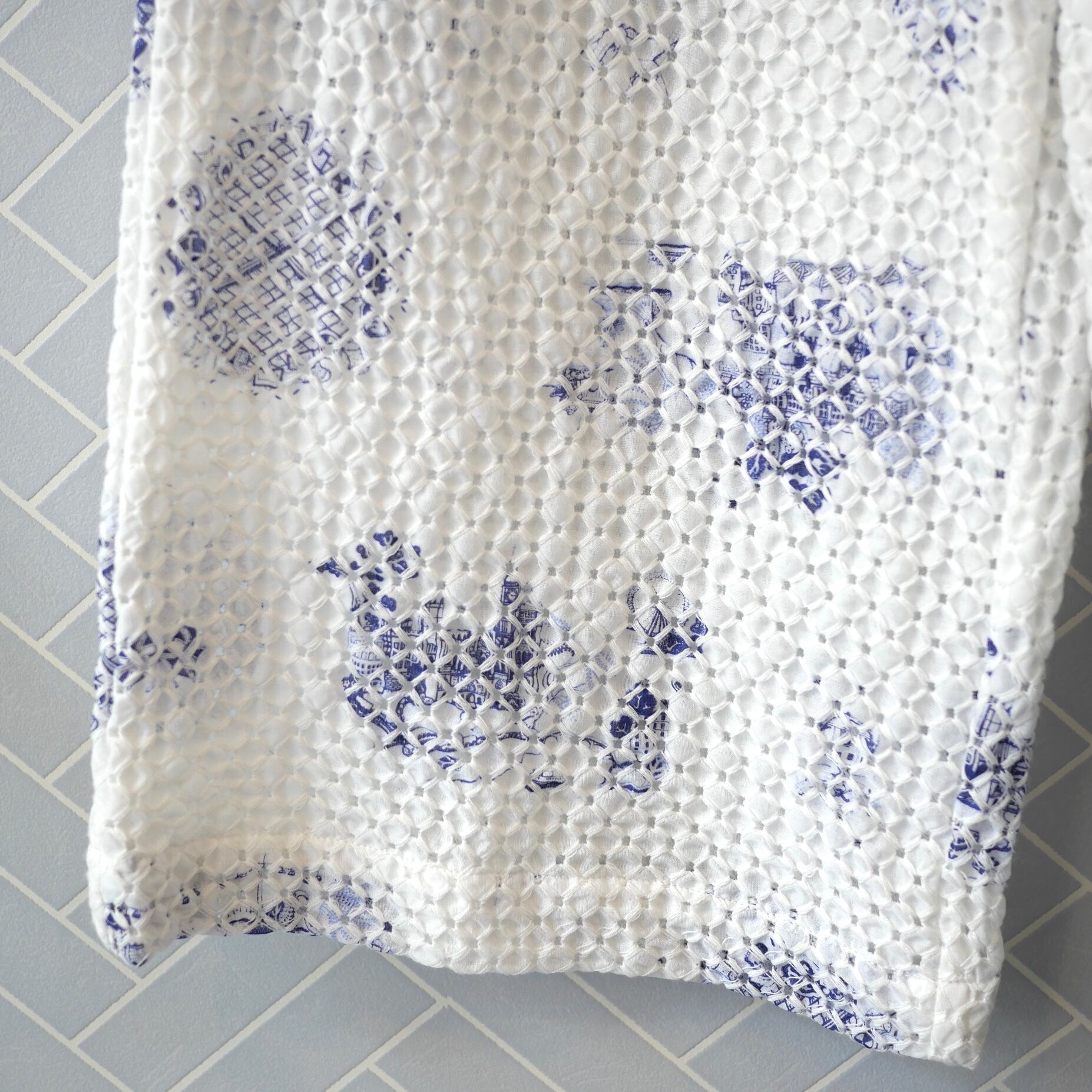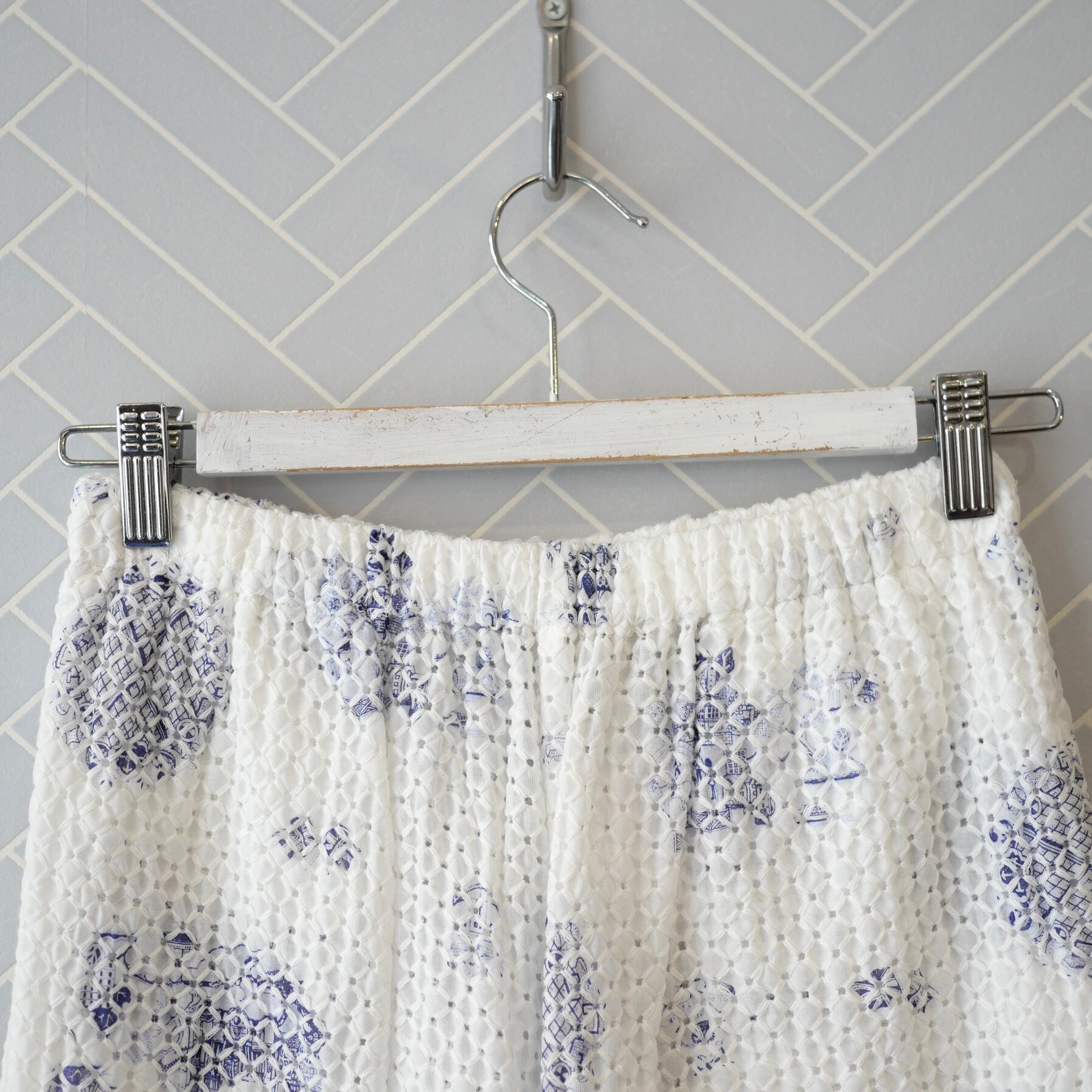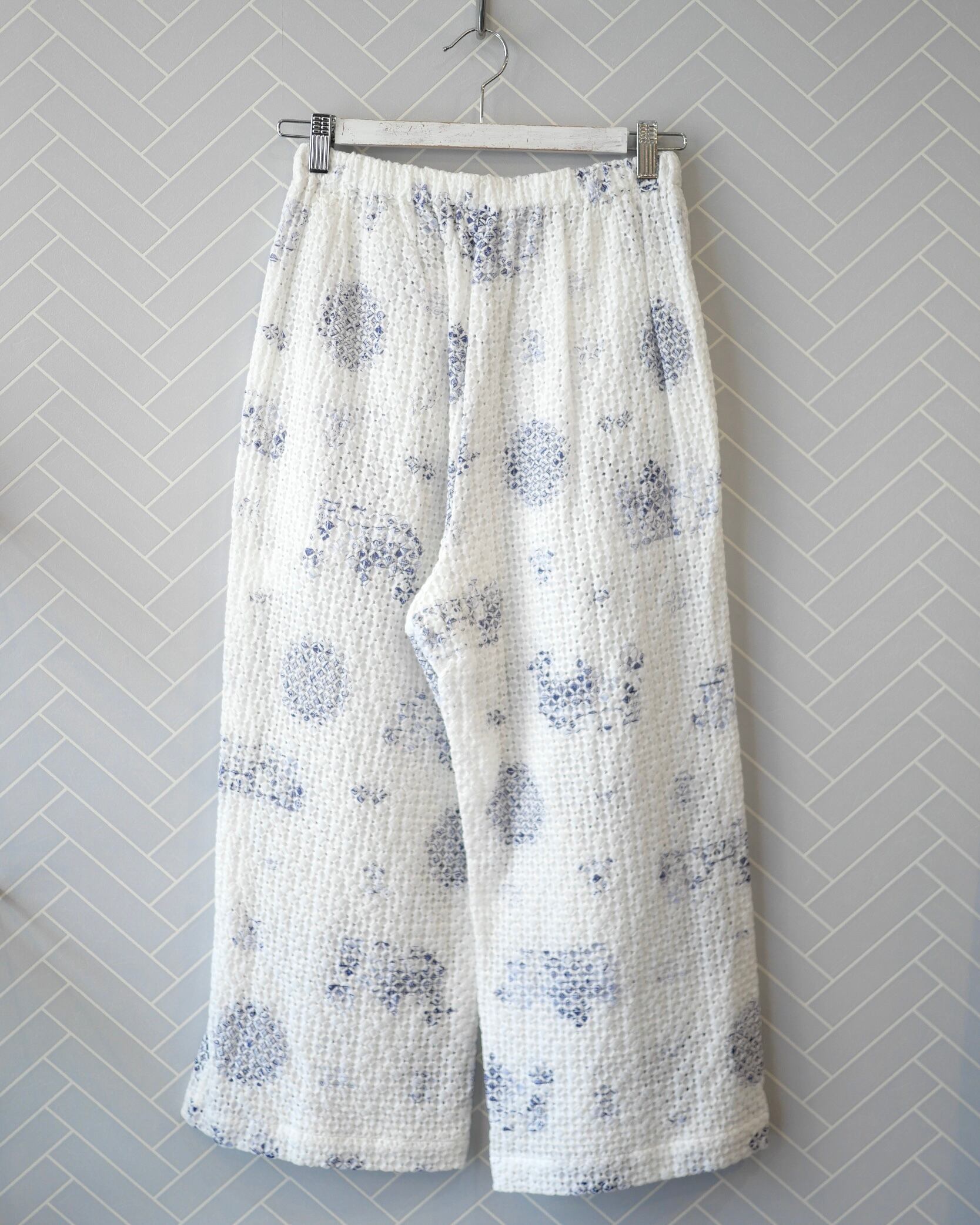 格子状に刺繍が施されたトレリスシリーズ。ベースのロンドンブルーウィロー生地が爽やかです。軽い履き心地のゴムパンツは膝下から綺麗なラインでさまざまな体型の方に好評を頂いているデザインです。おしり周りゆったり、暑い夏も、インナーを履いて履く季節にも是非お役立てください。