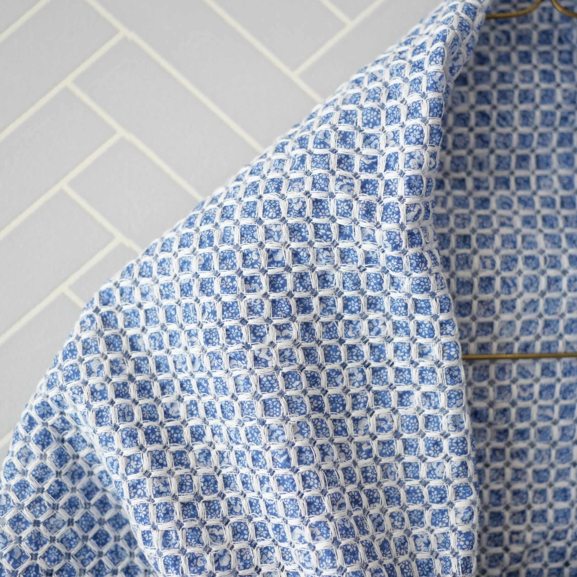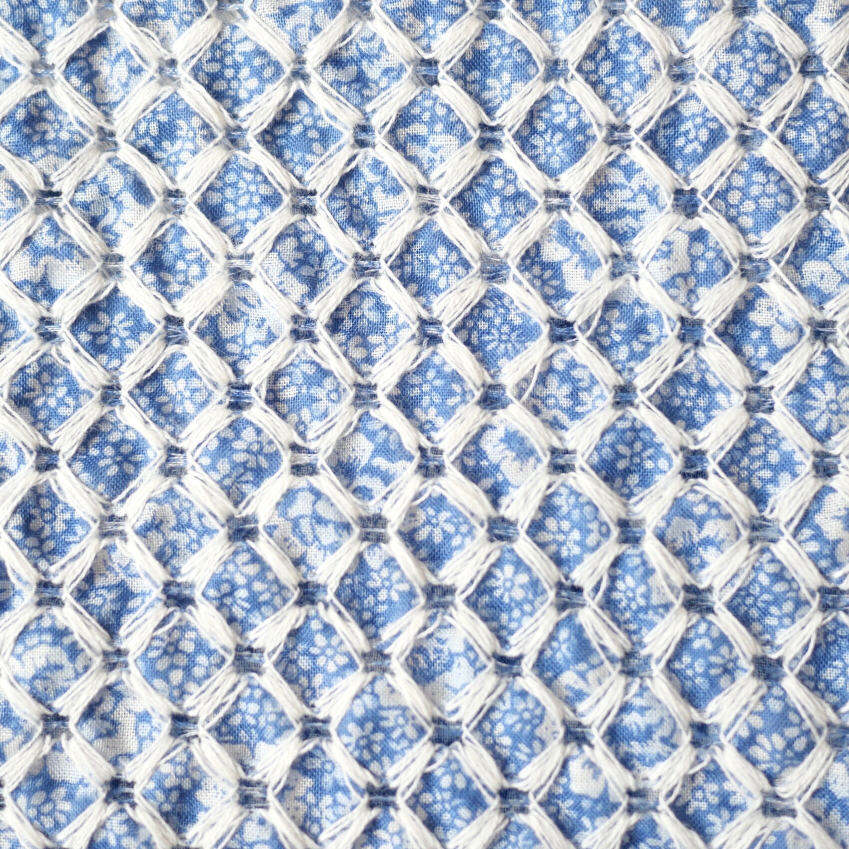 コットン生地に格子状に刺繍を施した素敵な生地「トレリス」。透けて見えるシャーロット柄が爽やかです。冷房の強いところで肩にかけたり、お昼寝のお供にしたり、、心地よいサマーブランケットが出来上がりました。