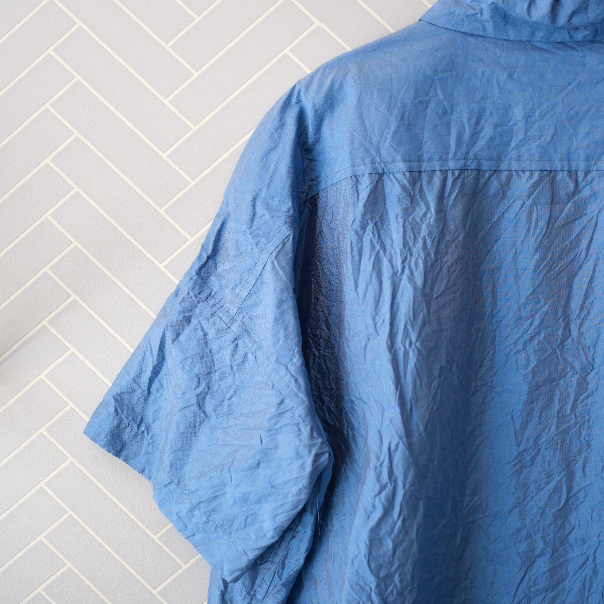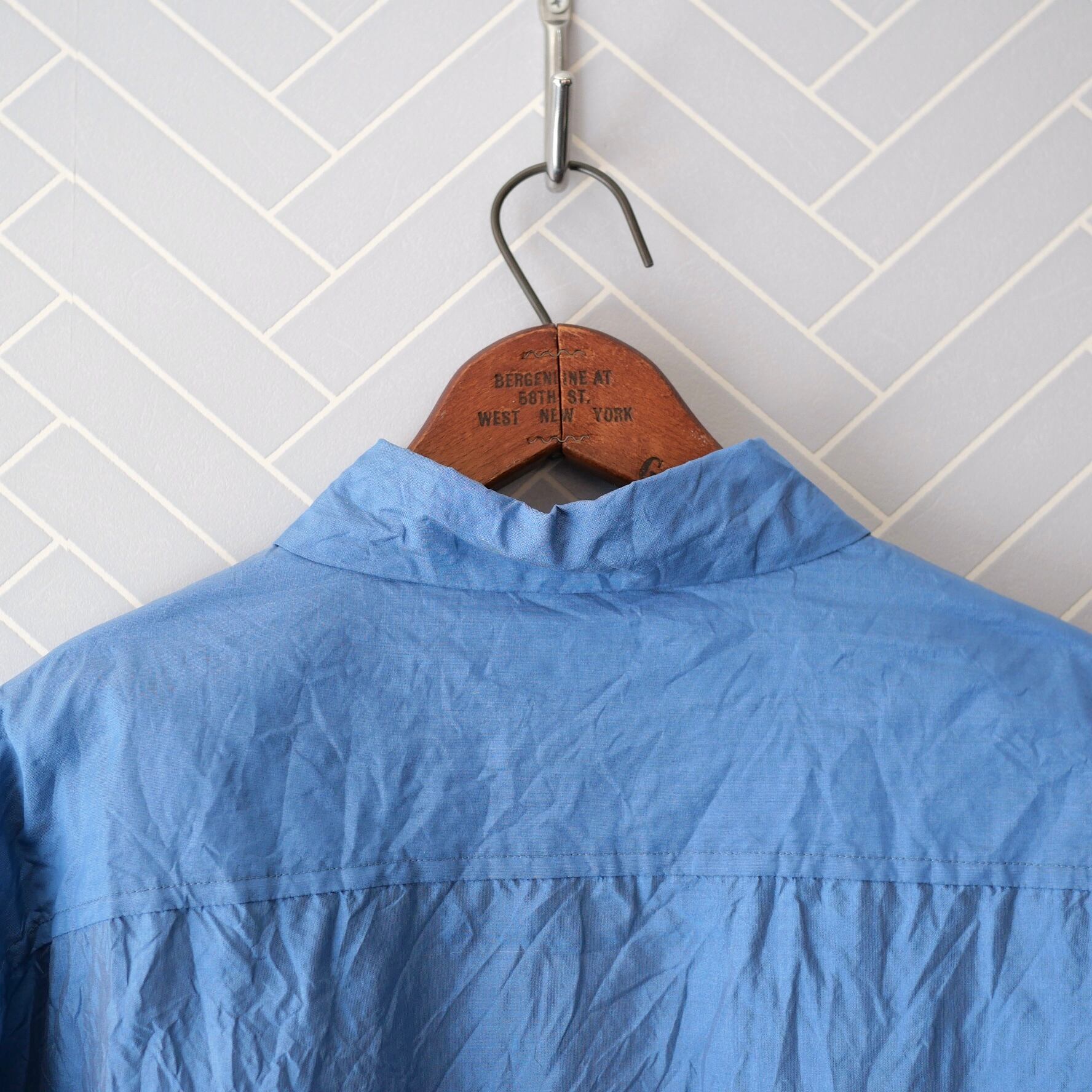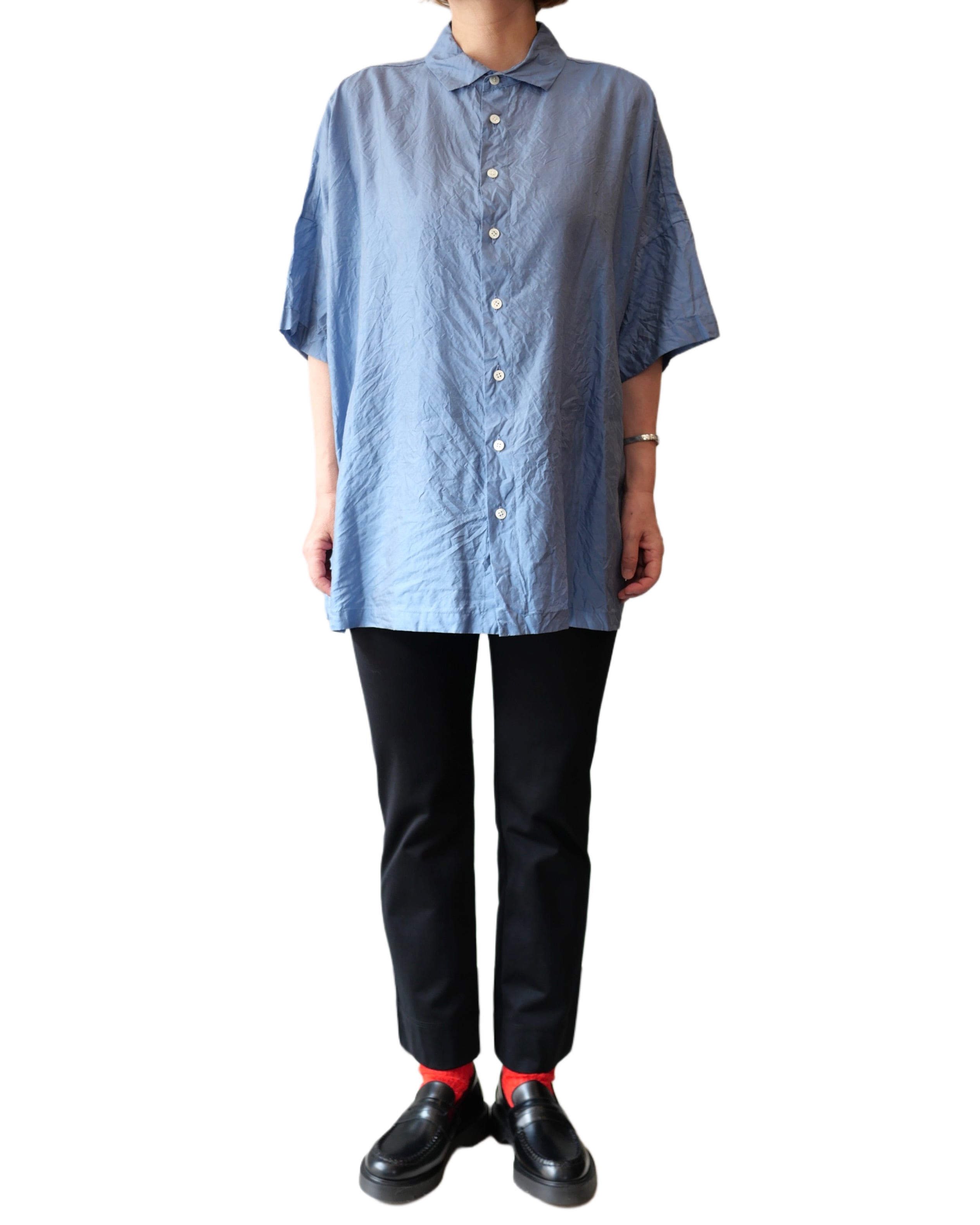洗いのかかったシルク100%のオーバーサイズドレス。身幅がたっぷりしていて涼しく風通りの良いシャツです。丈も長めで出してもインでも着やすい長さ。安心感があります。襟付きのシャツはかっちり感も出せてマニッシュな着こなしにも最適です。