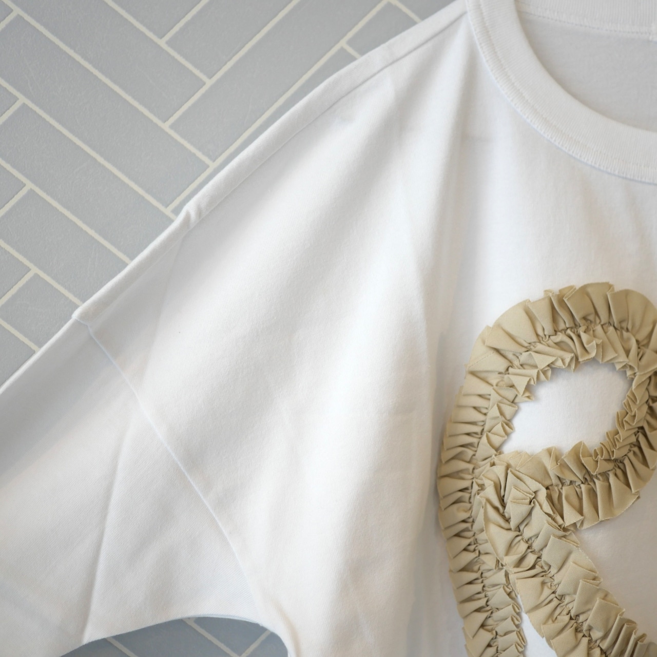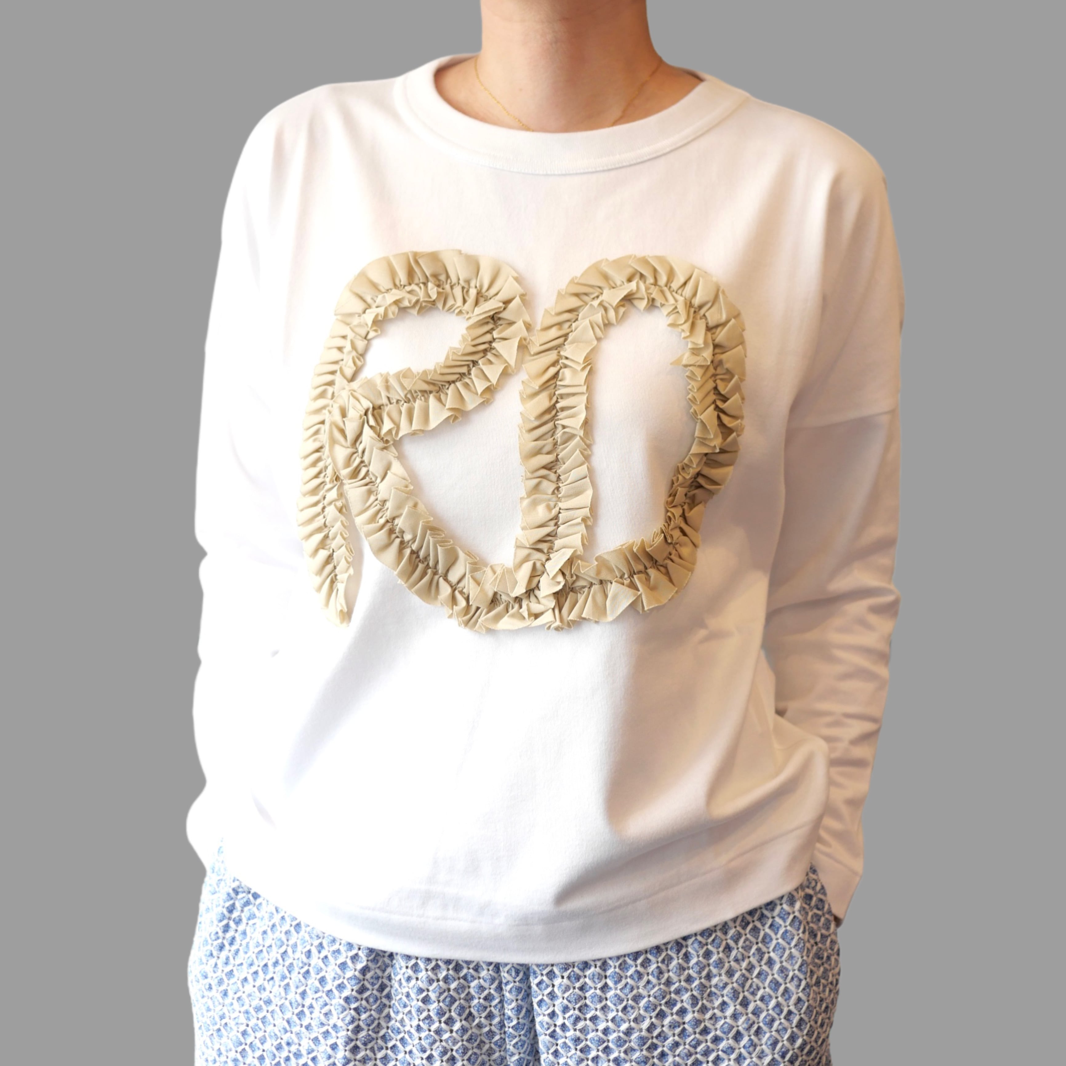 「RD」のブランドロゴがフリルで縫い付けられた、主役になる長袖Tシャツ。生地がしっかりとした厚手のコットン100%。パンツでもスカートでも合わせやすい丈感です。