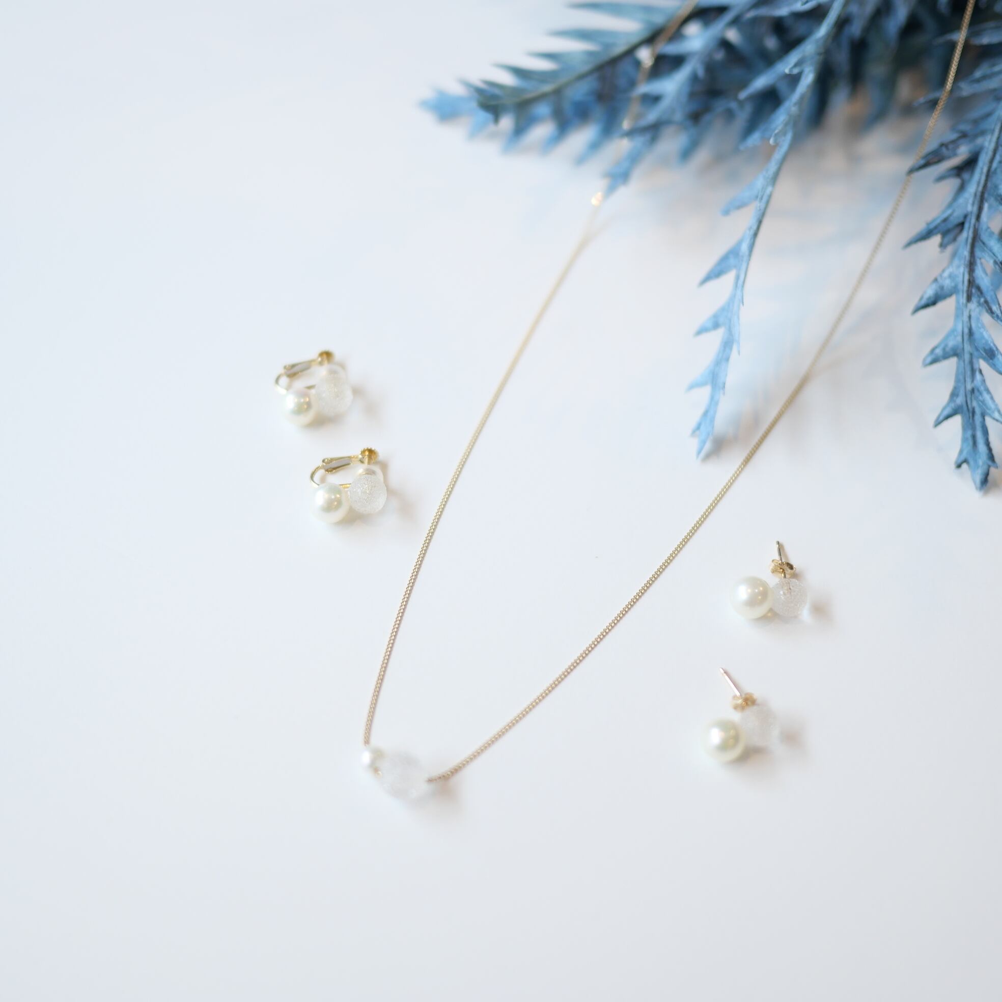 雪のように輝くガラスと優しい光沢の真珠がデコルテを華やかに演出します。伊勢志摩のアコヤ真珠、K10金具を使用しています。