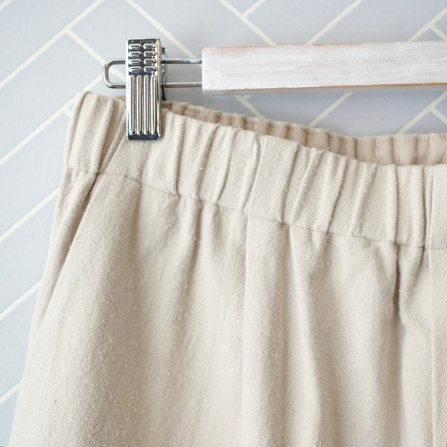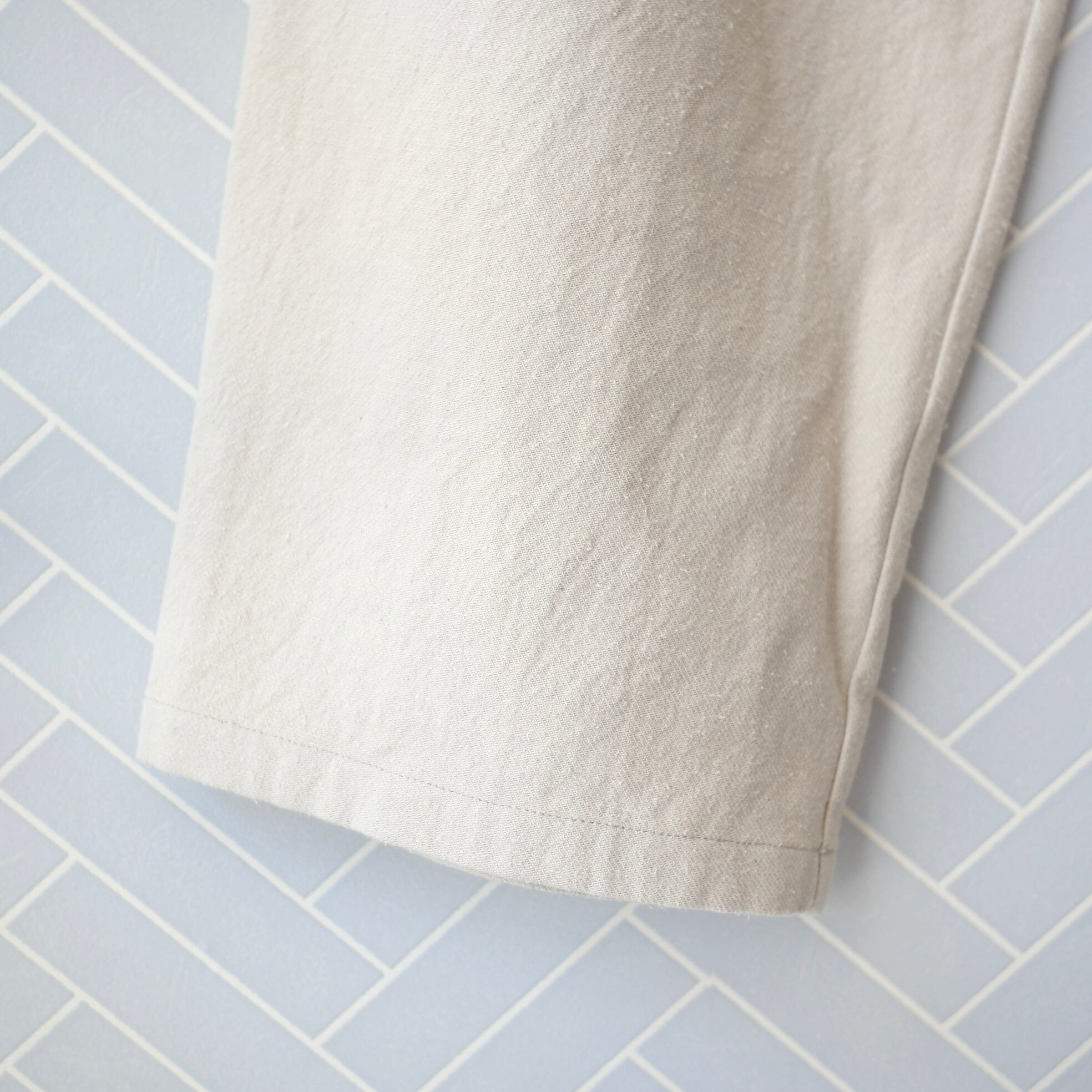 コットンの丈夫さとシルクのしなやかさを併せ持つ生地を使用しています。しっかりとした厚みがありながらも、柔らかな風合いが着ていく度に身体に馴染みます。シルク混素材ですが、家庭でのお洗濯が可能ですので、お手入れを気にすることなく日常的にカジュアルに履いていただけます。