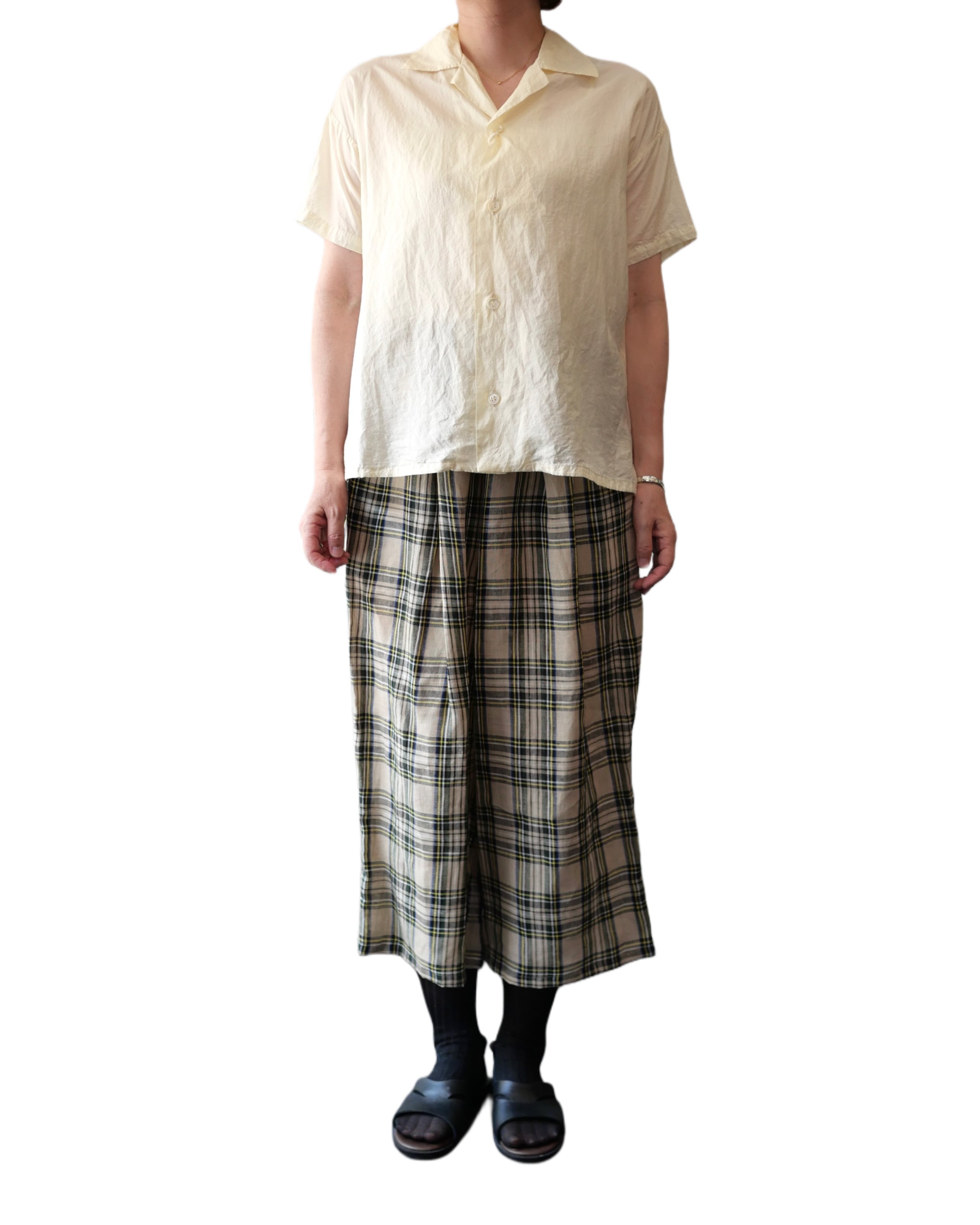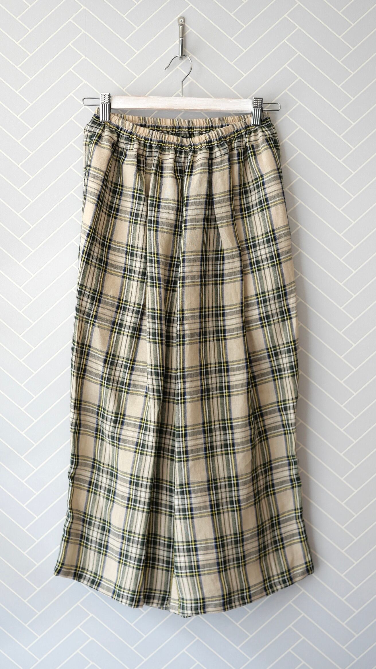 R&D.M.Co- 2024年の限定生地「Flax Stewart」生地を使用したゴムパンツが再入荷しました。シワ感のあるリネン100%生地は、丈夫で涼しい素材です。秋から初冬はタイツやレギンスと合わせてお使いいただけます。
