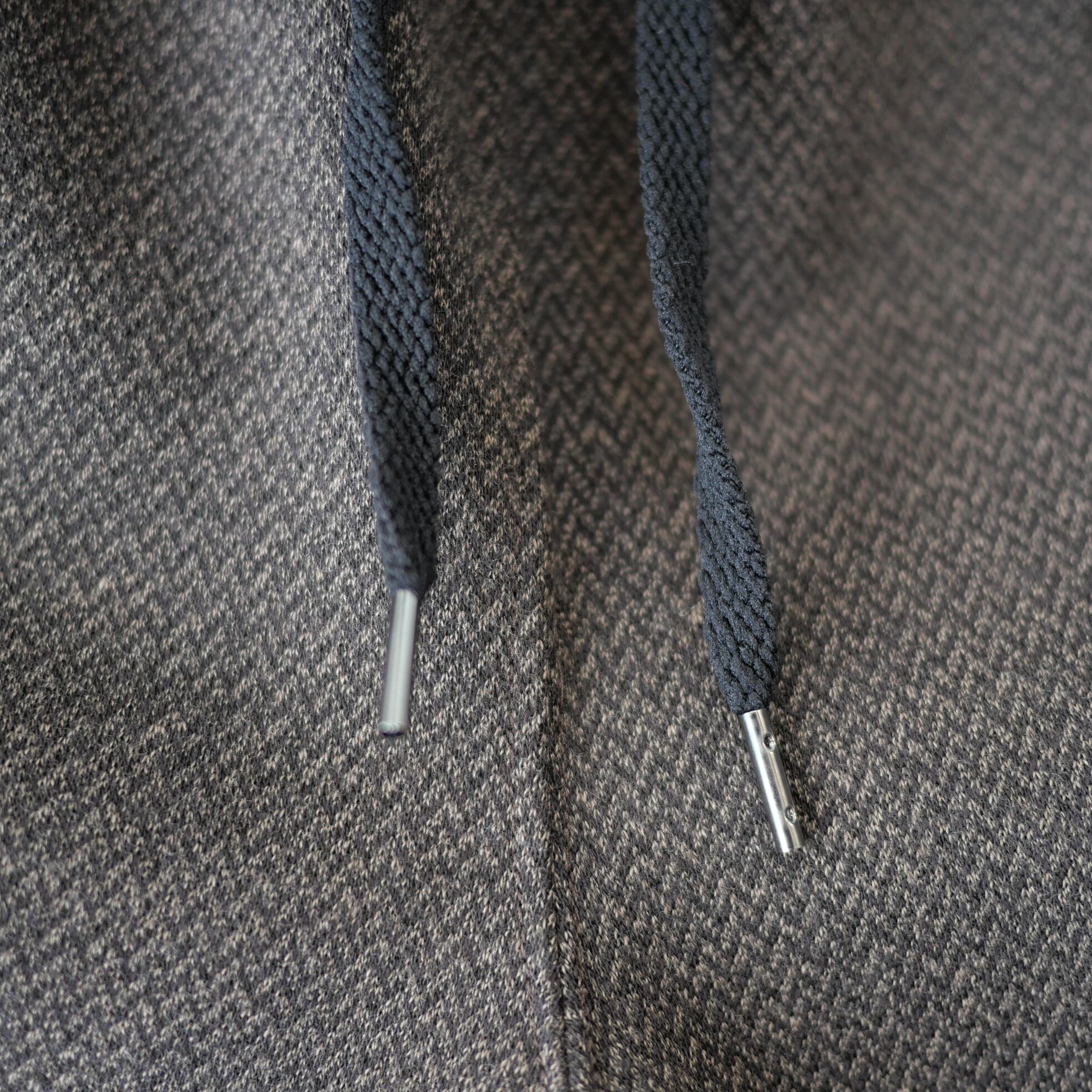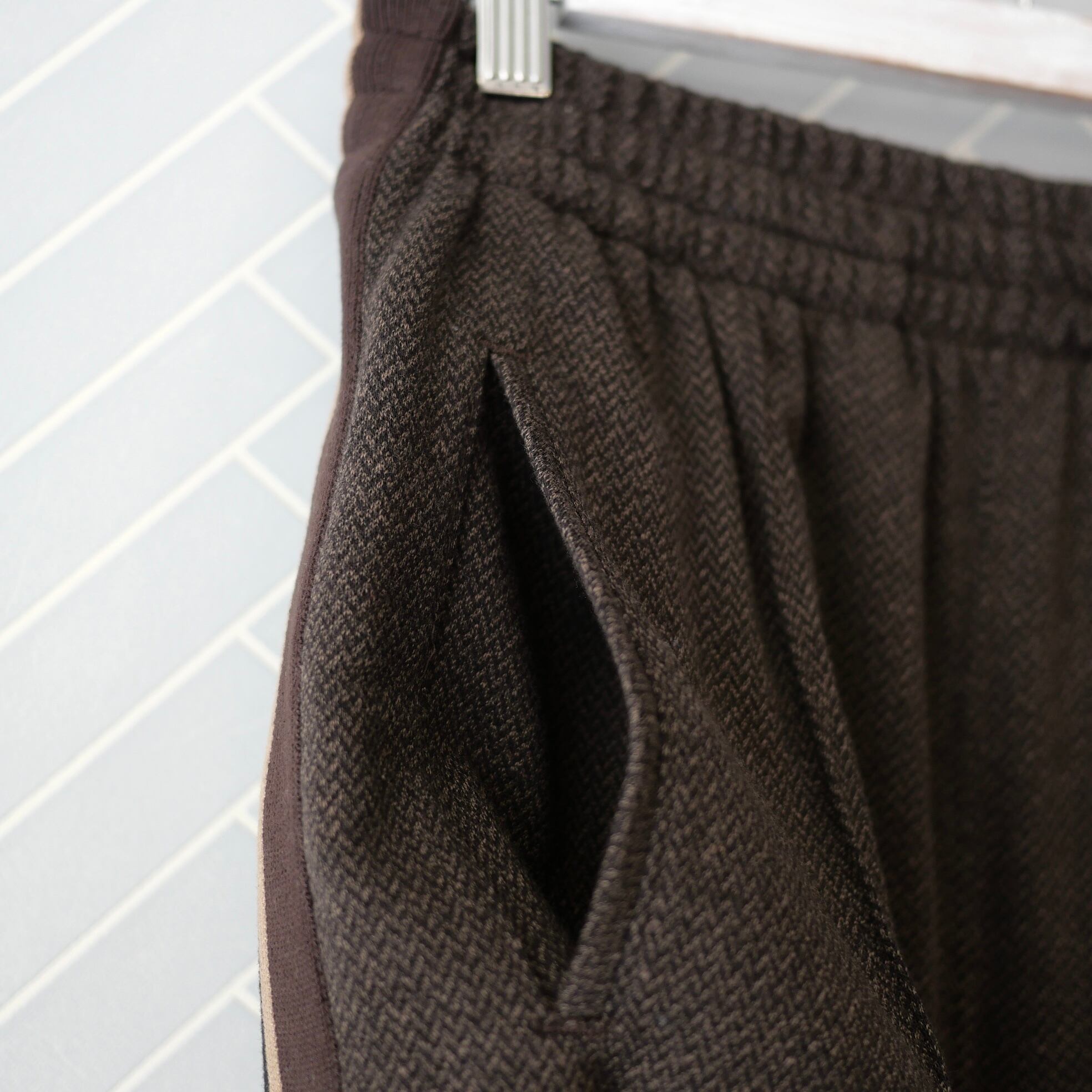 クラシックなスーツ地を思わせるヘリンボーン柄ジャージを使用。程よい光沢と落ち感があり、スラックスの様な雰囲気を持つトラックパンツです。オリジナルのニットパーツによるサイドラインが特徴的です。