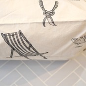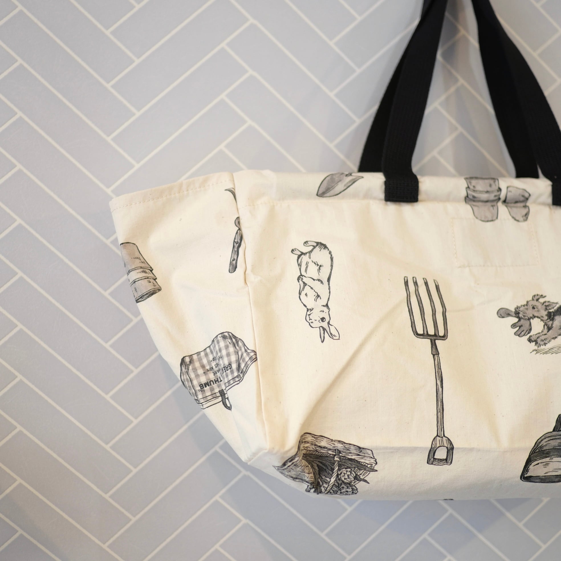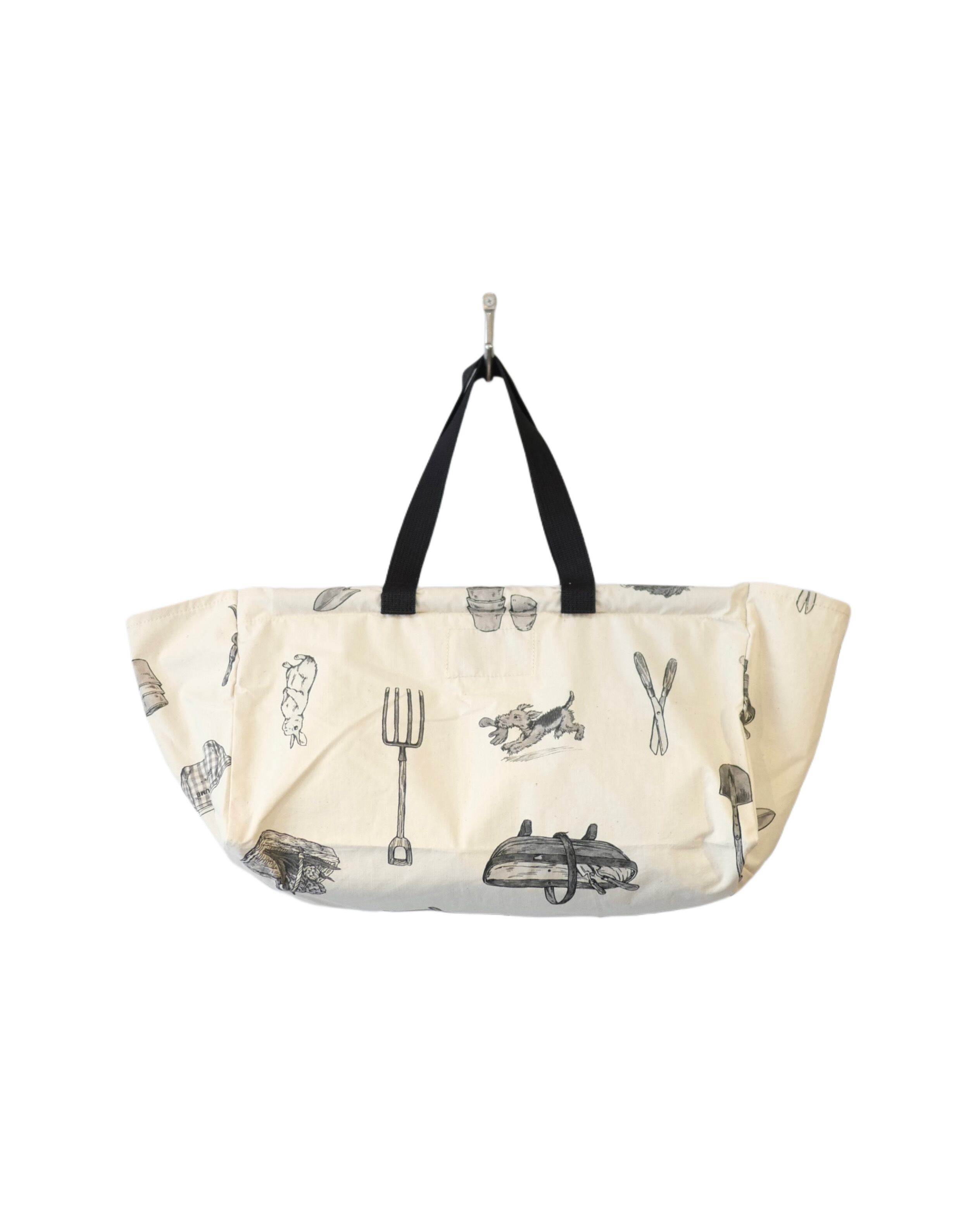 「GRATE GREEN THUMB」柄のフラワーマーケットバッグ。イギリスの田舎にある農機具を収納する小屋と道具をイメージした牧歌的な柄。走り回る犬や顔を出すウサギなど、可愛い柄にもどこか癒しを感じます。厚さのあるコットン生地を使用した開け口が広いバッグです。花束がそのまま入りそうな横幅があり、容量もたっぷりです。持ち手と共に芯が縫い付けてあるので、形崩れもなくお持ちいただけます。