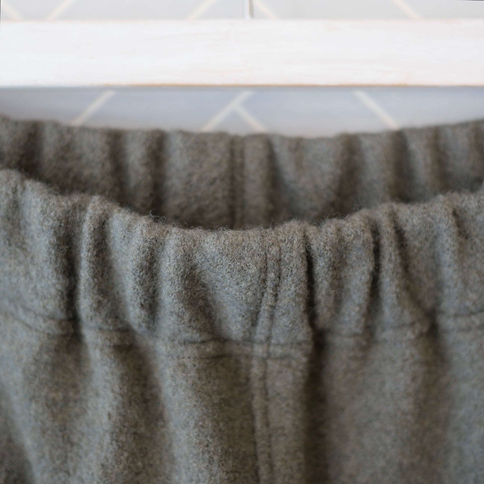 今年の新作は、裾にゴムが入っているジョガーパンツのデザインです。膨らみは抑えめで、すっきりとした形です。裏地はなく、肌に直接触れても優しいウール素材です。