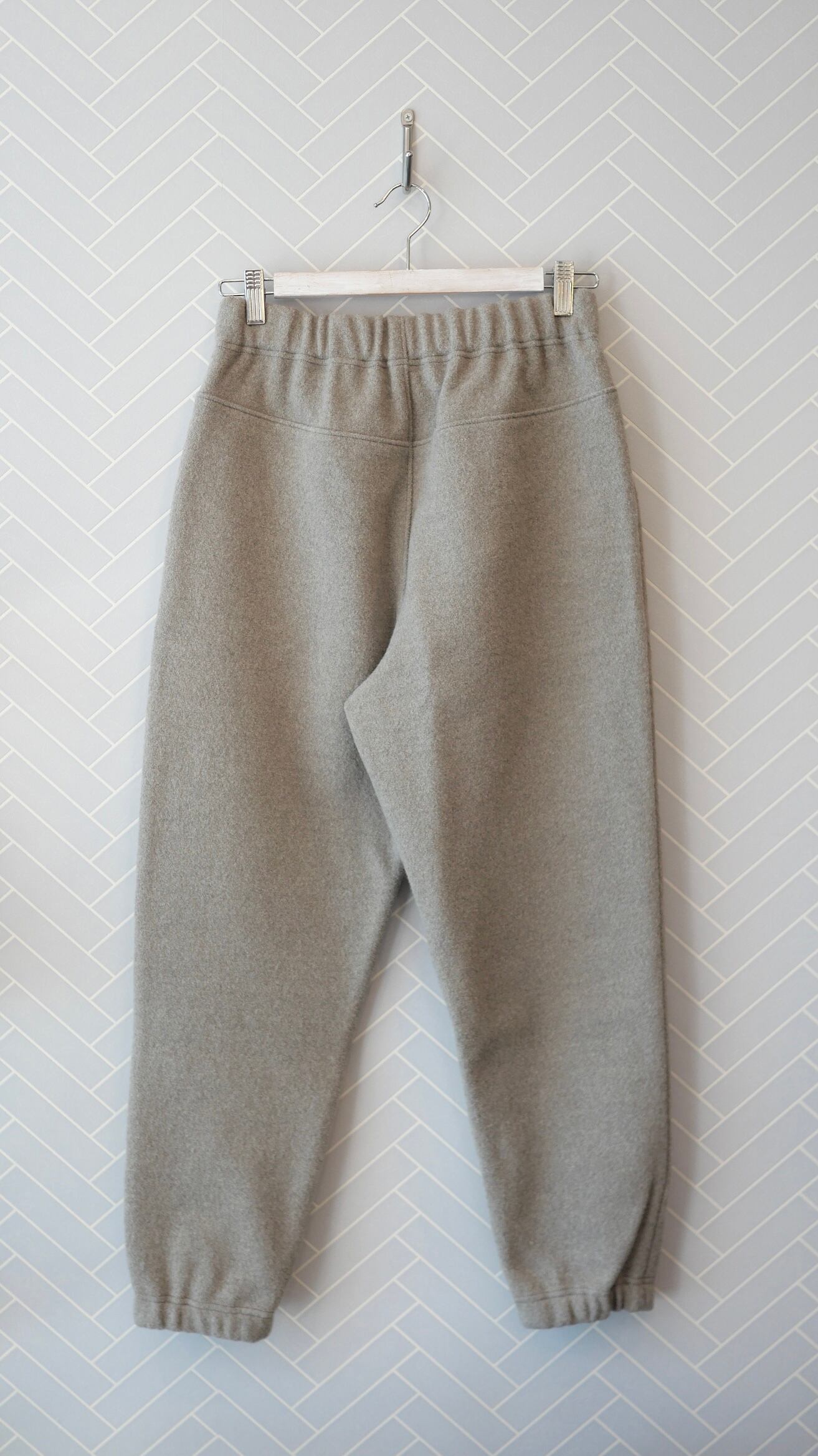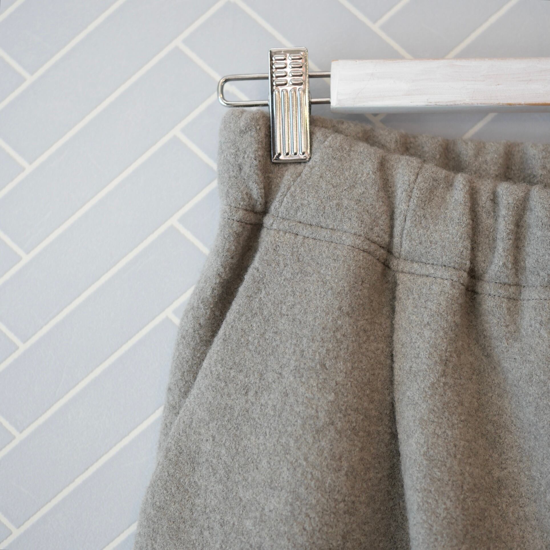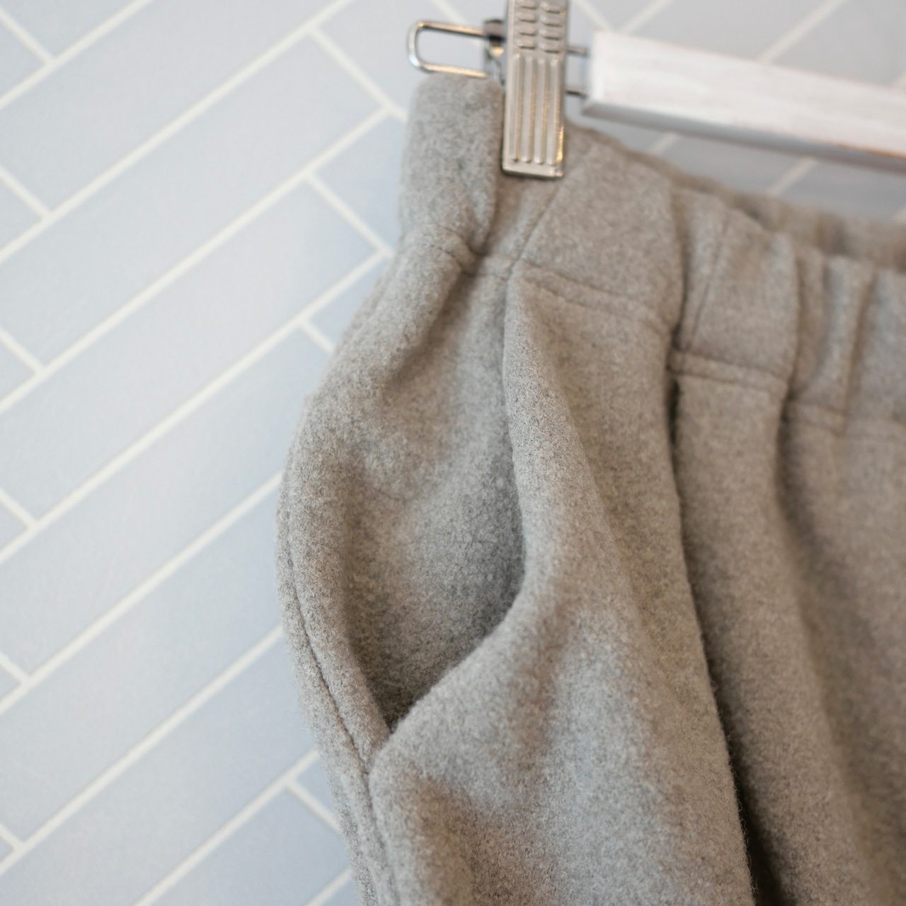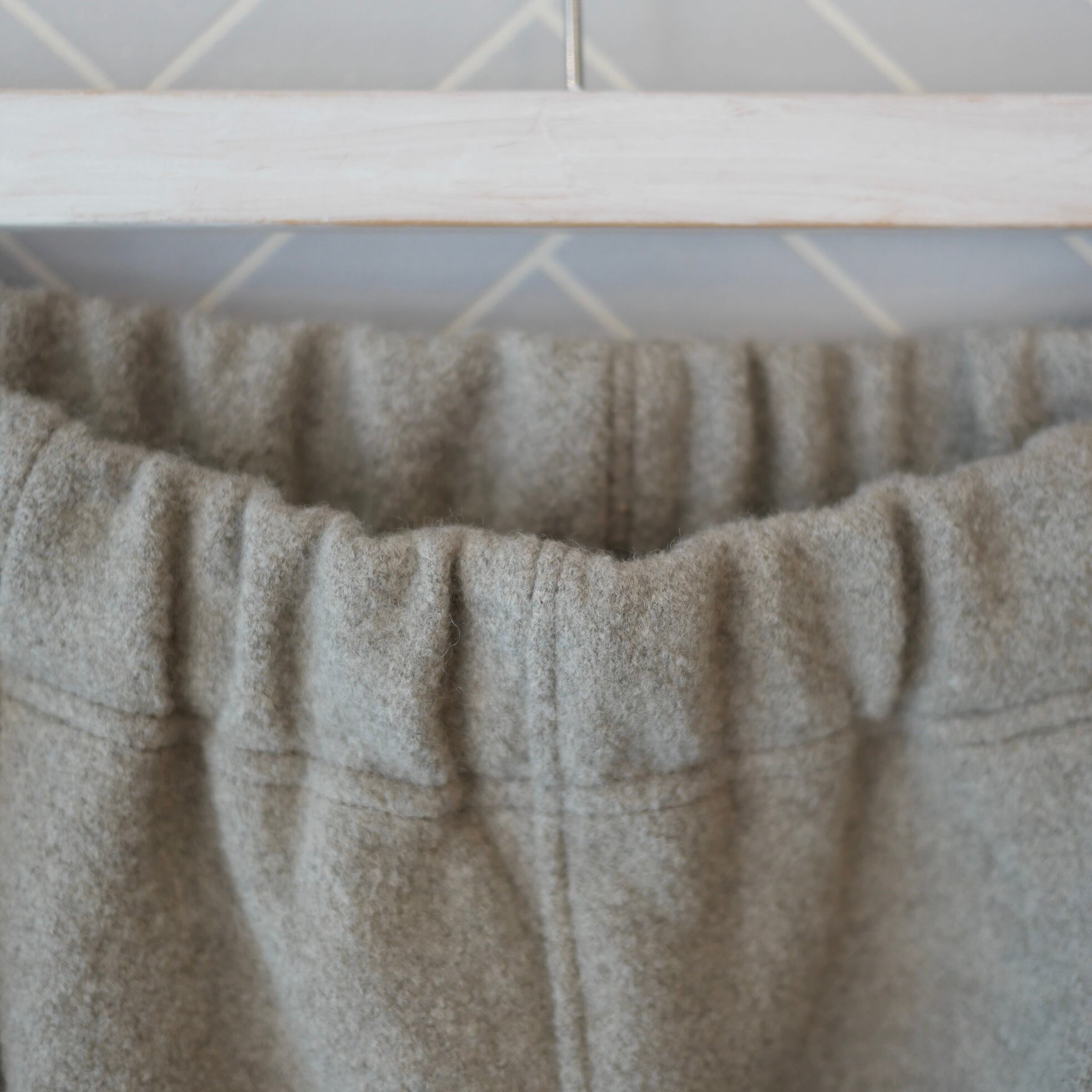 今年の新作は、裾にゴムが入っているジョガーパンツのデザインです。膨らみは抑えめで、すっきりとした形です。裏地はなく、肌に直接触れても優しいウール素材です。