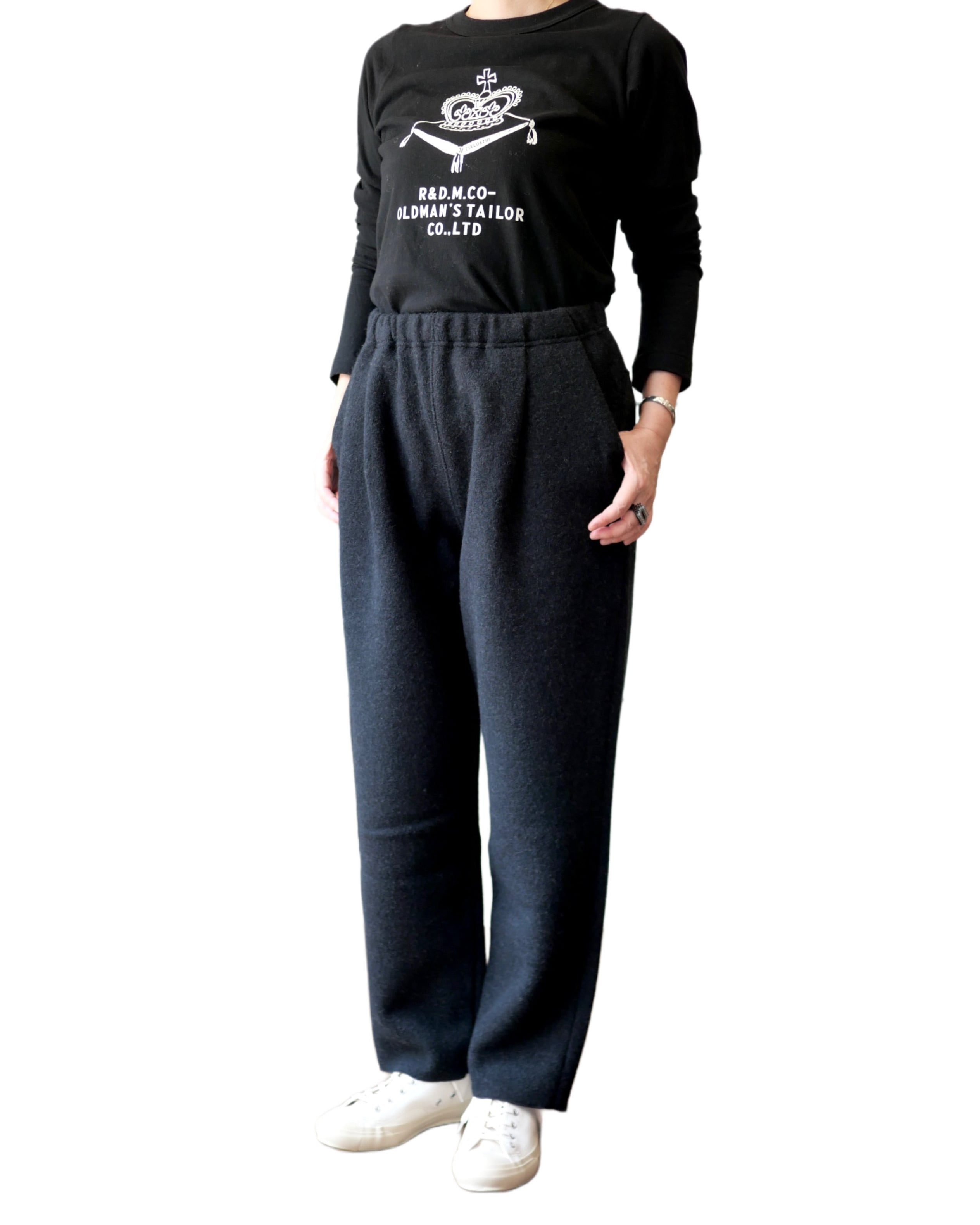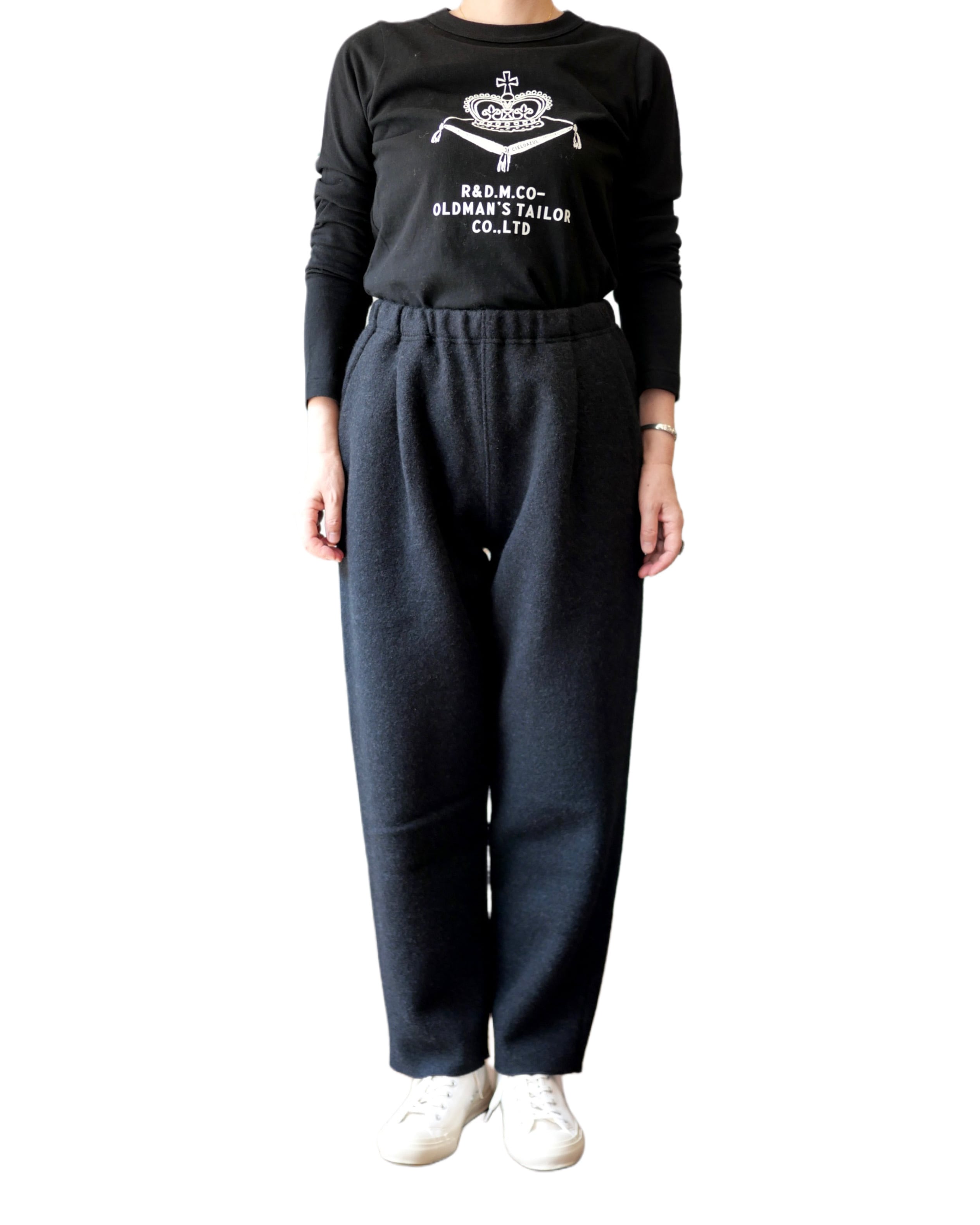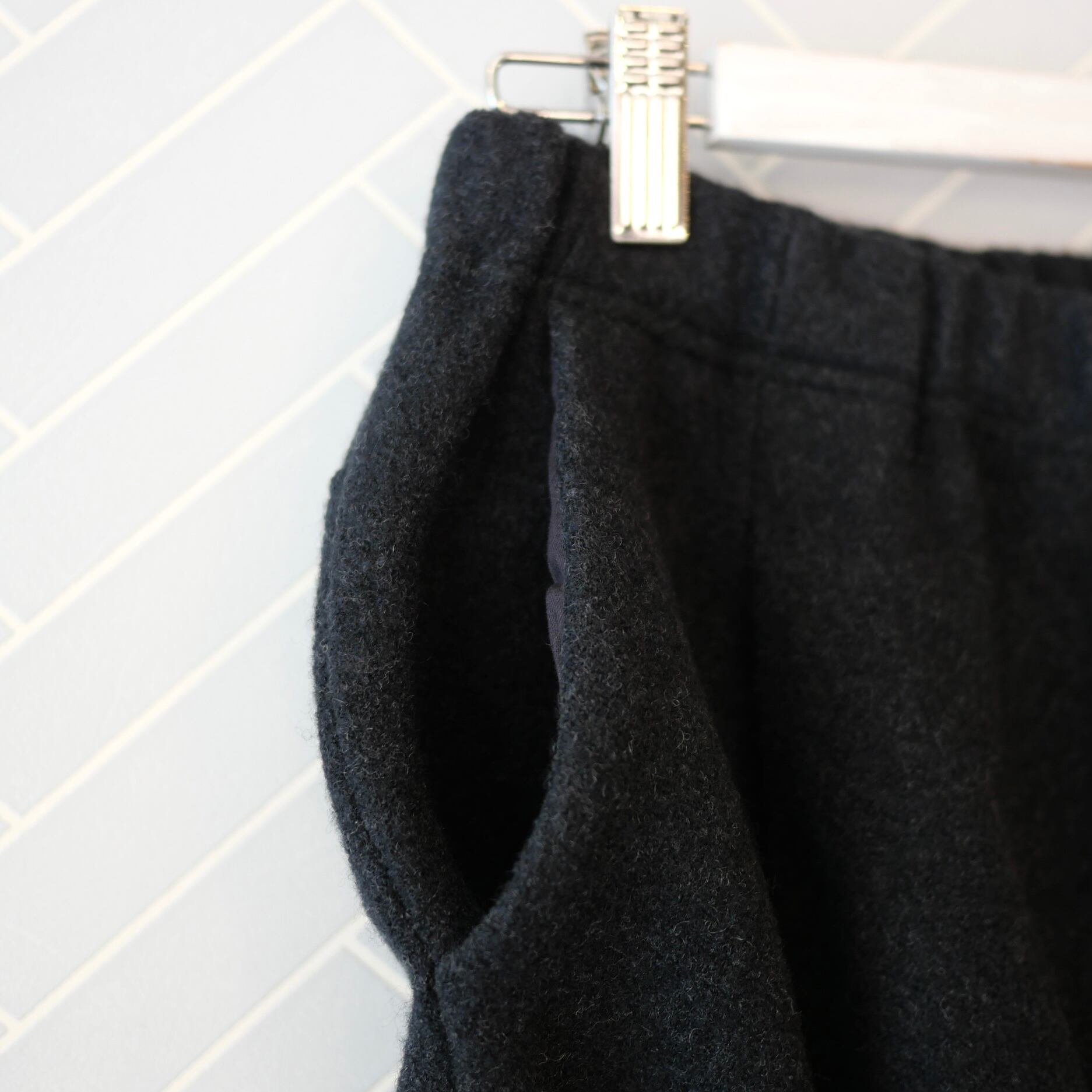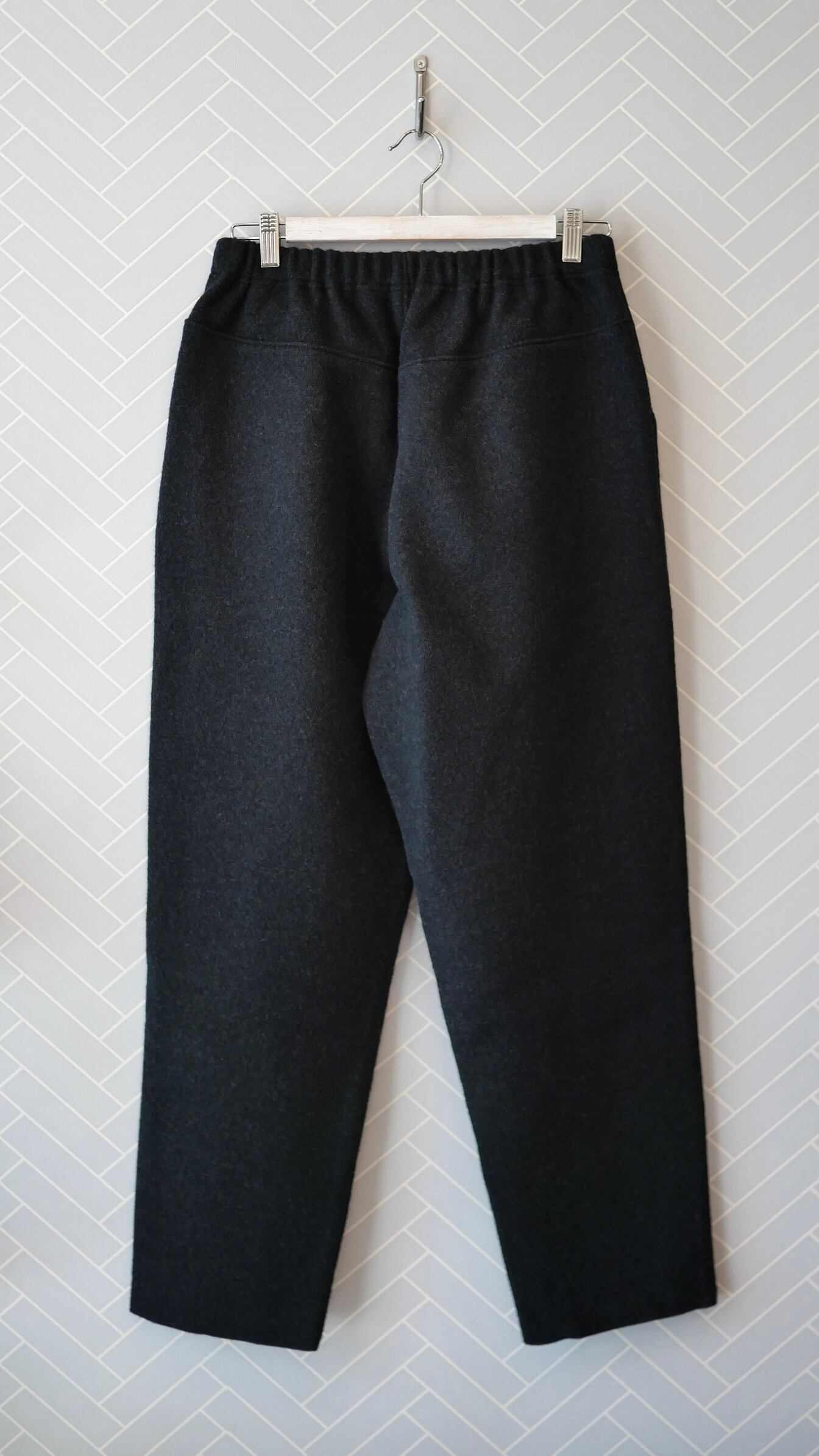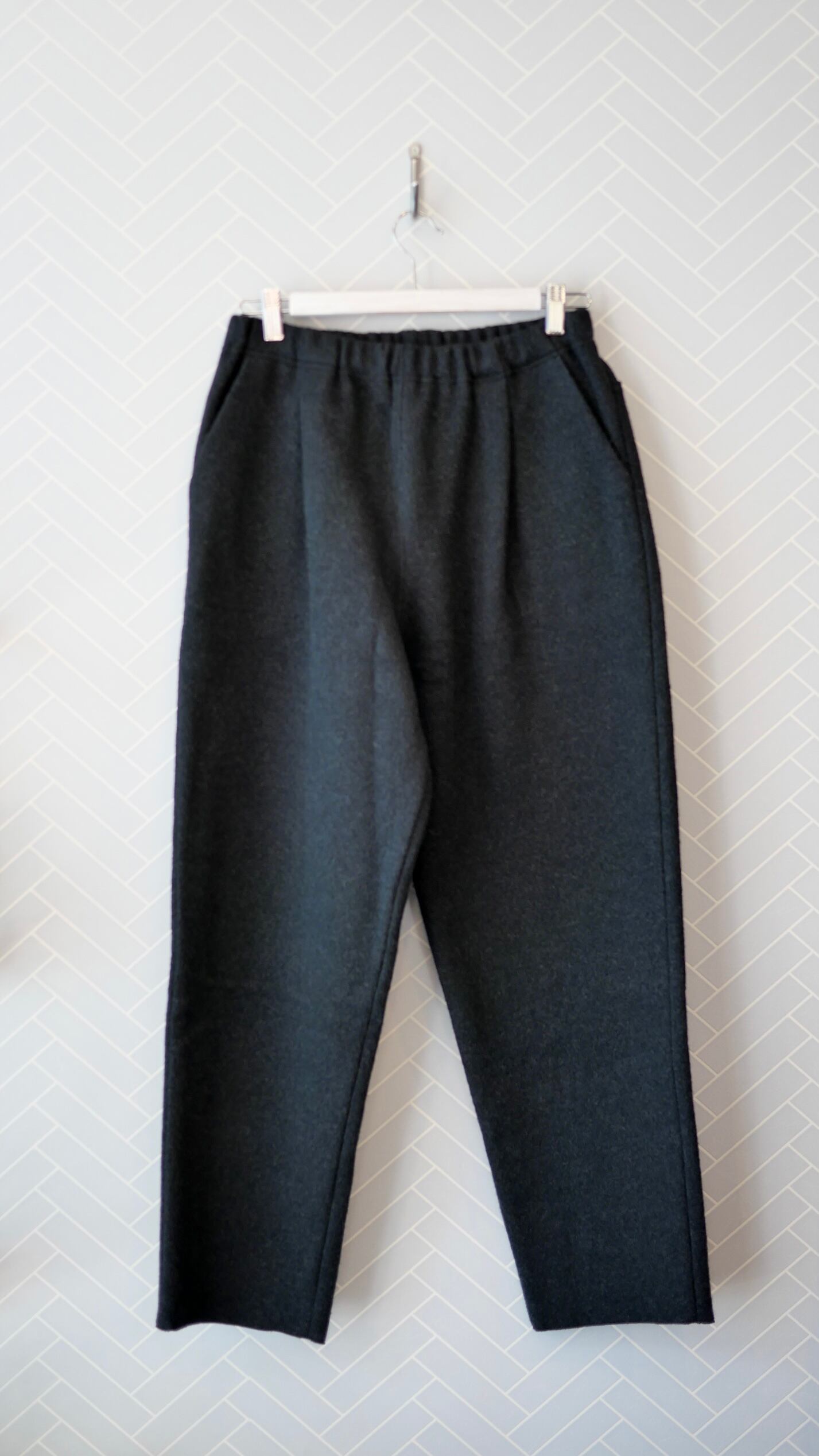 evam eva 冬の定番アイテム プレスウールシリーズからフルレングスタイプのウールパンツが新入荷しました。しっかりと厚みがある暖かい圧縮ウールを使用しています。