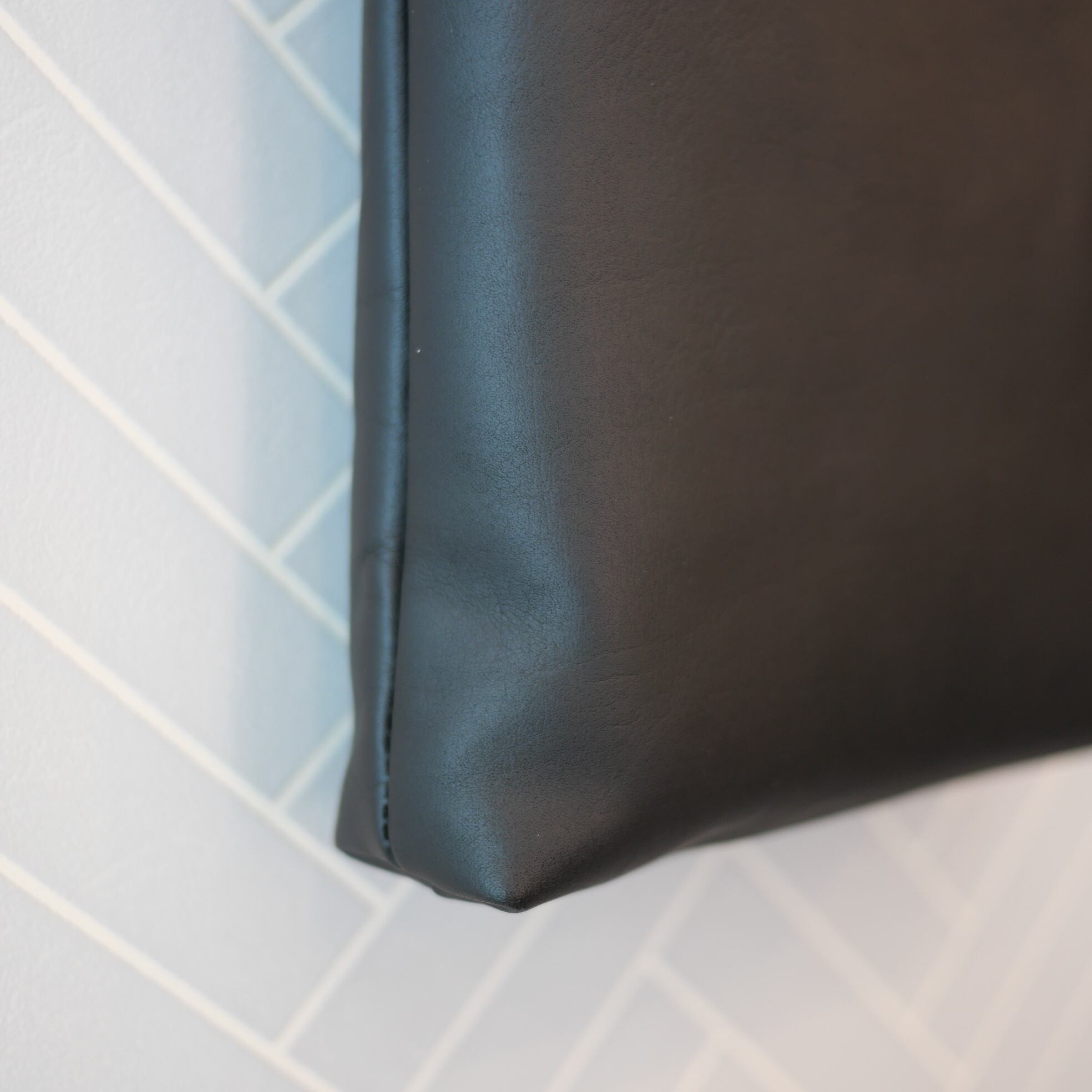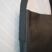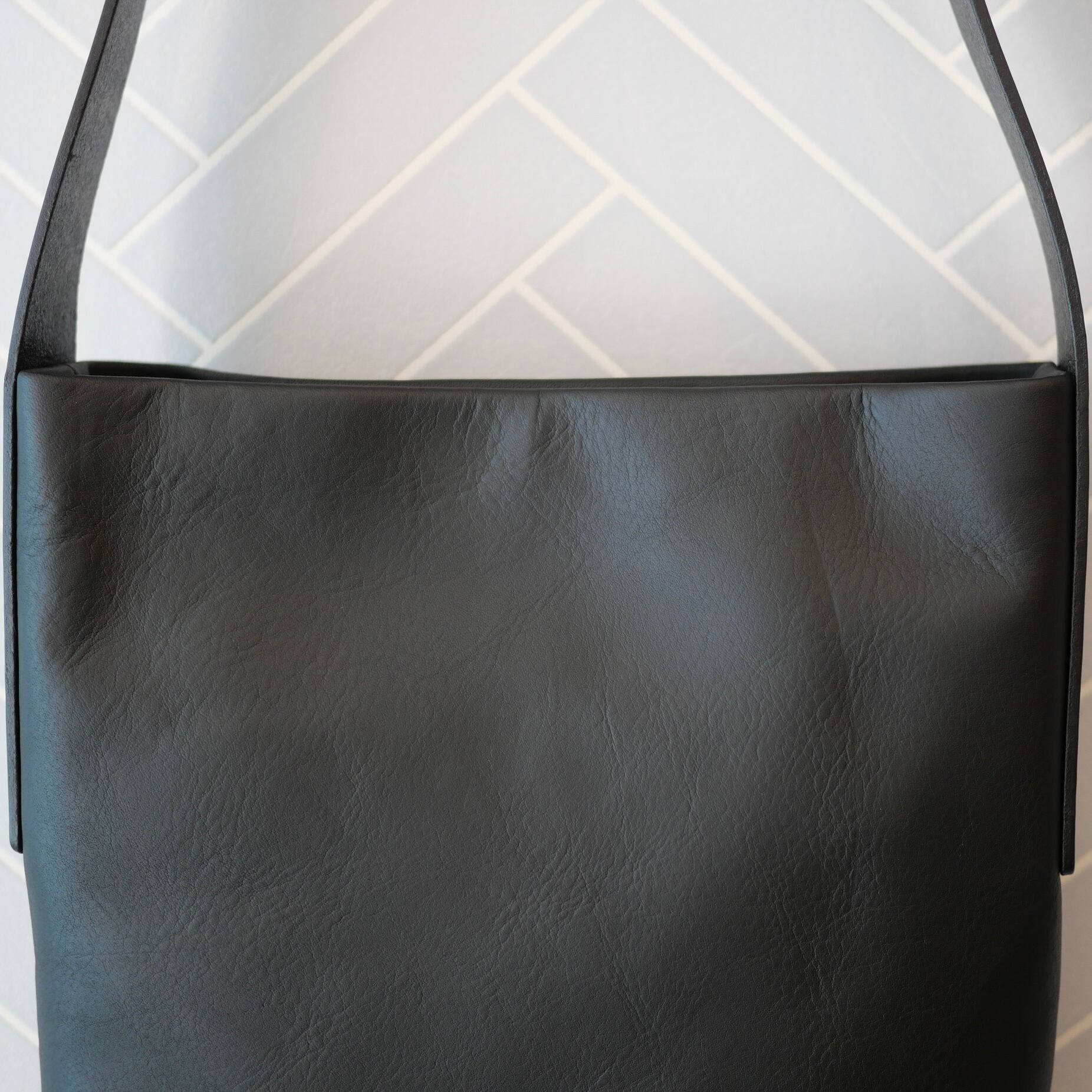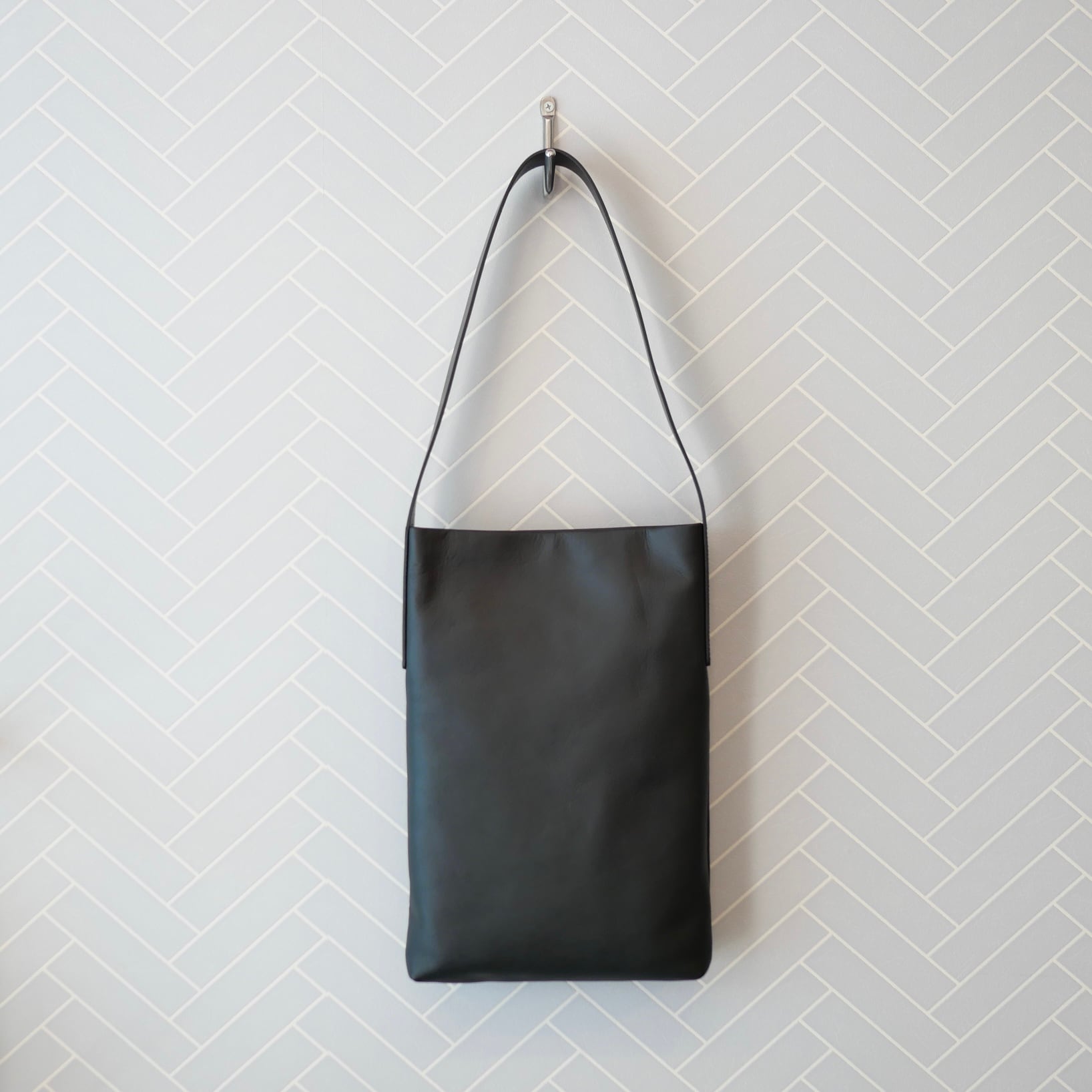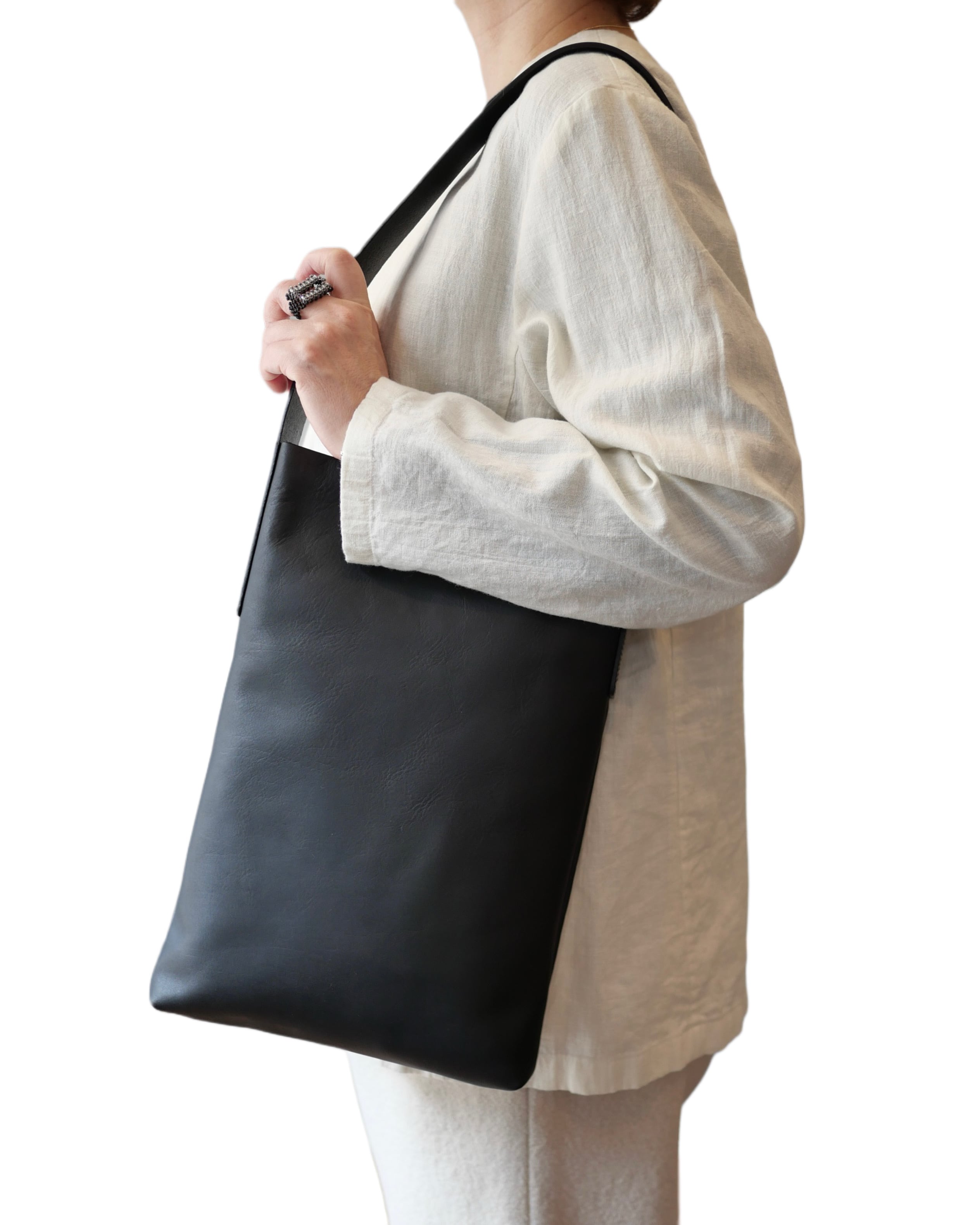 evam evaオリジナルのレザーバッグ。縦長のすっきりとしたシンプルなシルエットに、持ち手は肩掛けしやすいよう程よい長さと幅があります。男女問わず使用できるミニマルなデザインです。