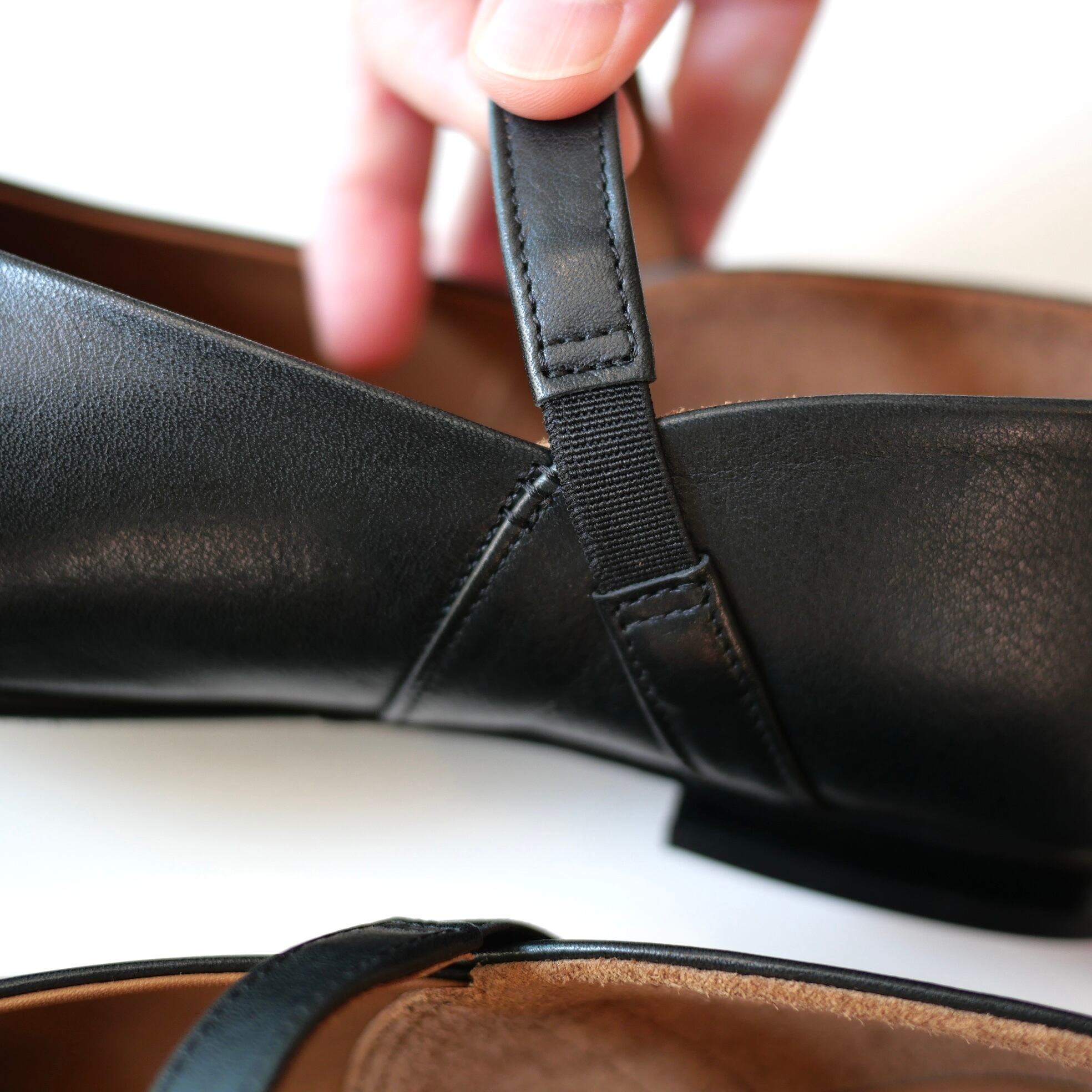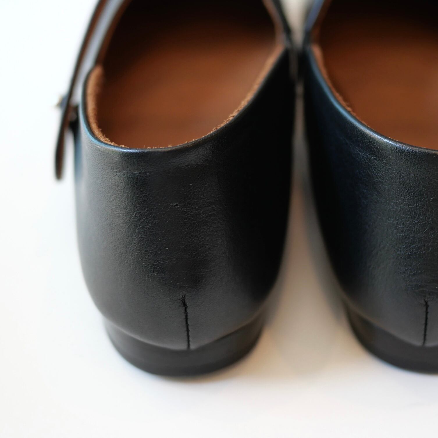 甲の深さは浅すぎず深すぎず、甘くなりすぎないラインです。つま先には芯が入りしっかりと、踵は履きやすいようにソフトな仕上がりです。足あたりが柔らかく優しい履き心地です。