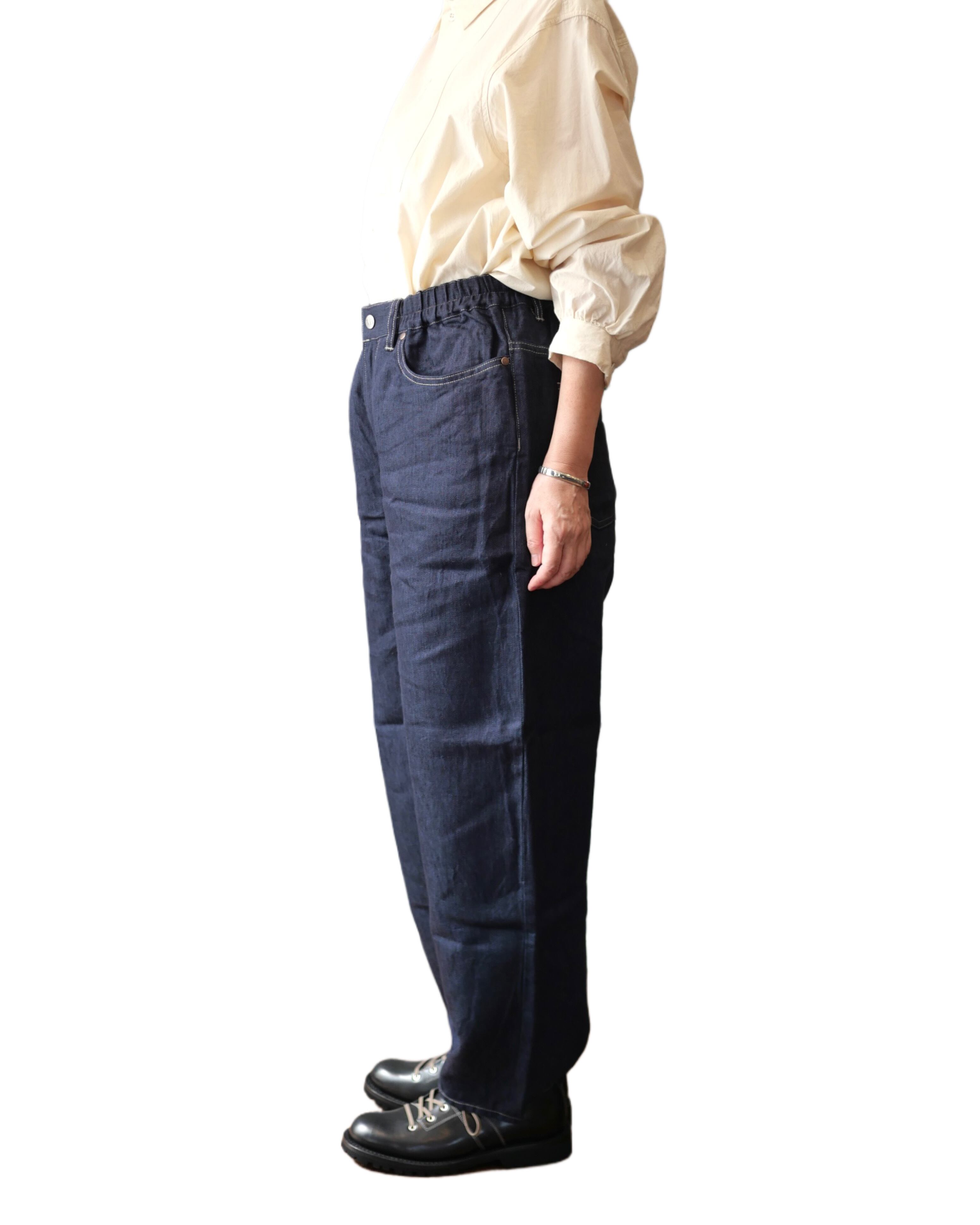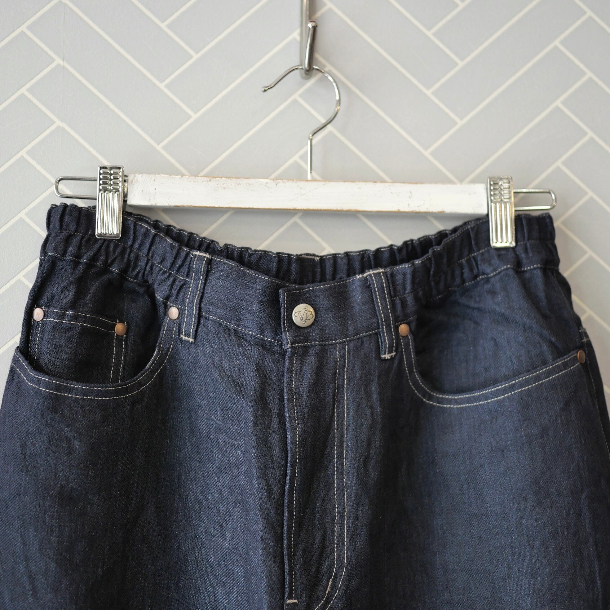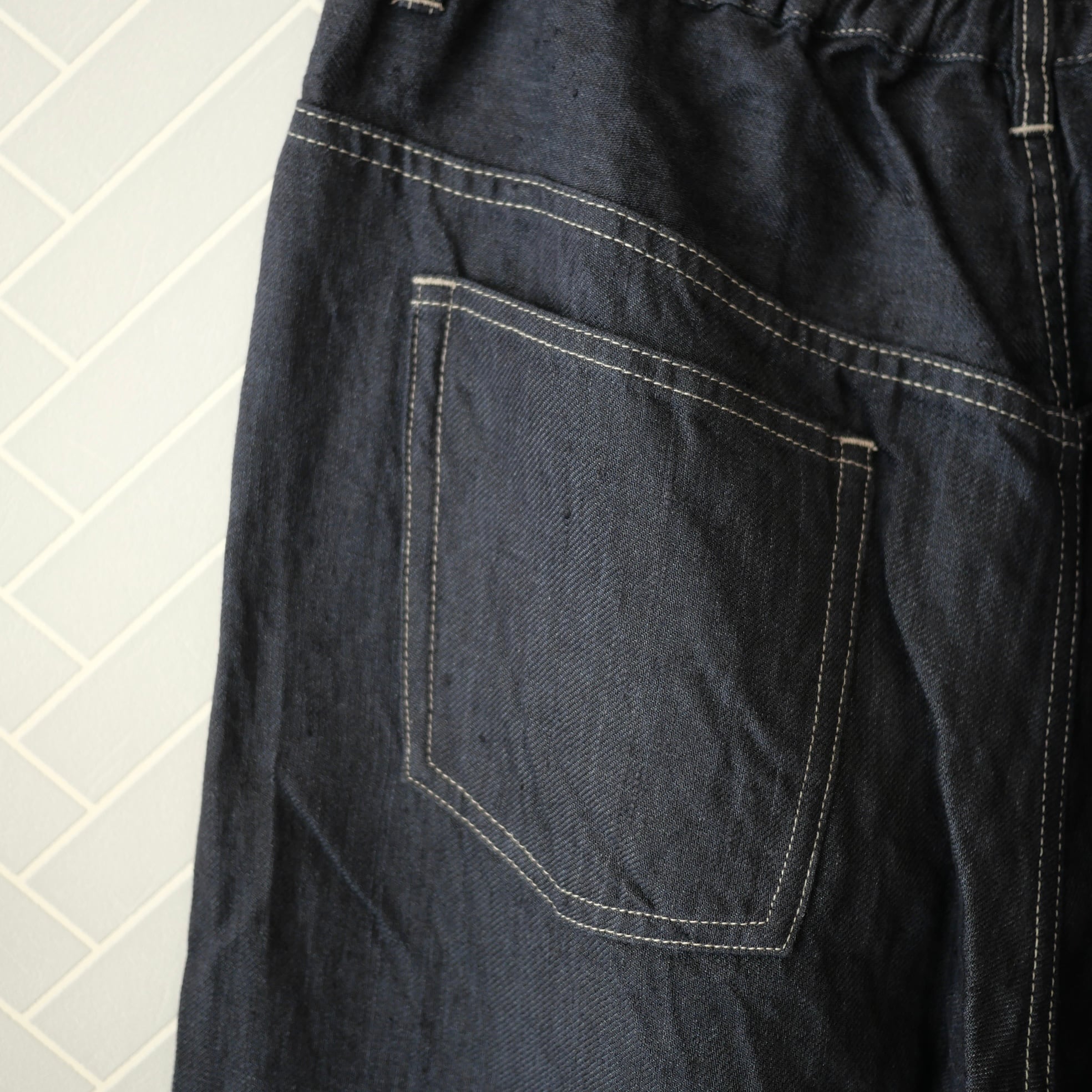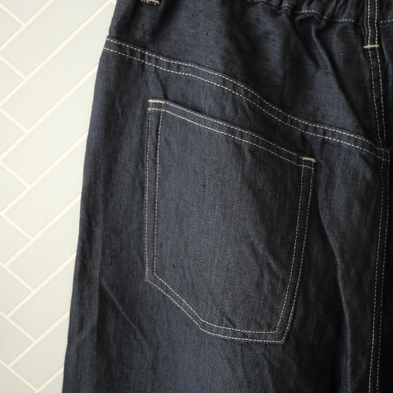 やや緩めな履き心地で、リネン100%ならではの滑らかな肌触りのデニムパンツです。ウエストはサイドのやや前めからゴムが入っていますので、締めつけが苦手な方も安心です。裾は足捌きがよくすっきりとしたシルエットのテーパードタイプです。