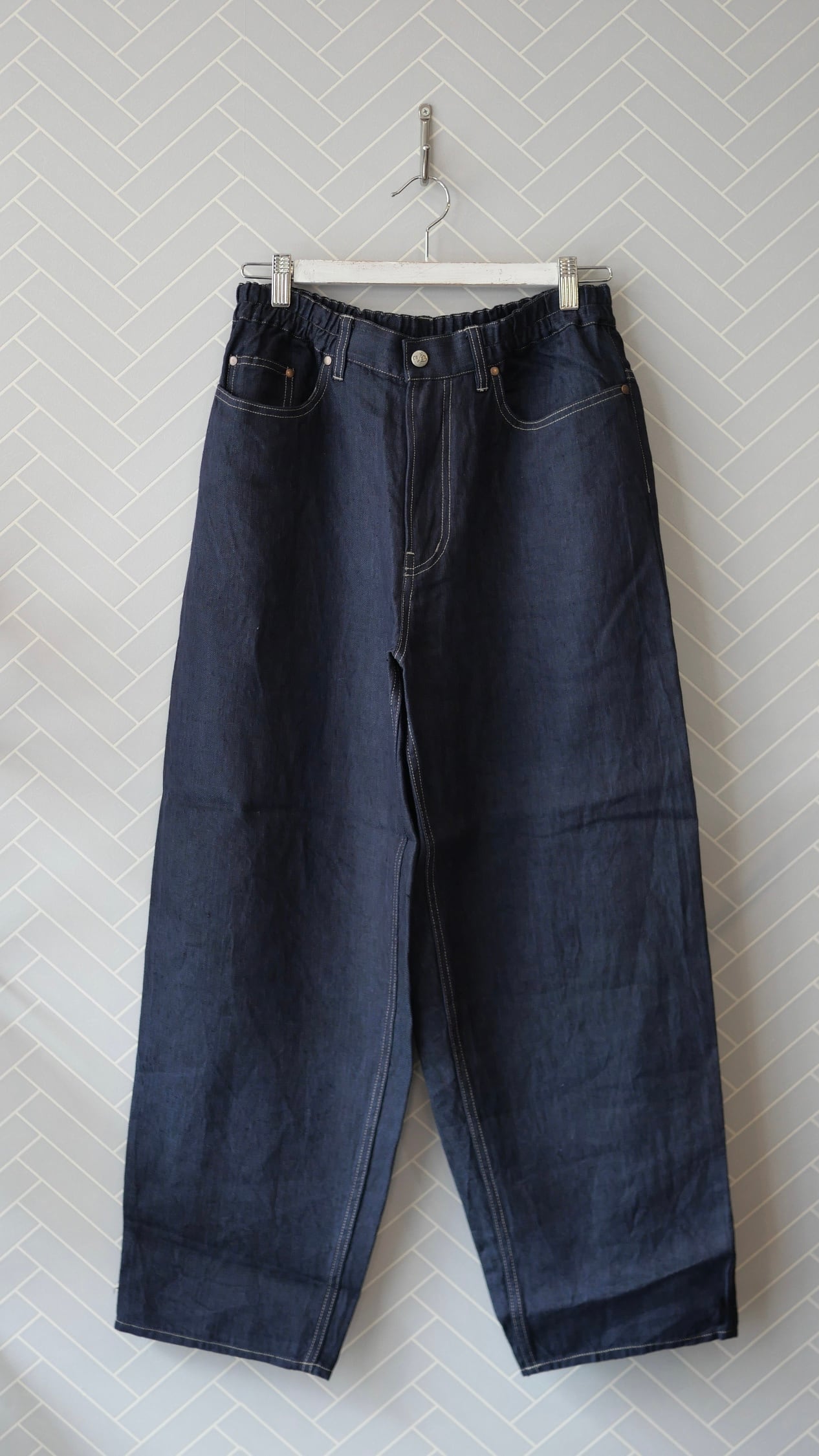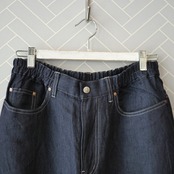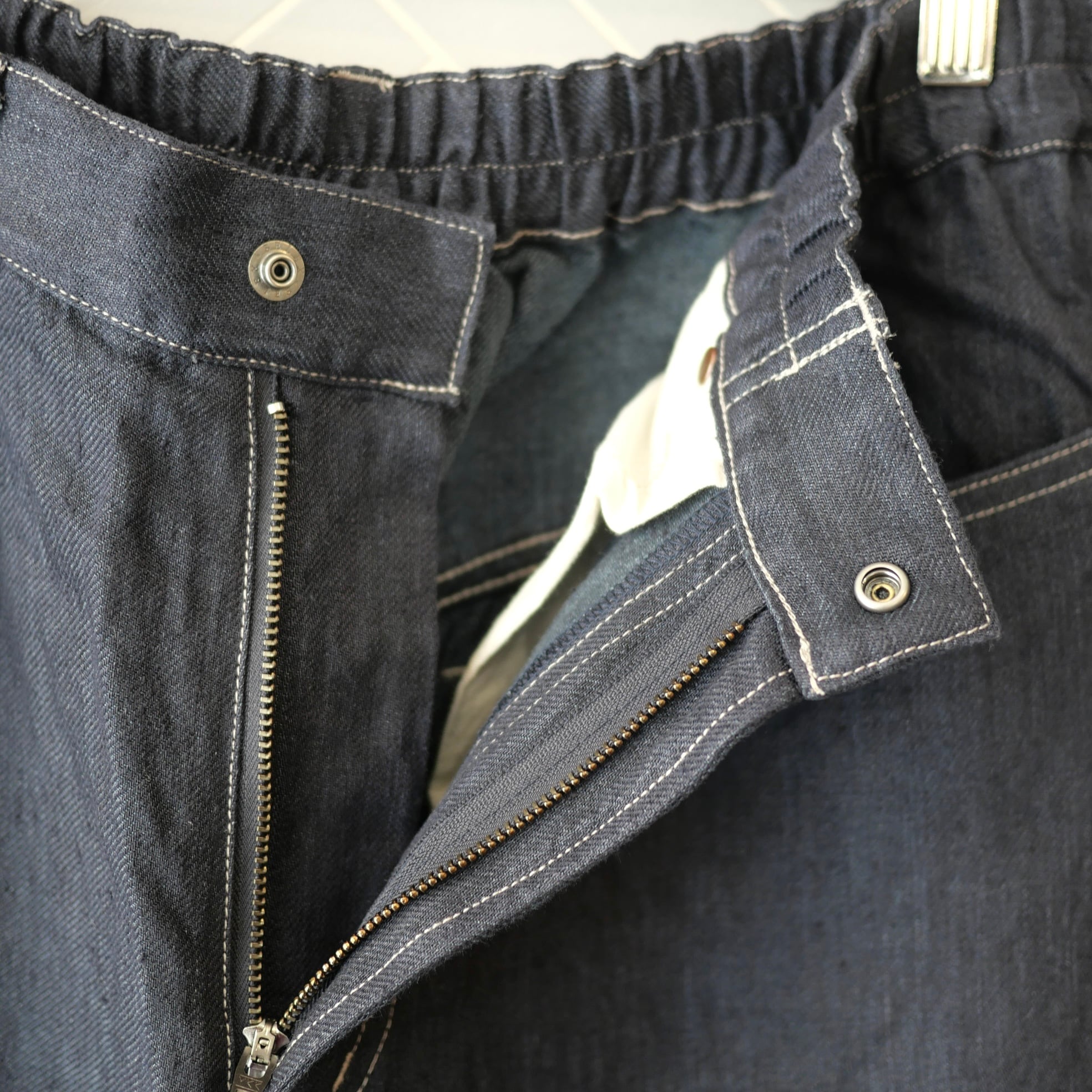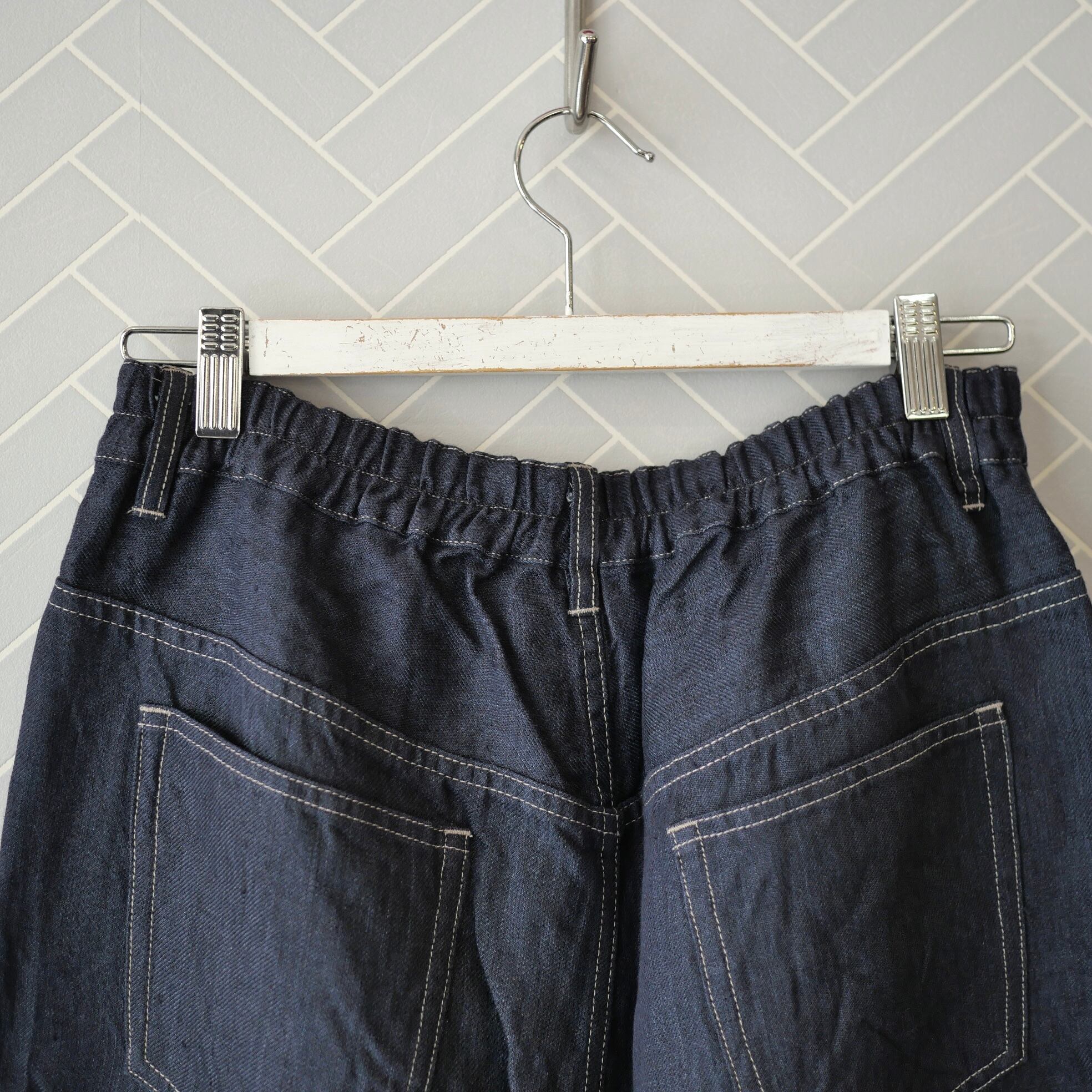 やや緩めな履き心地で、リネン100%ならではの滑らかな肌触りのデニムパンツです。ウエストはサイドのやや前めからゴムが入っていますので、締めつけが苦手な方も安心です。裾は足捌きがよくすっきりとしたシルエットのテーパードタイプです。