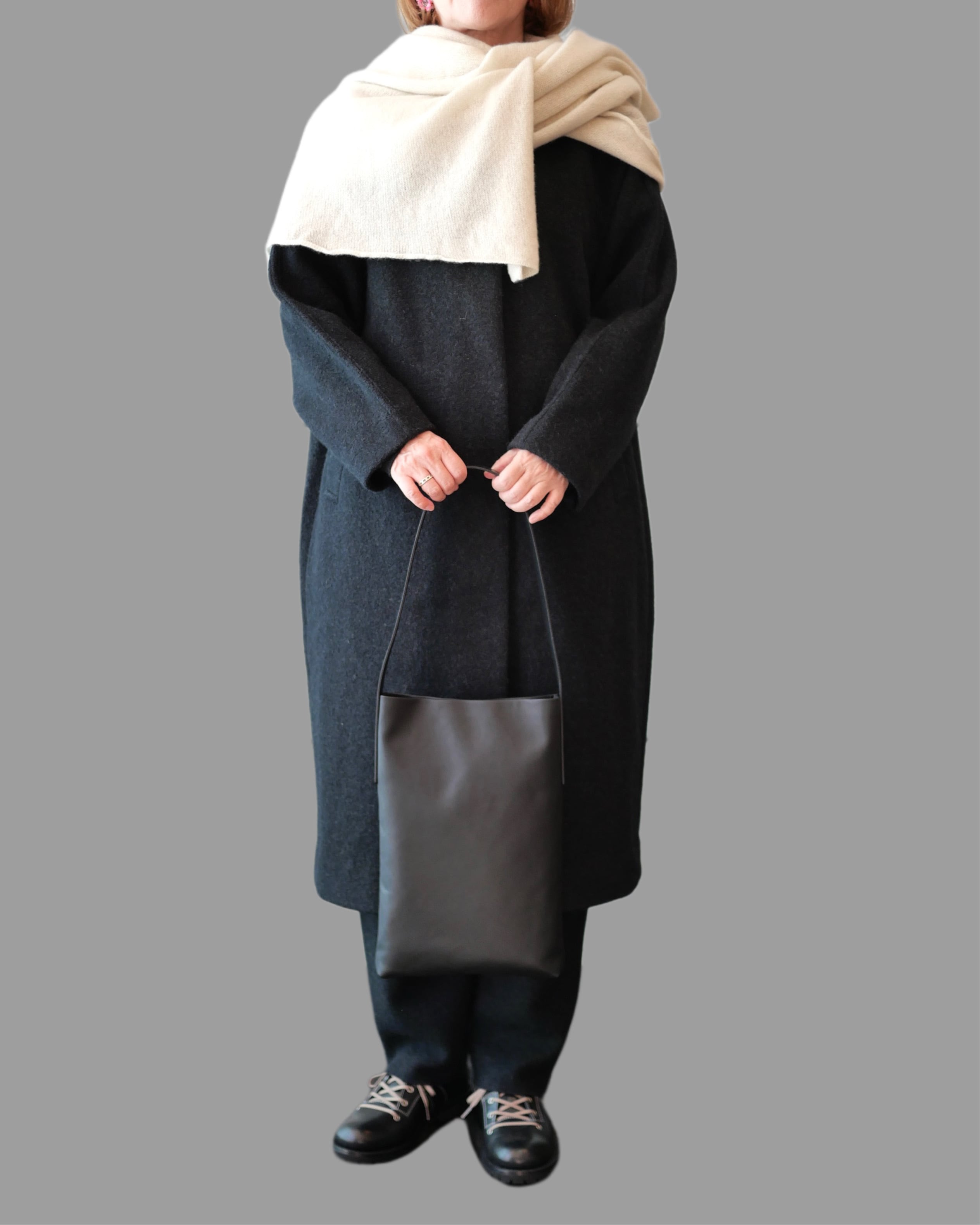 少し立ち上がったネックラインとゆったりとした長めの着丈が上品なロングコート。素材本来の風合いとあたたかさを感じていただけます。