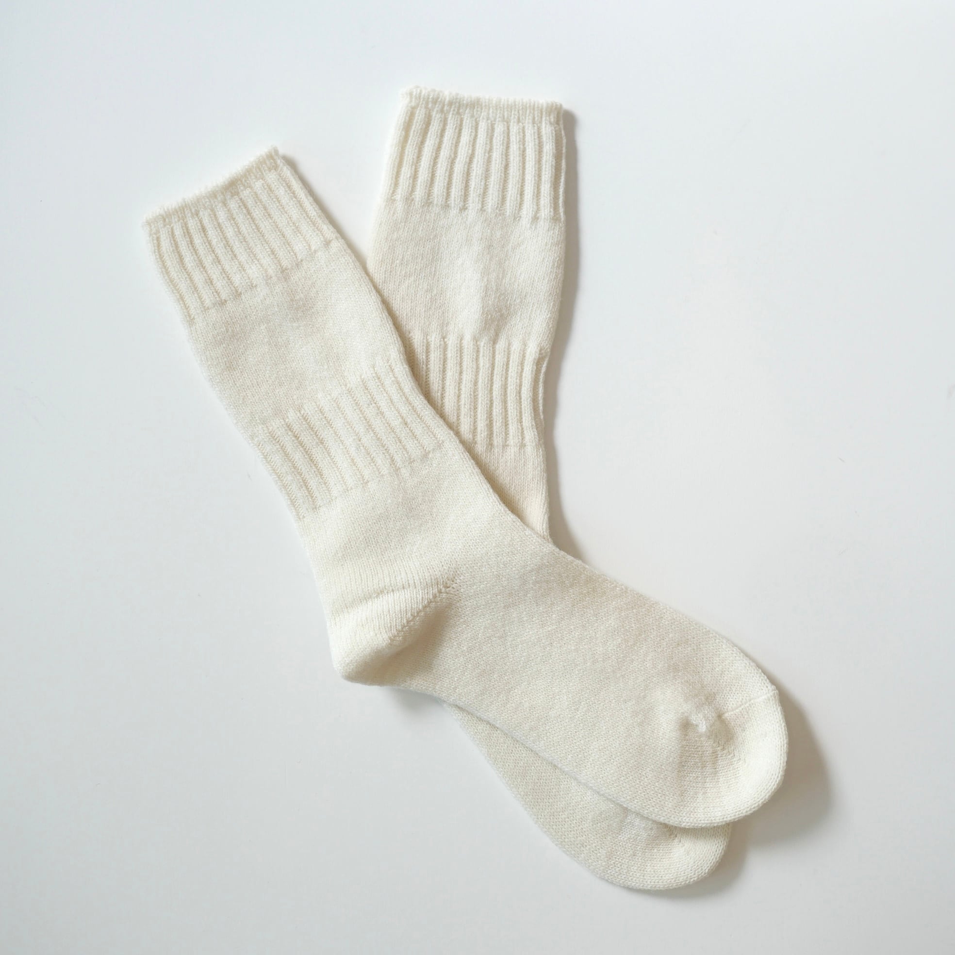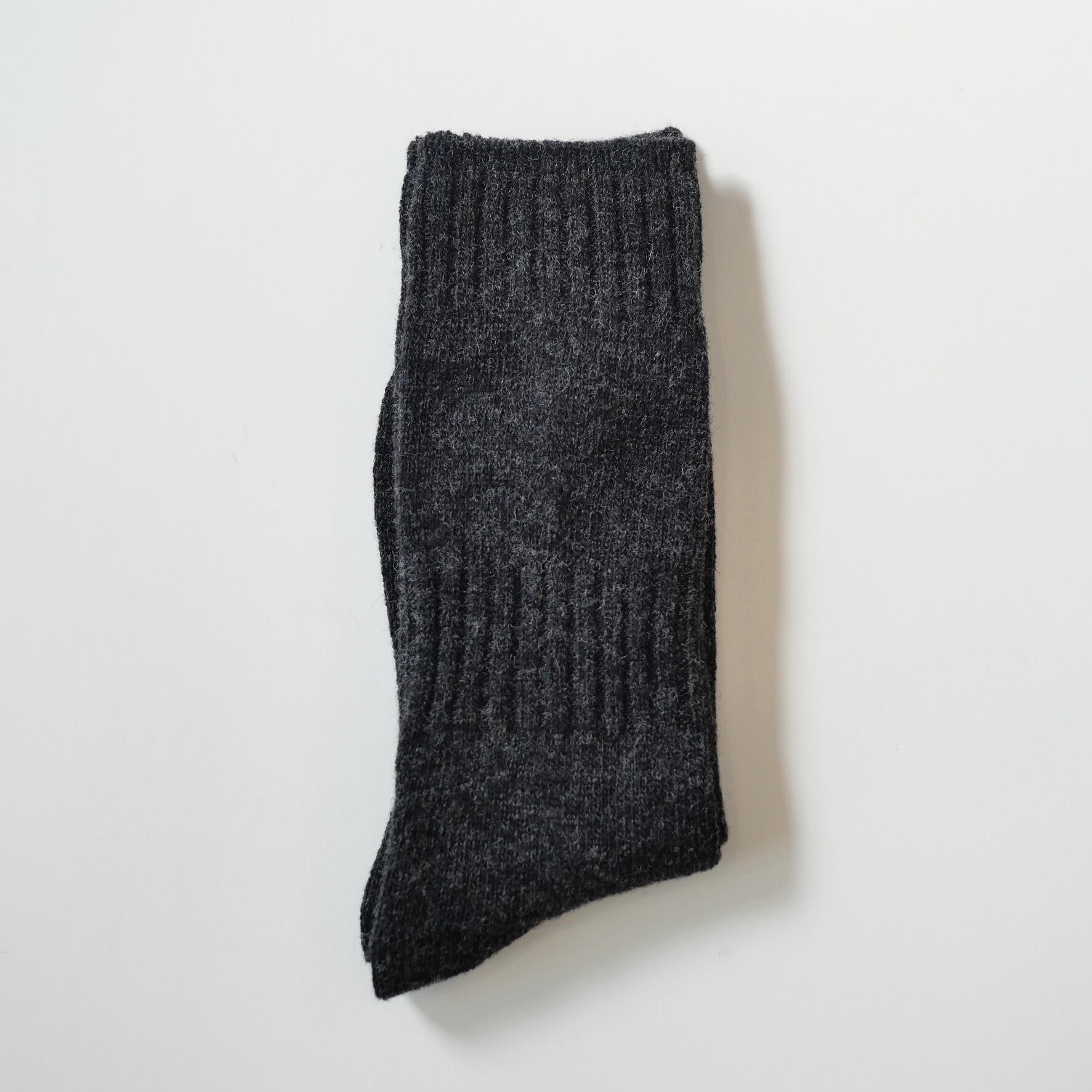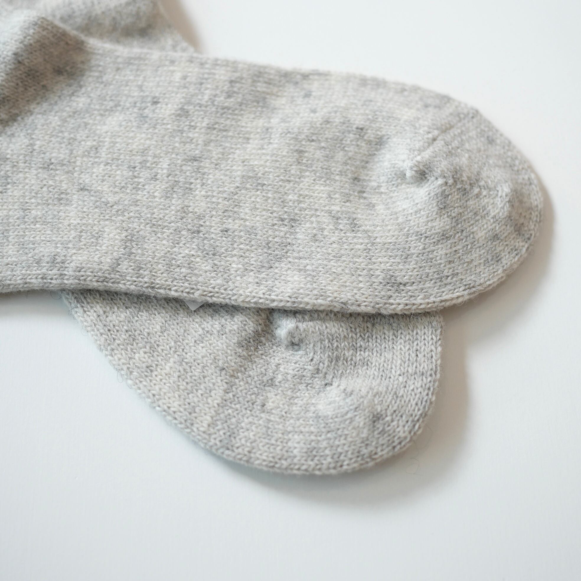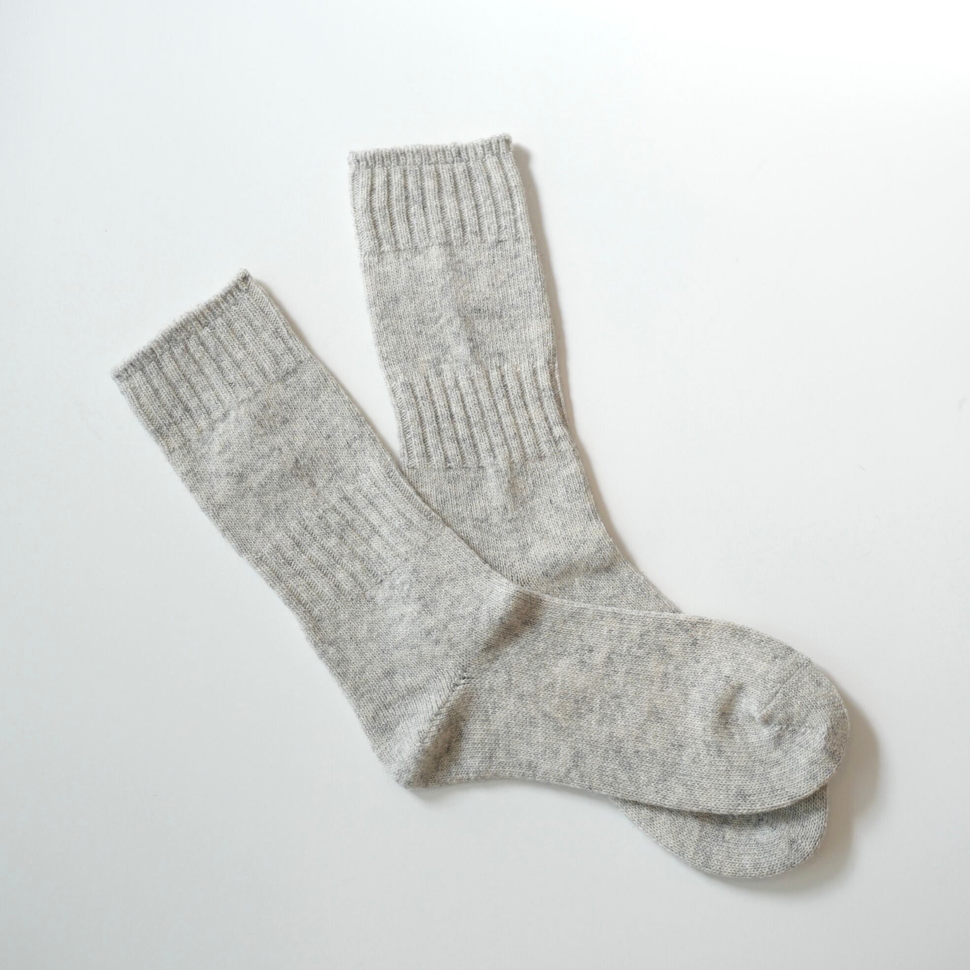 柔らかく軽やかなカシミヤ混の紡毛糸を使用しています。太めの糸で編み上げた程よい厚みで、リブ編みが優しく足にフィットし、足先までしっかりと温めてくれます。