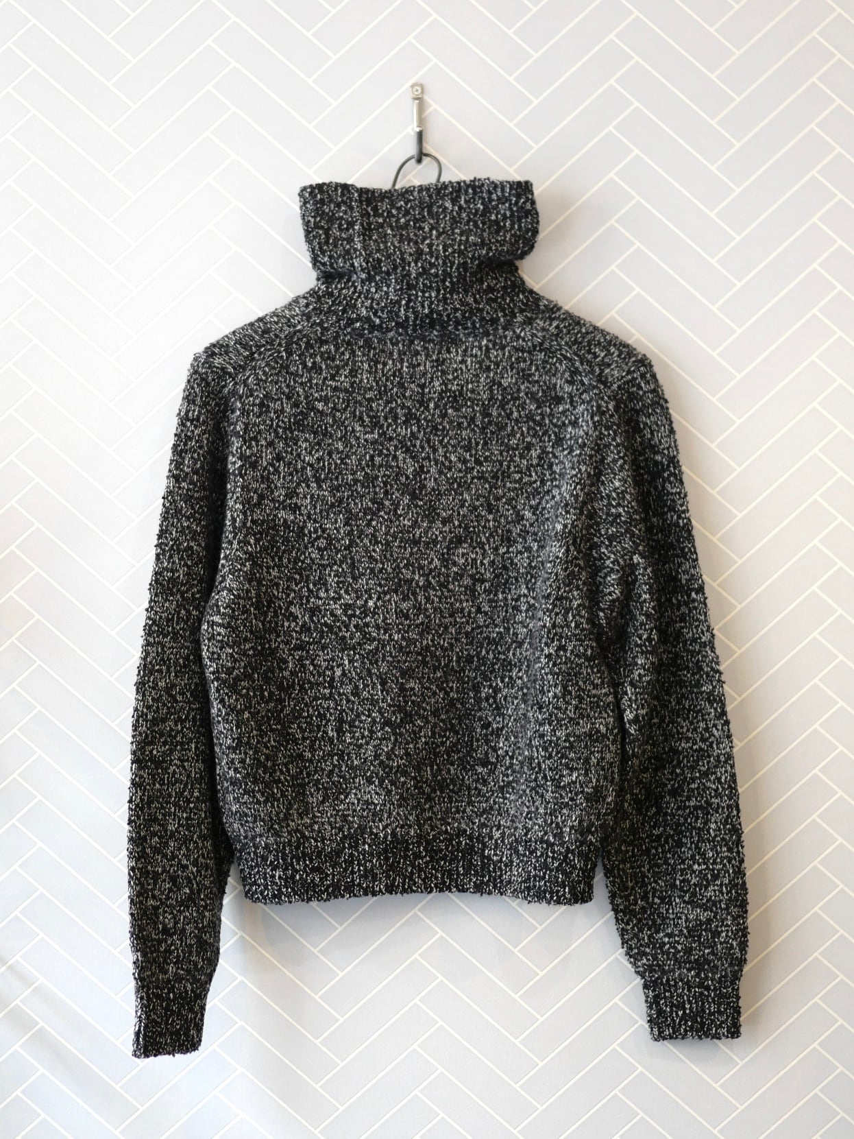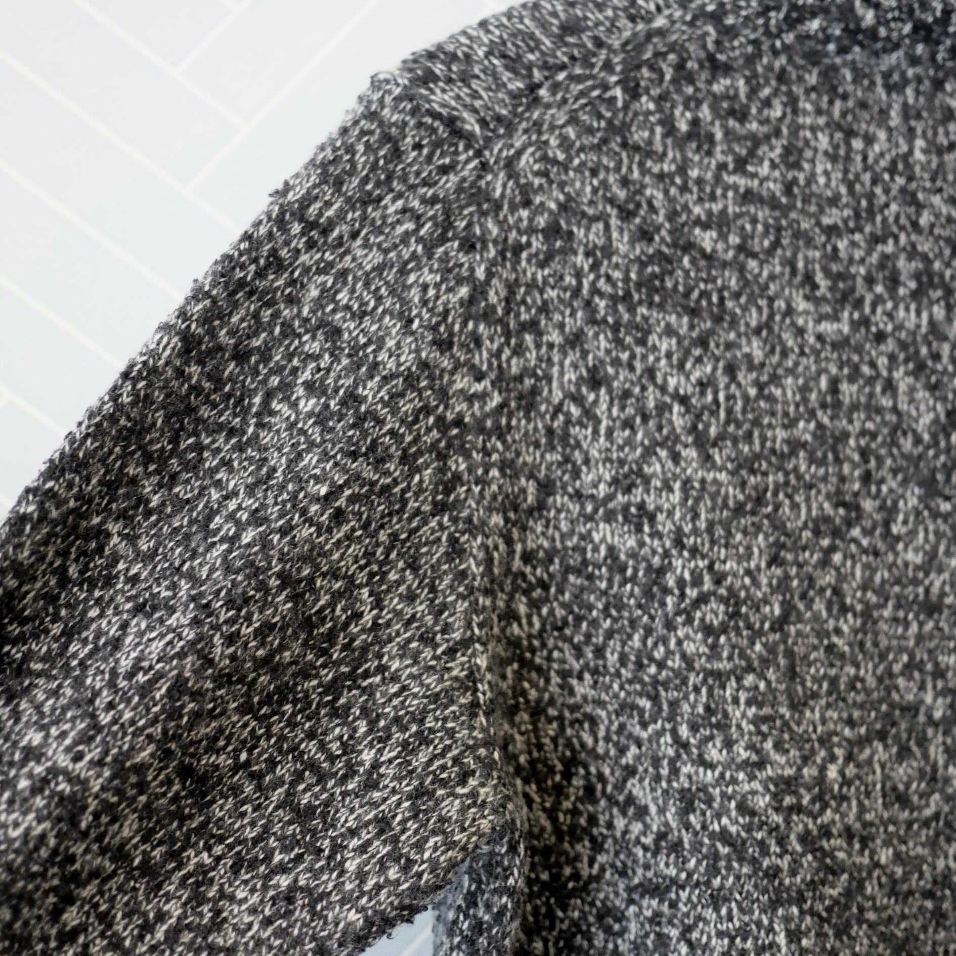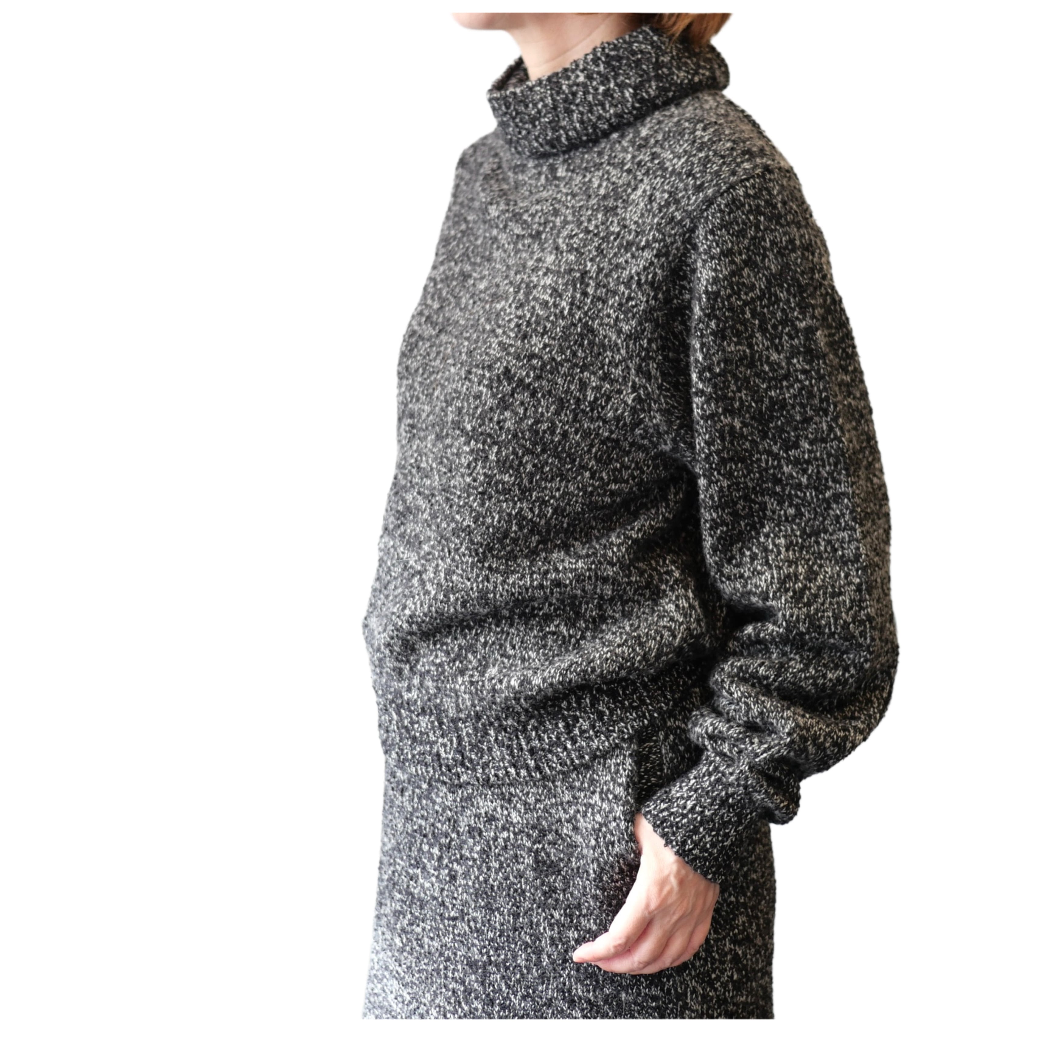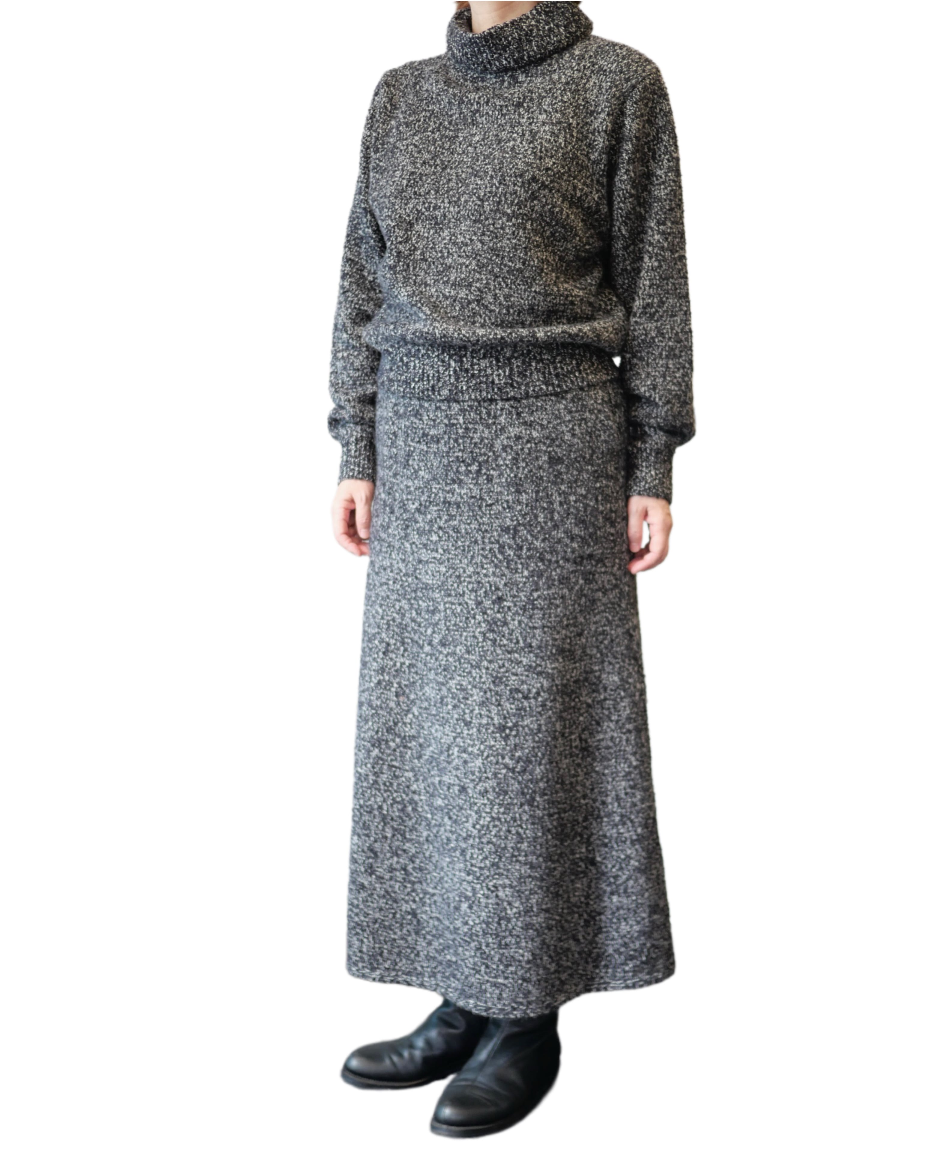 柔らかな質感の綿とカシミヤ、シルクをミックスしたオリジナルヤーンを使用。素材の持つ光沢やしっとりとした質感、形状のバリエーションからなるダイナミックなメランジカラーが特徴です。国内紡績でつくられた強撚シルク糸、最高品質のカシミヤ糸、スーピマ綿を使用しています。同素材のスカートもあります。