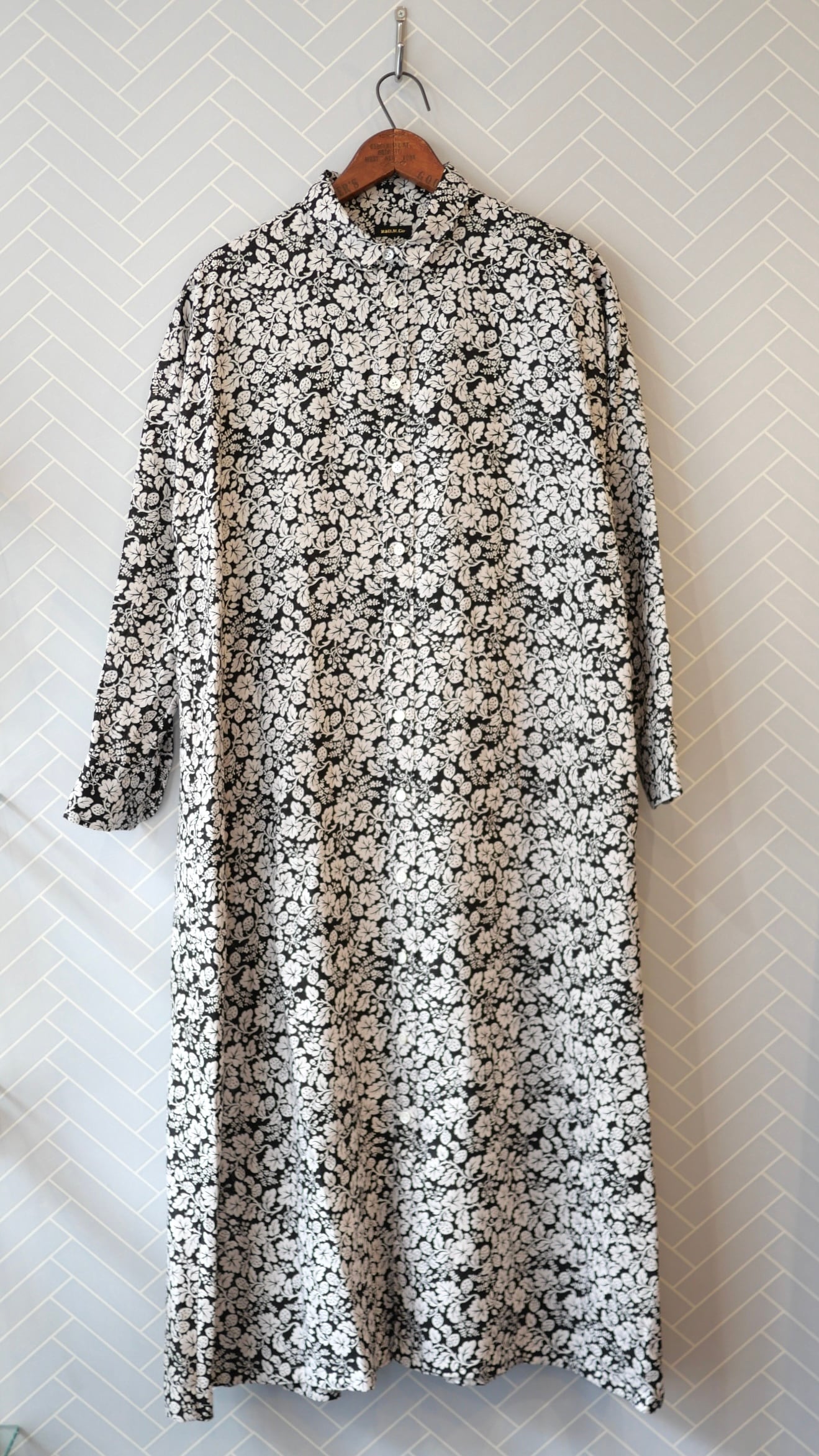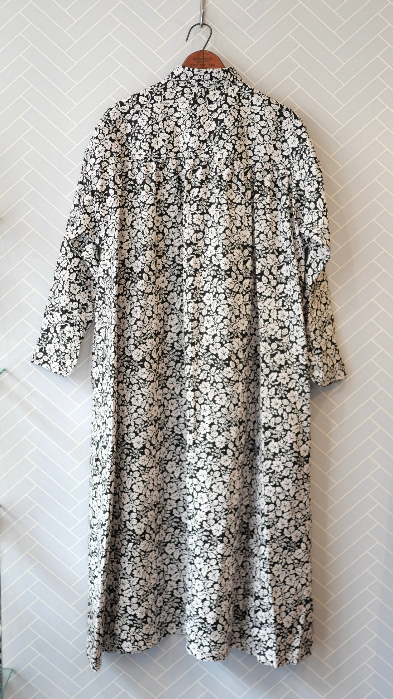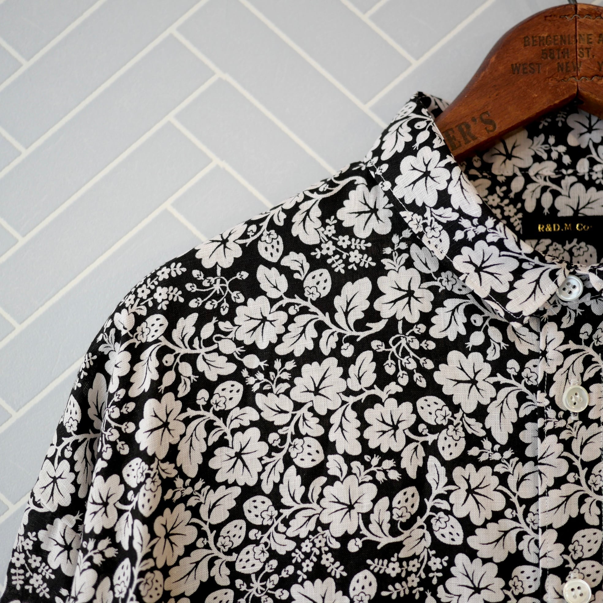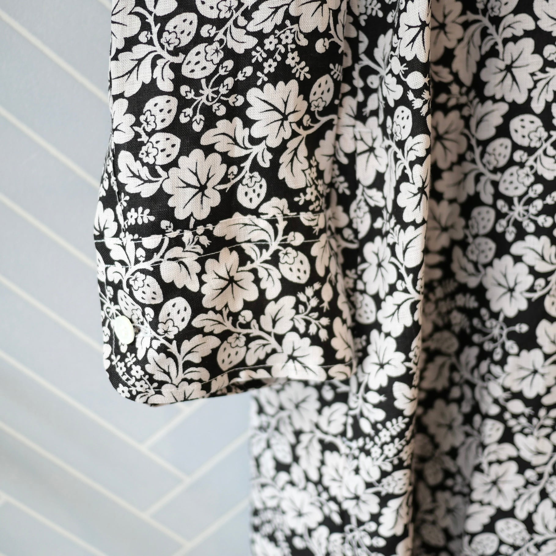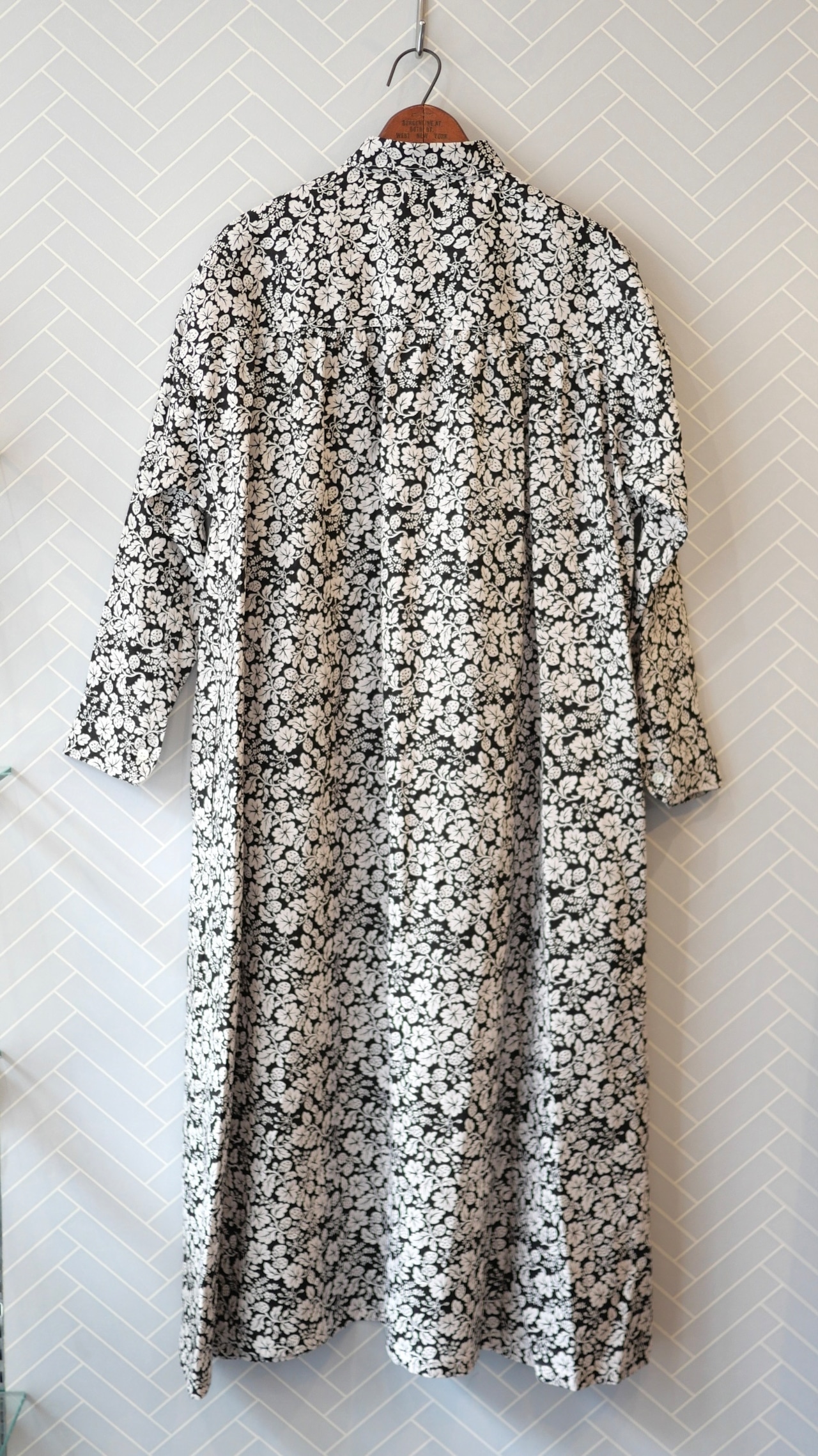 R&D.M.Co-の人気柄ワイルドベリーのリネン生地を使ったロングシャツドレス。一枚で映える大人らしいワンピースです。またボタンの前開きなので羽織としてもお使い頂けて大変便利です。小さめの襟が可愛い。