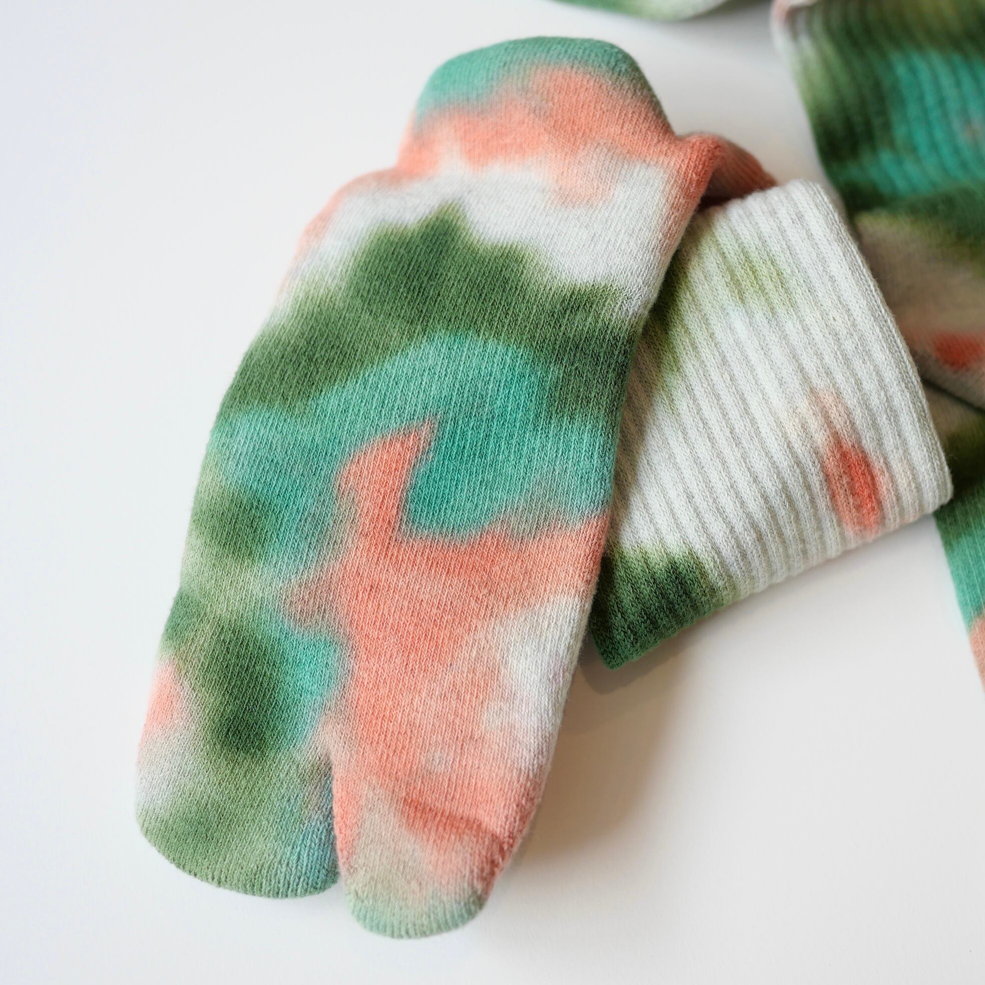 あえて白ボディではなくオートミール杢をボディに使用することで、鮮やかなタイダイの色彩を活かしつつ、落ち着いた質感を表現しています。