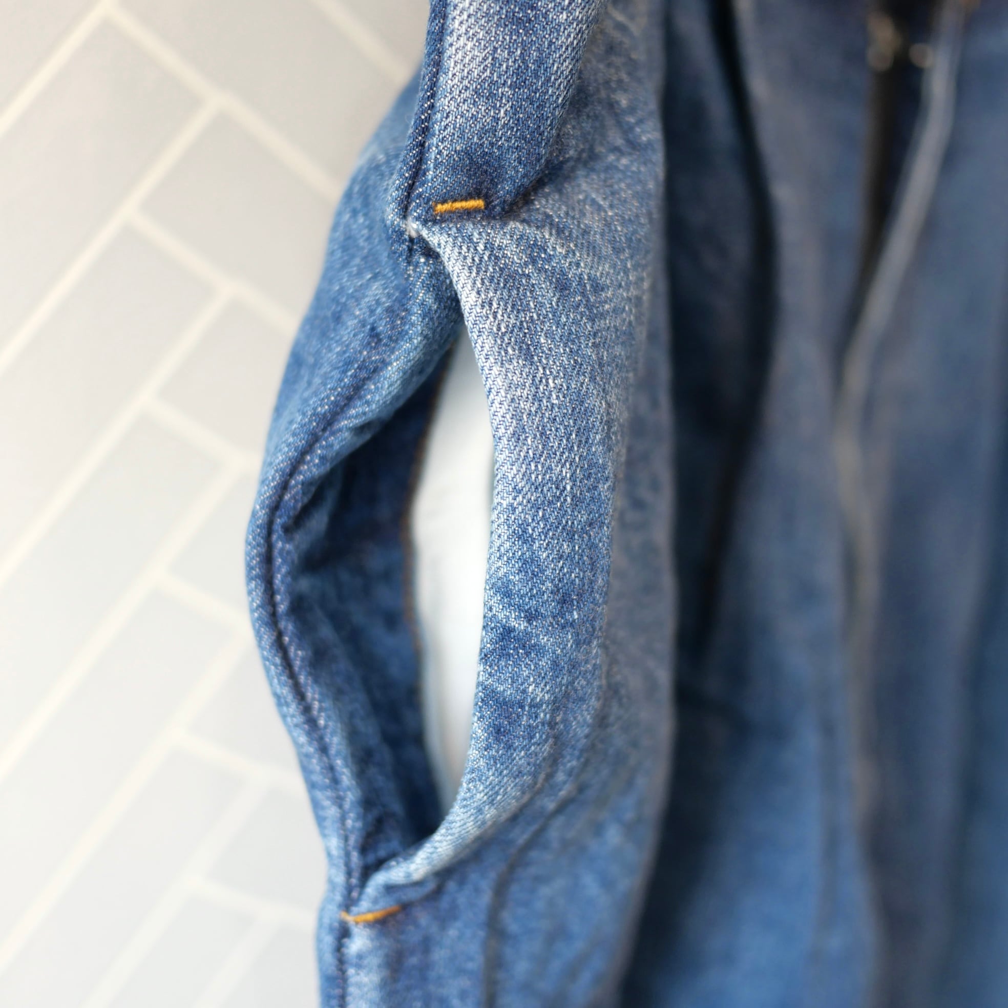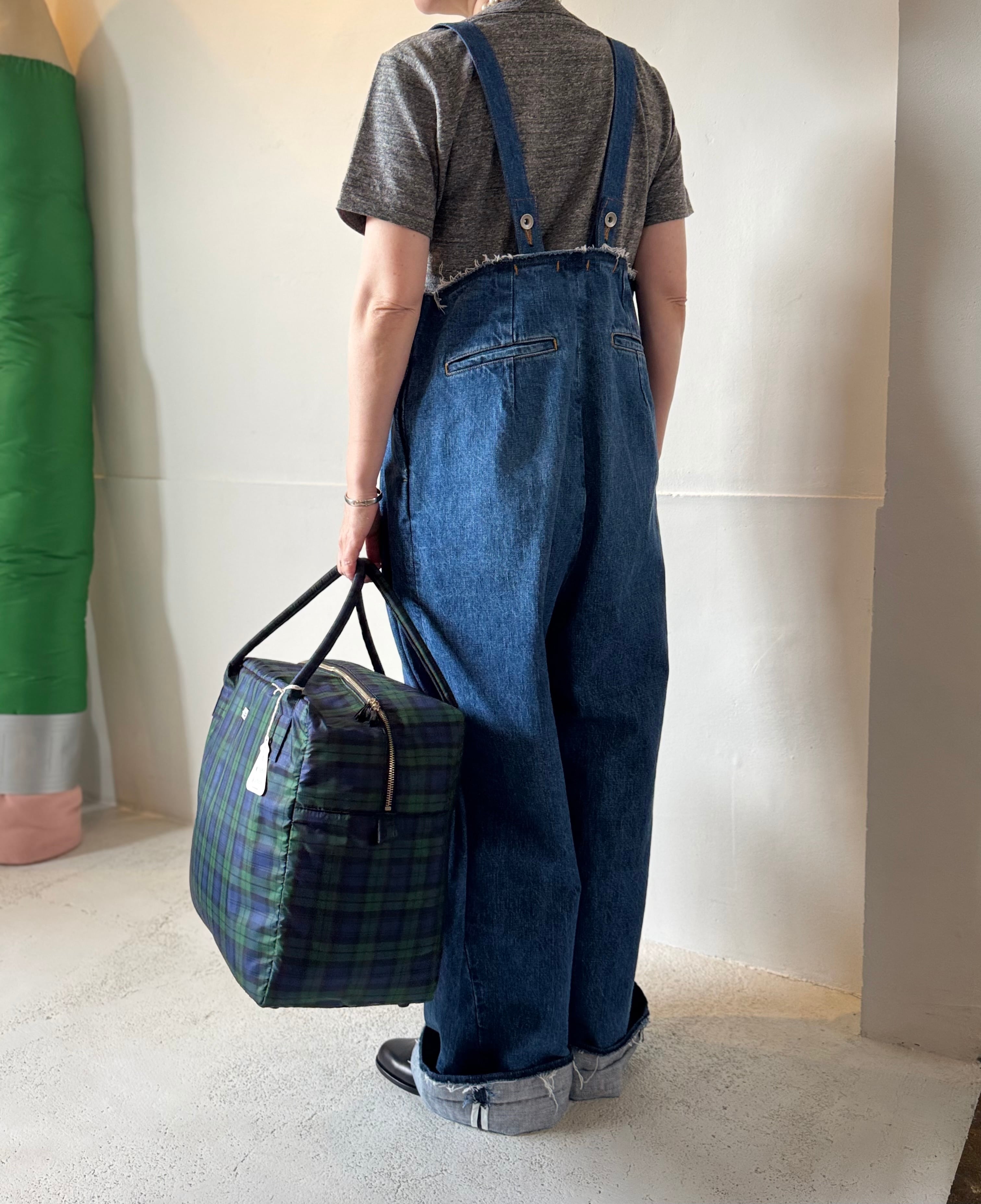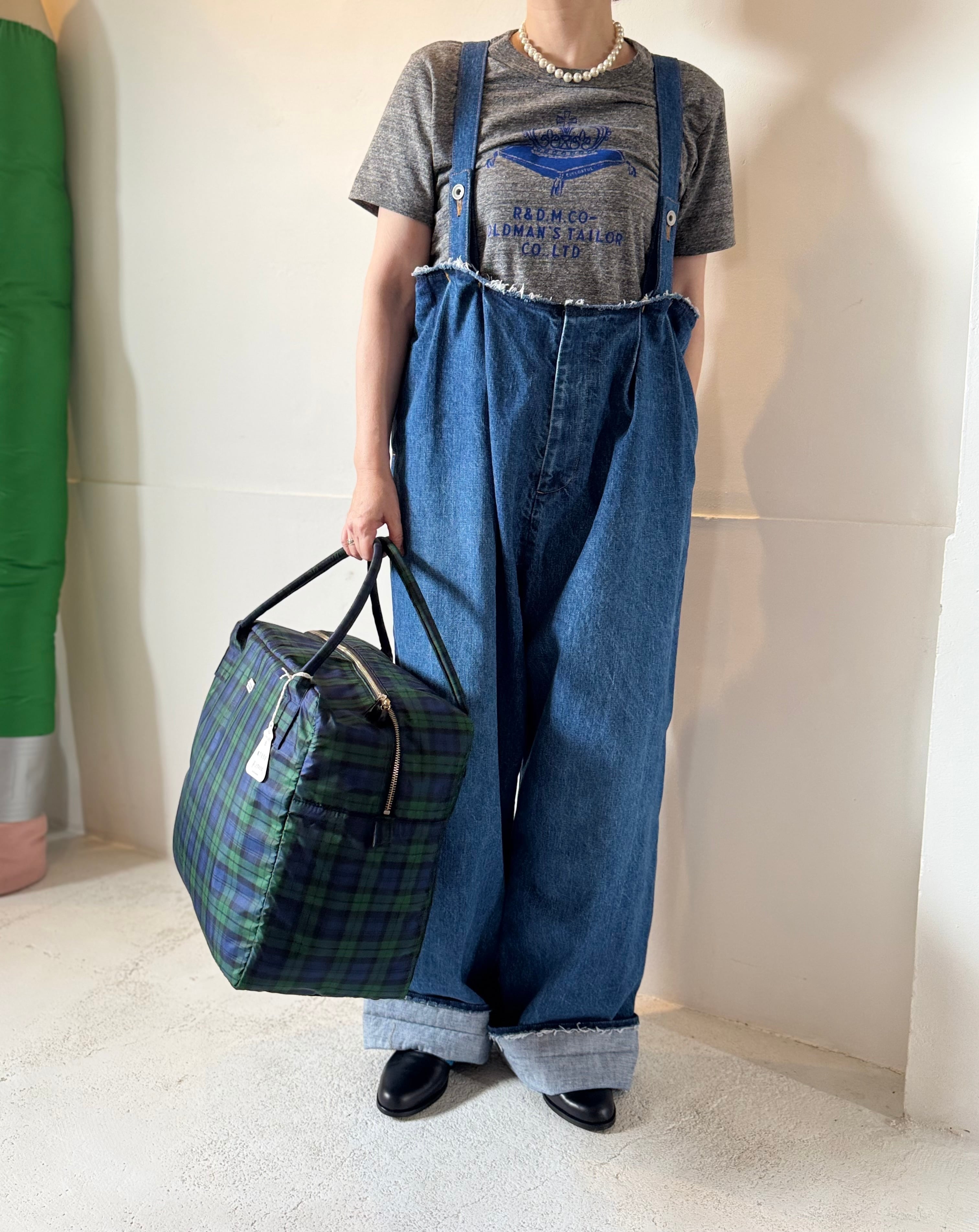 ヴィンテージデニム素材のサスペンダーパンツ。好評のバギーパンツのシルエットをサロペットとして再構築した新デザインです。身幅にゆとりがありますので、どなたでもお使いいただけます。サスペンダーの長さはボタンで変更できます。