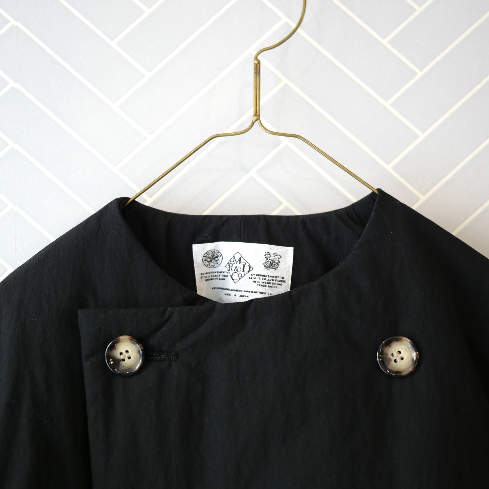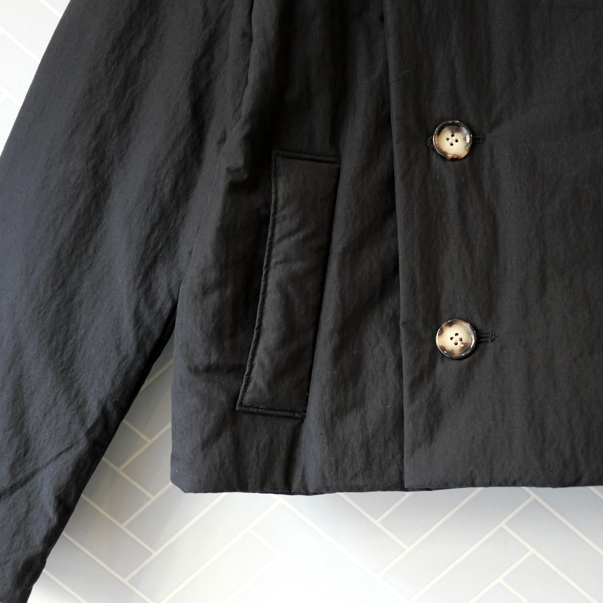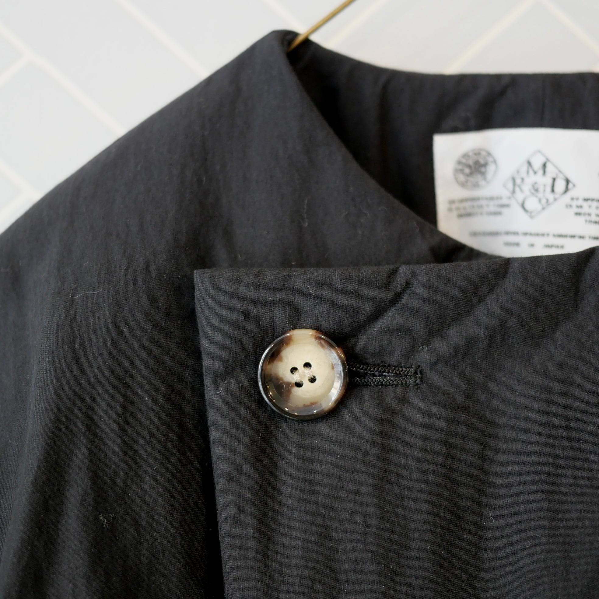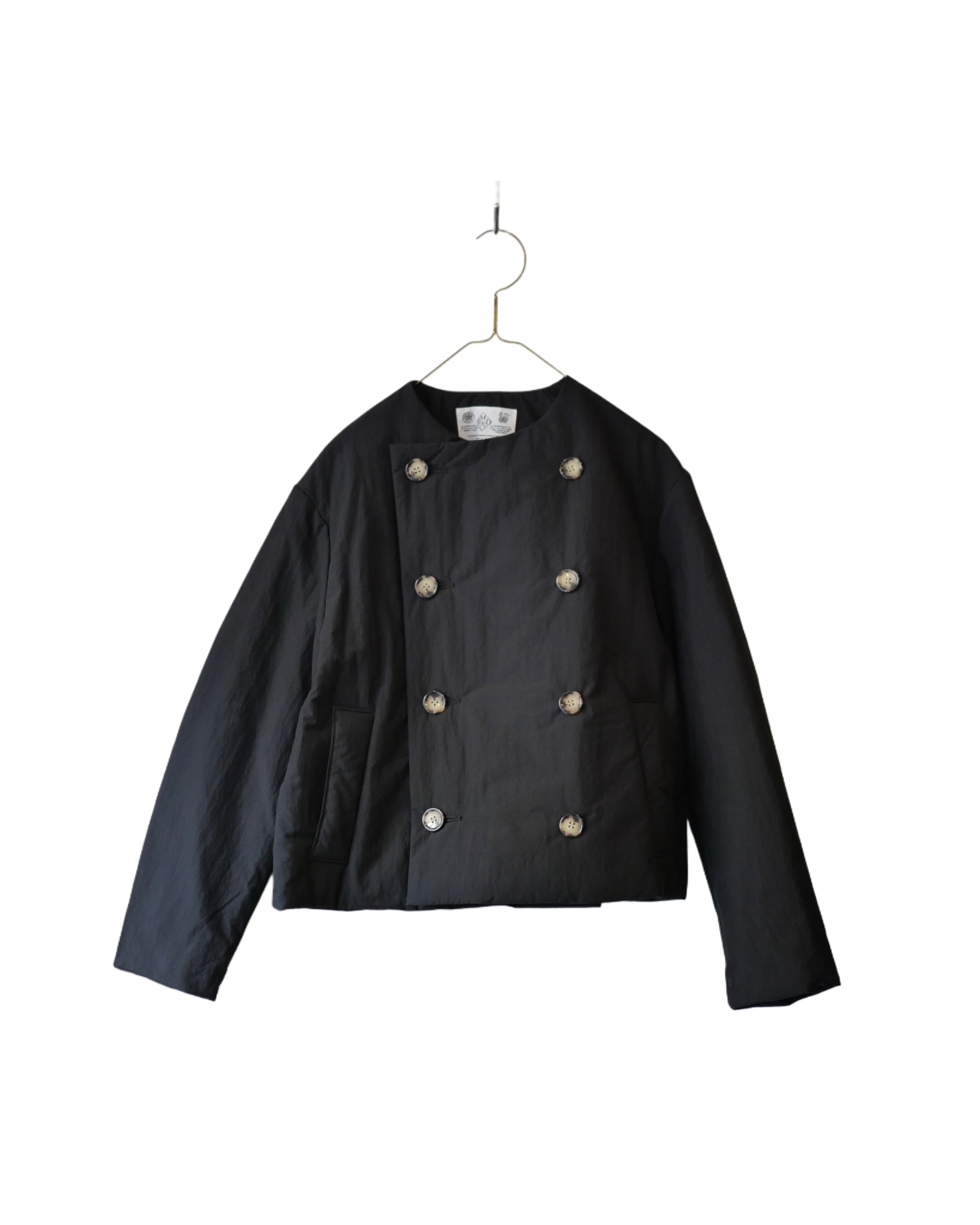 中綿の暖かいパフコート。何より軽くて着やすい軽い布団のようなコートです。ノーカラーでダブルのボタン付きなのでマフラーなどの巻物や、ハイネックなどで遊べます。ウォータープルーフ加工が施されていますので、水や汚れに強く日常使いに最適です。