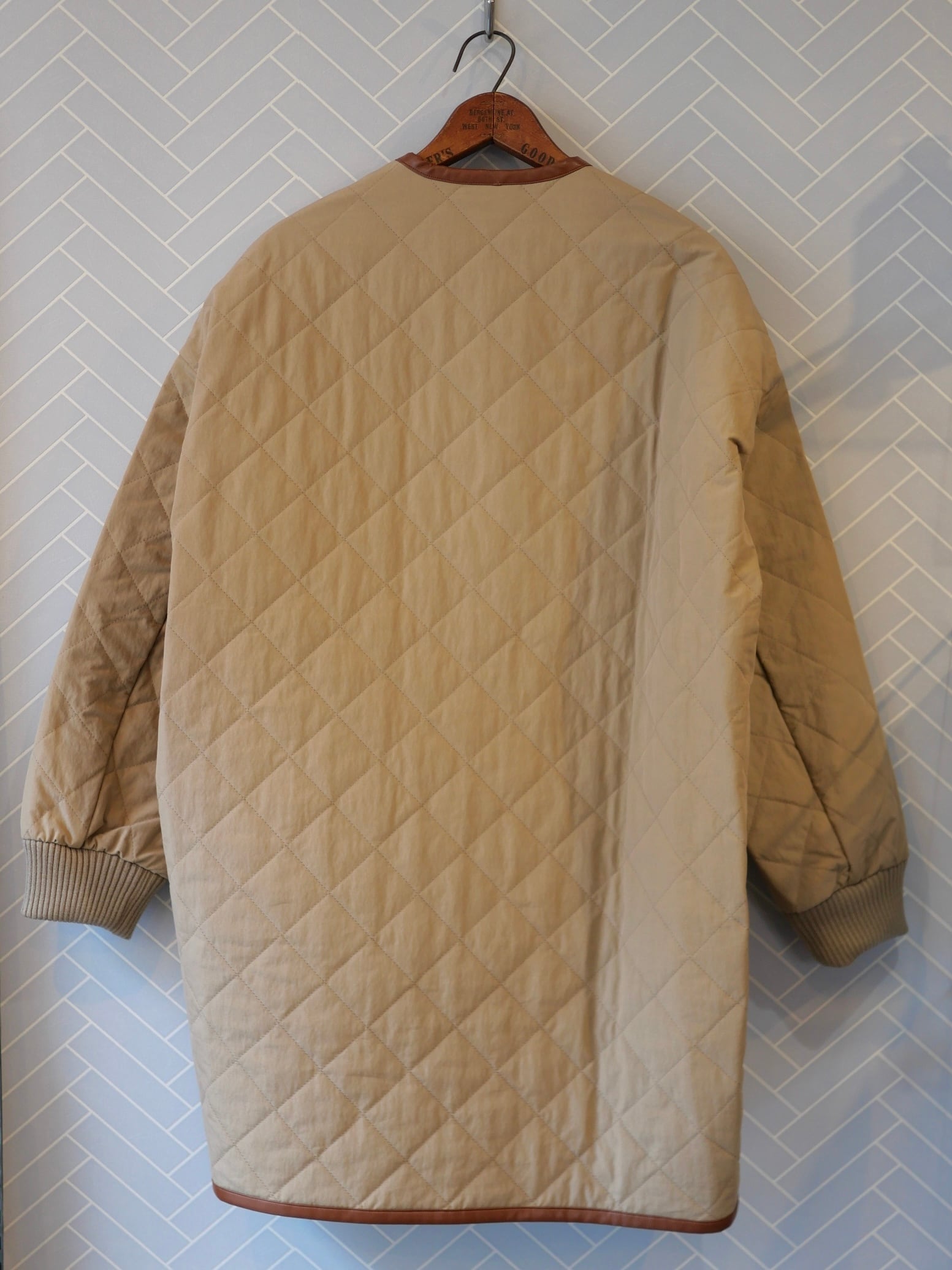 R&D.M.Co-定番のキルティングコート。人気のハーフサイズはゆったりシルエットで可愛いデザインです。ボトムもパンツ、スカートどちらも合わせやすく色んな方に着ていただけるコートです。軽くて肩も凝らない着心地が人気の理由。毎日来ていただける暑過ぎない暖かさも好ましい現代のアウターです。