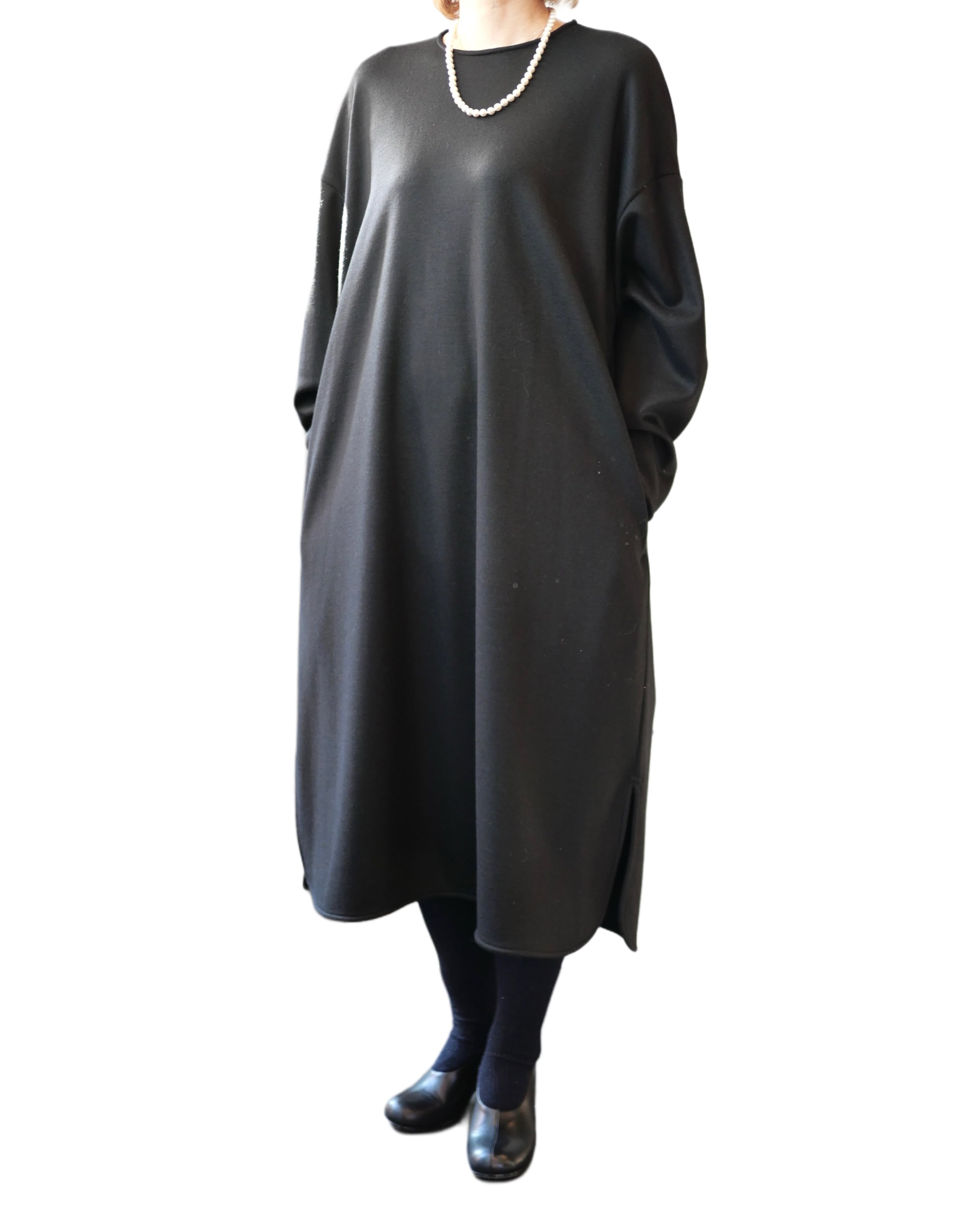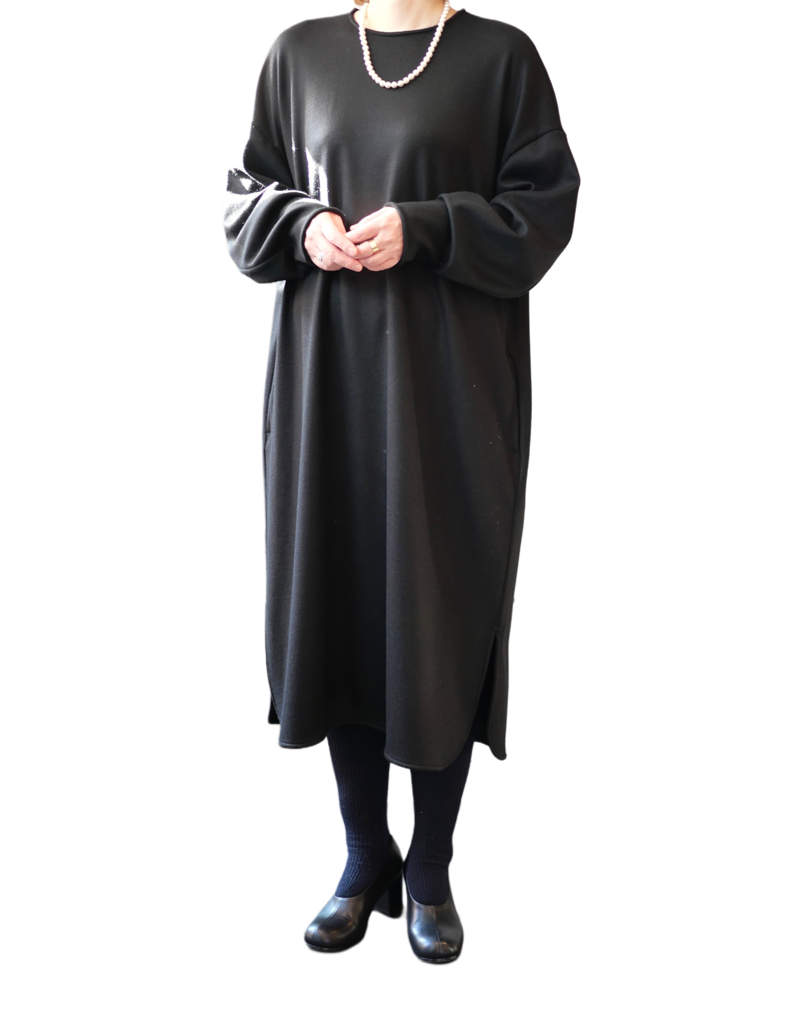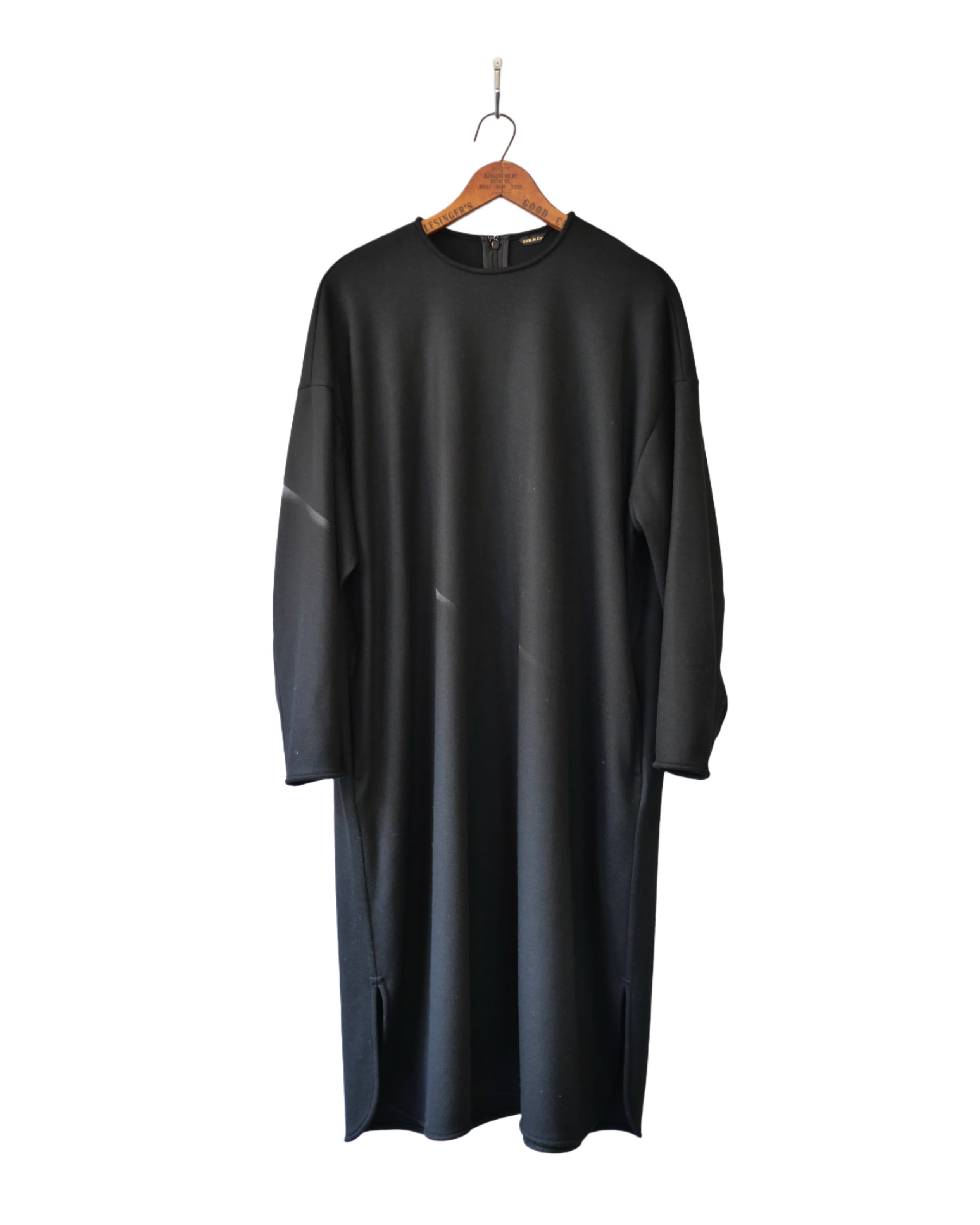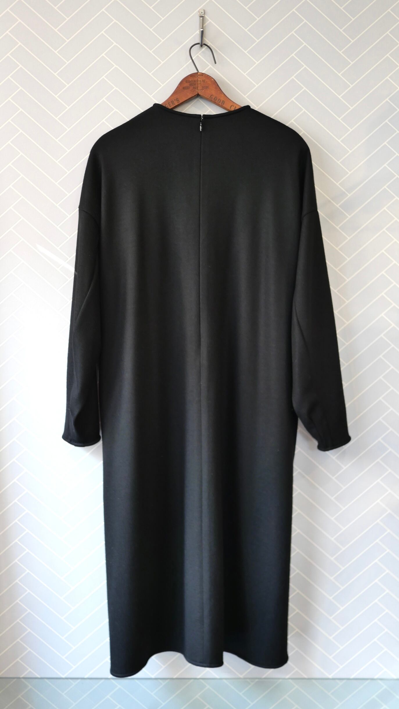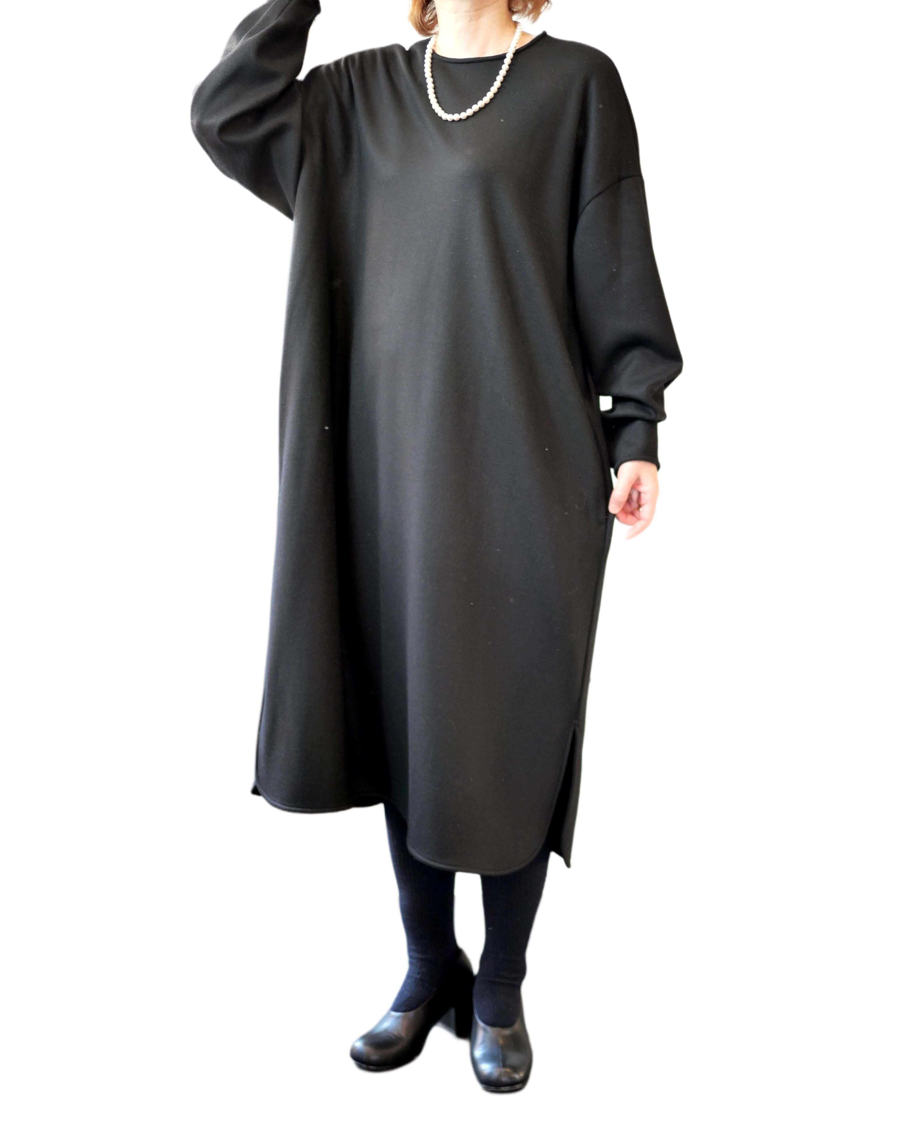 伸縮性のある厚手のジャージ素材「ウールミドルスムース」生地のプルオーバードレス。すぽっと着られるのに、後ろファスナーで閉めるので首周りが綺麗に見えます。全体的にゆったりしていますが着てみるとすっきり見えるのが嬉しい。普段使いはもちろん、急な冠婚葬祭にもお使いいただけるブラックワンピースです。ご自宅でもお洗濯可能で非常に扱いやすいシリーズです。