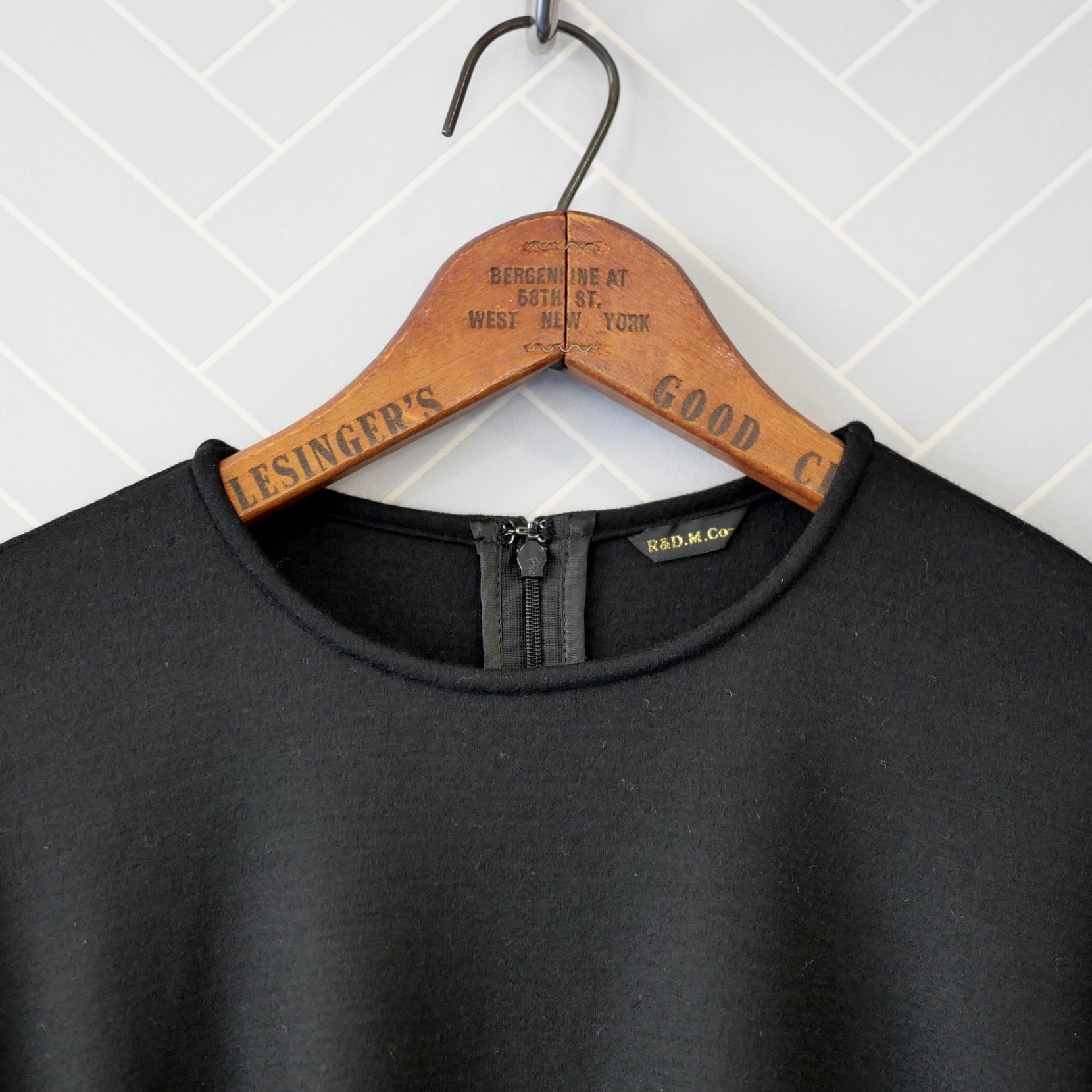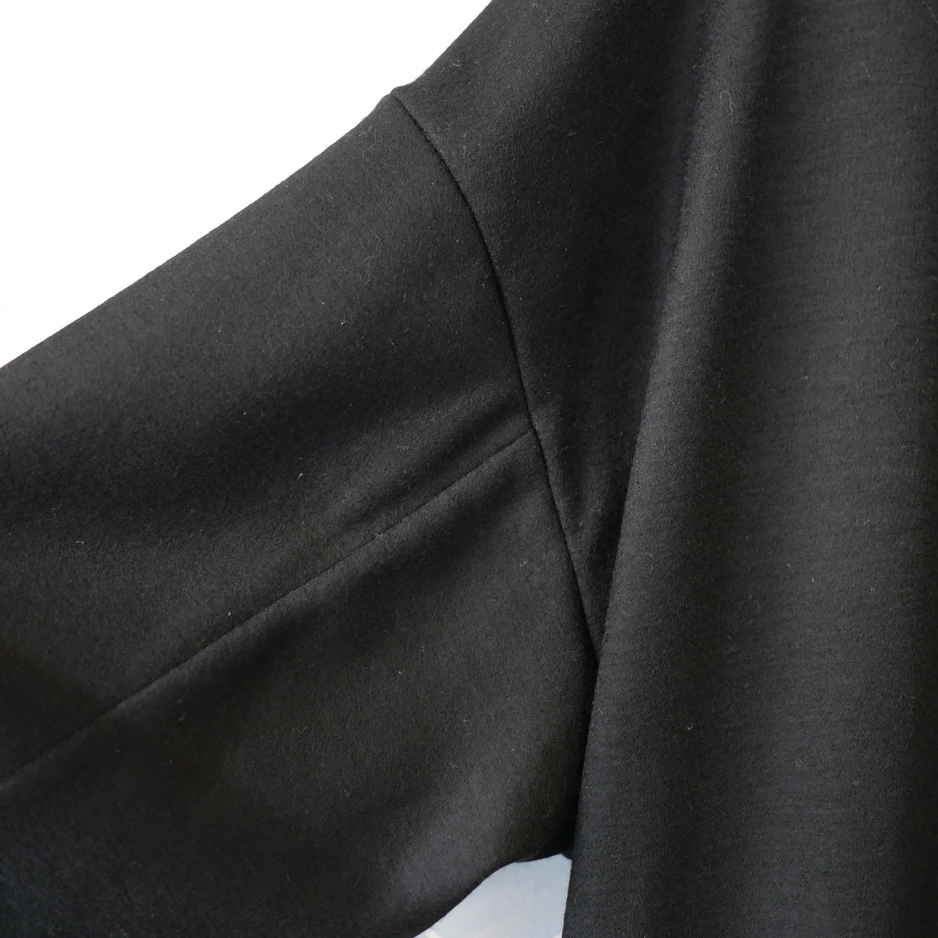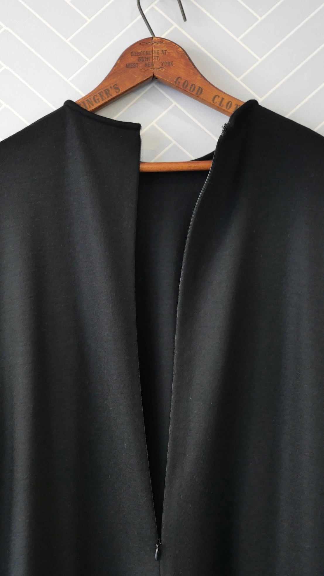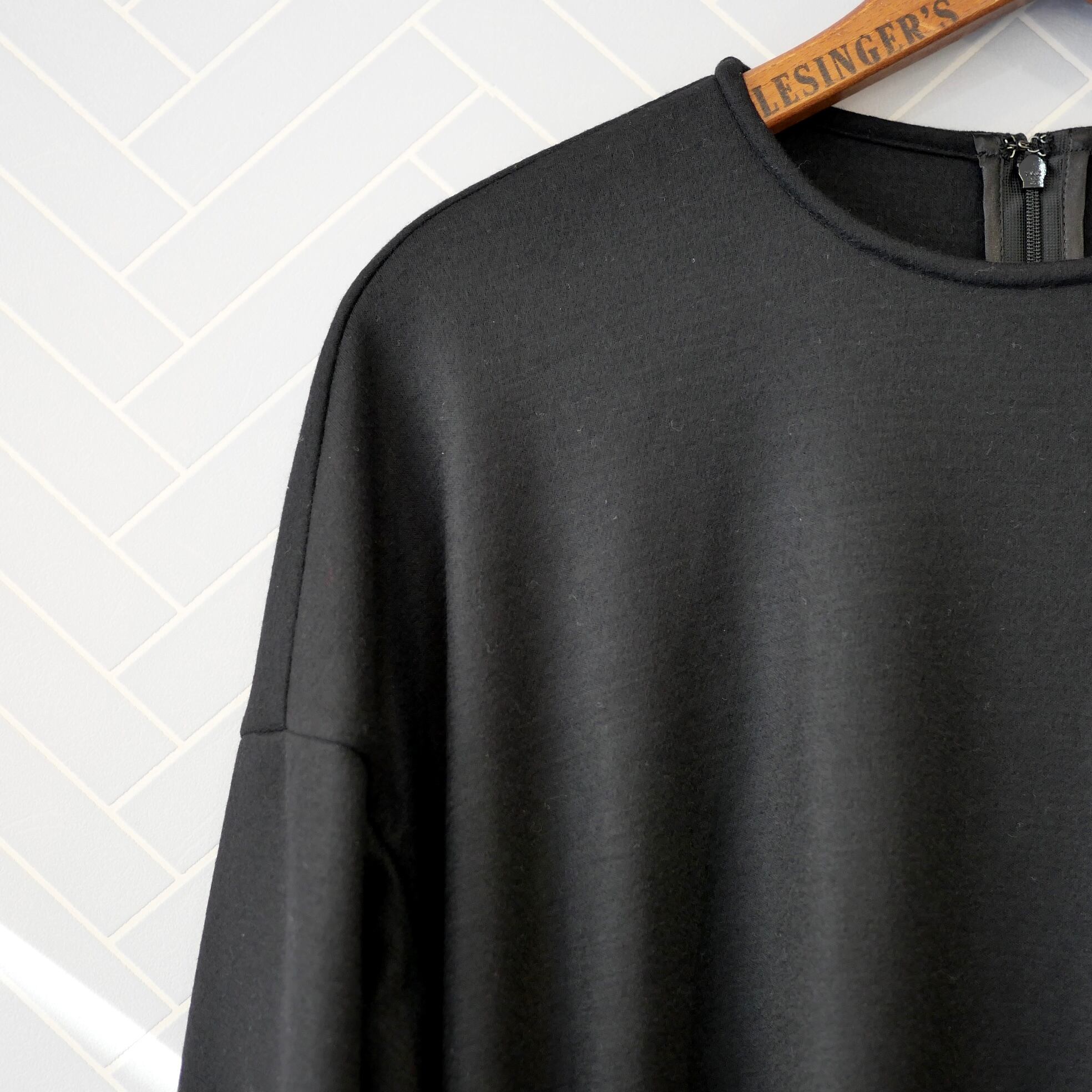 伸縮性のある厚手のジャージ素材「ウールミドルスムース」生地のプルオーバードレス。すぽっと着られるのに、後ろファスナーで閉めるので首周りが綺麗に見えます。全体的にゆったりしていますが着てみるとすっきり見えるのが嬉しい。普段使いはもちろん、急な冠婚葬祭にもお使いいただけるブラックワンピースです。ご自宅でもお洗濯可能で非常に扱いやすいシリーズです。