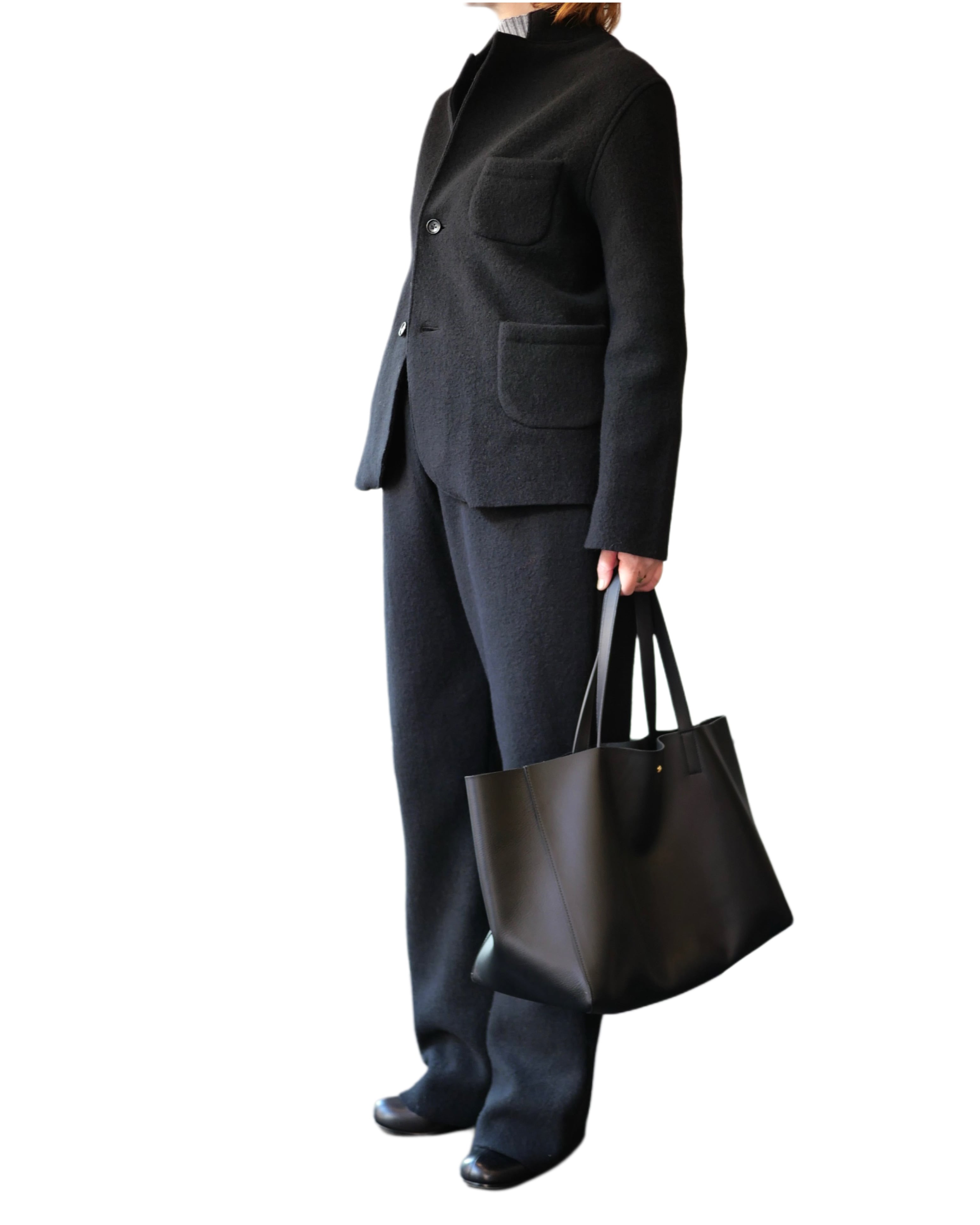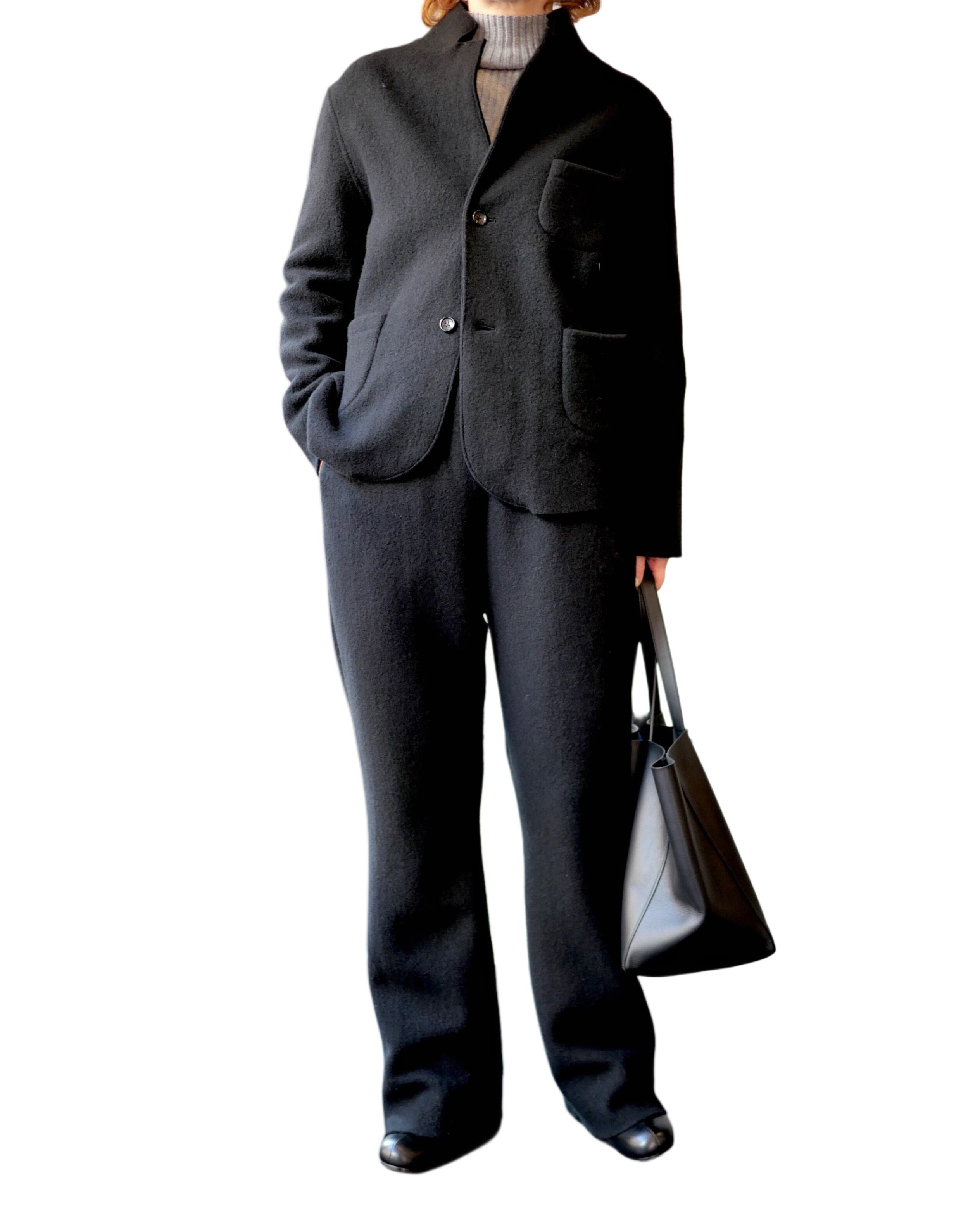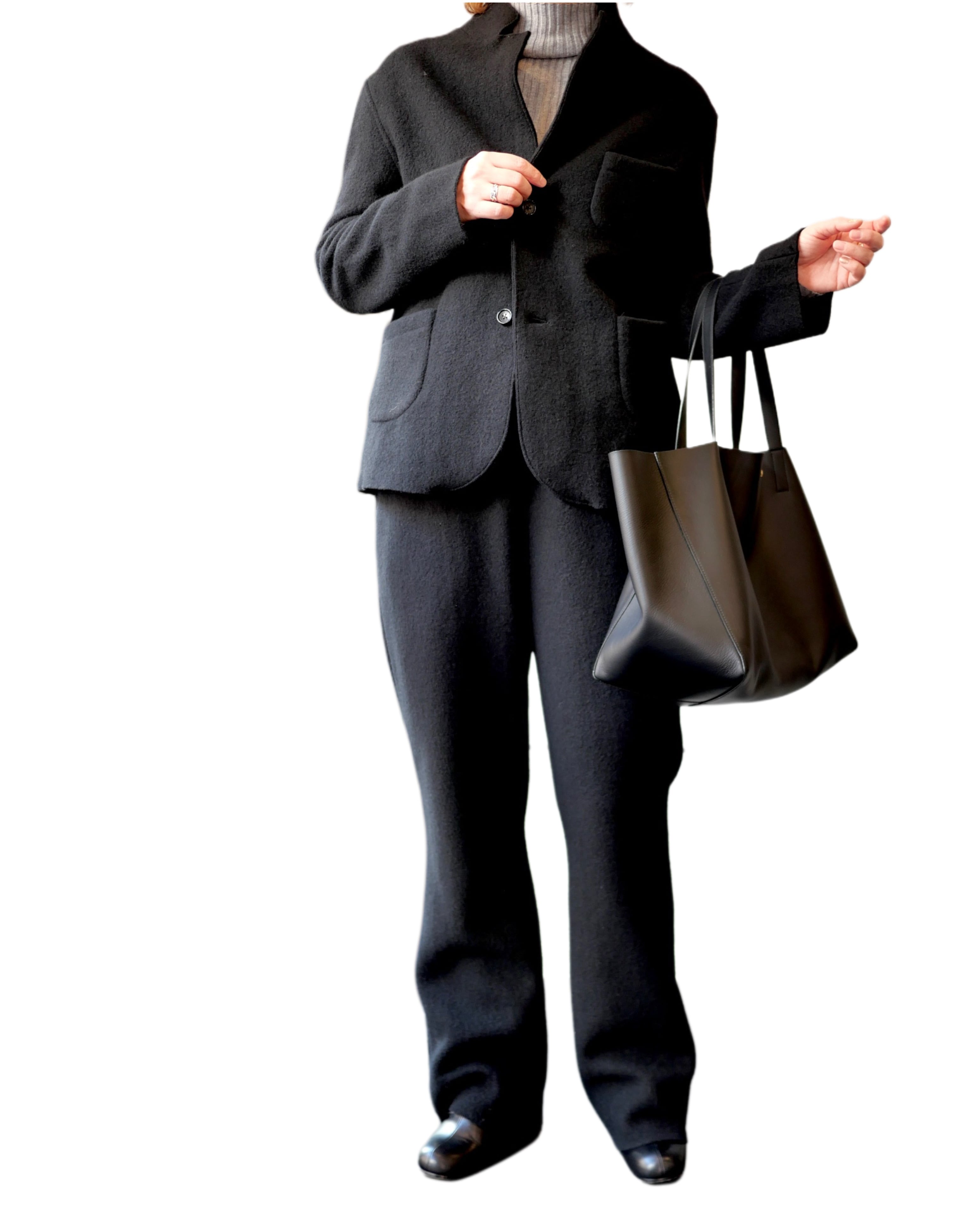 R&D.M.Co-が冬の定番として発売している「ウールフェルト」素材のシリーズ。裏地がなくとても軽い着心地ながら一枚で真冬の寒さにも耐えられる暖かさが人気です。程よい伸縮があり、着ていくうちに身体に馴染み快適な着心地になっていきます。フルレングスのフレアパンツ。クールな黒でビジネスでもプライベートでも活用頂けます。
