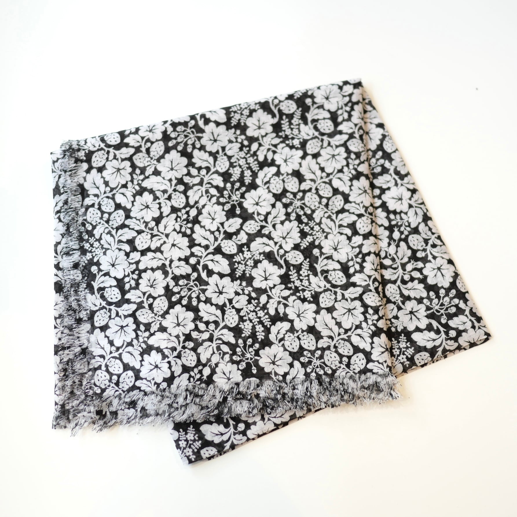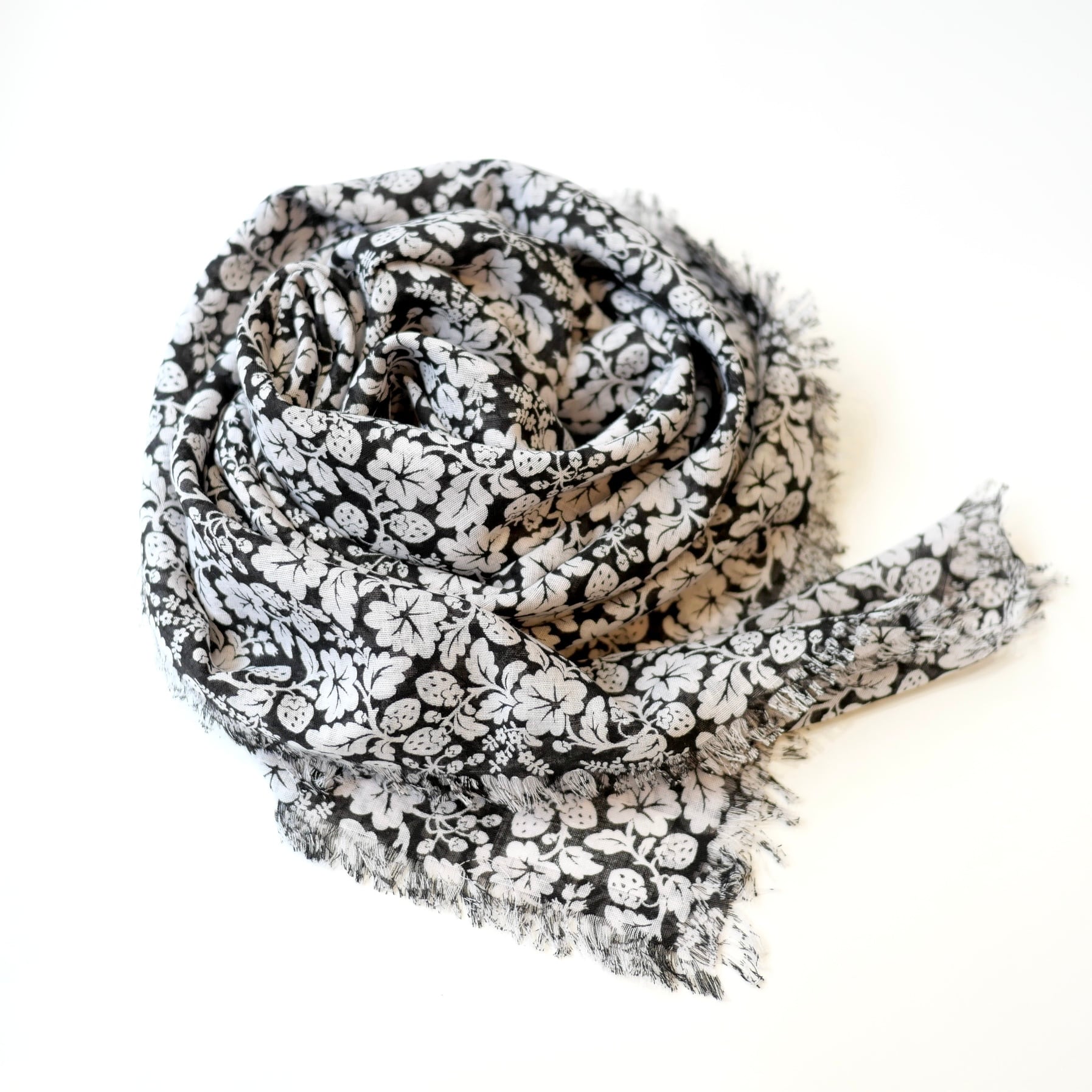 R&D.M.Co- コットン100%ガーゼ素材のショール「WILD BERRY」柄が入荷しました。柔らかく優しい肌触りで、一年中お使いいただけます。気軽にお洗濯ができて、繰り返しお使いいただける丈夫な素材です。