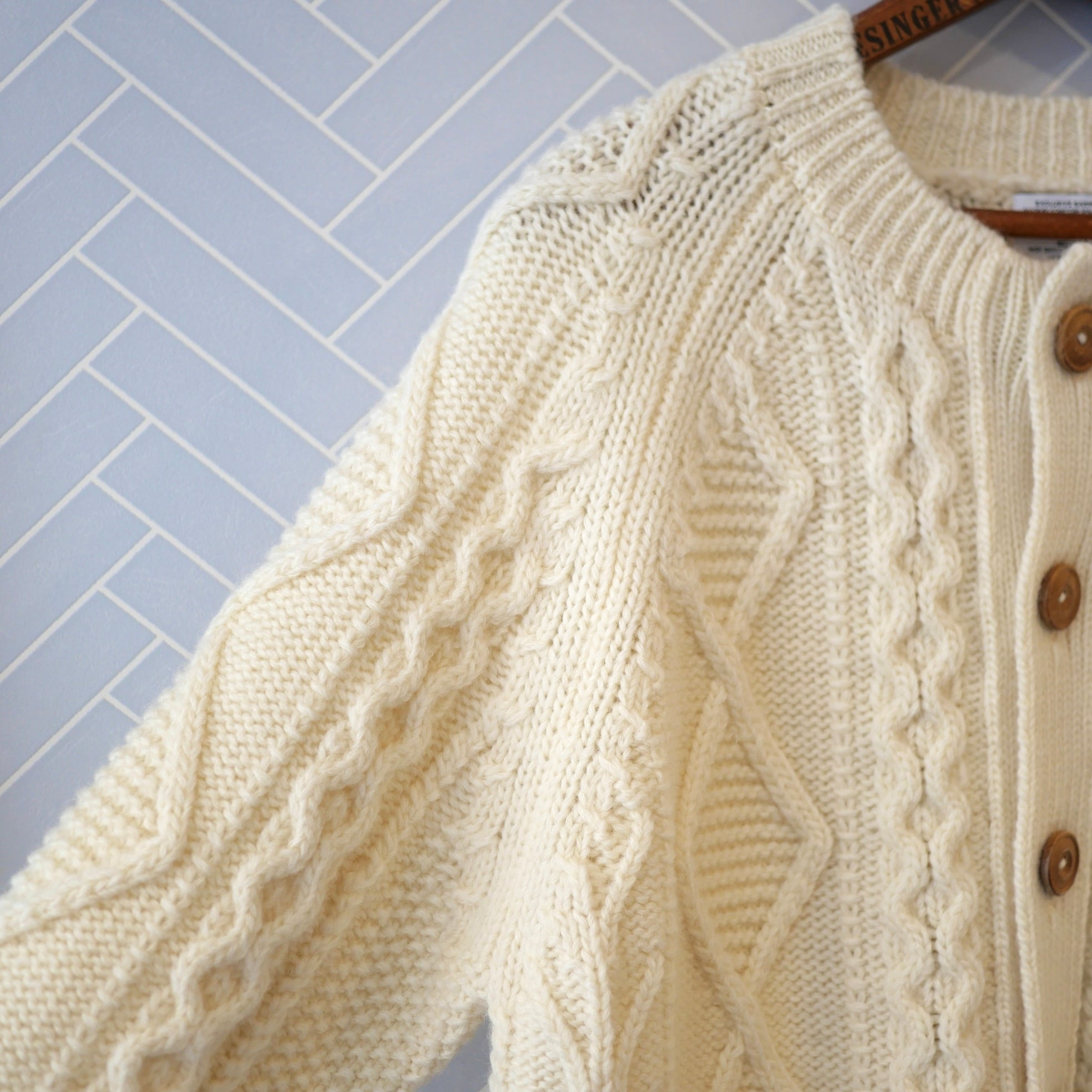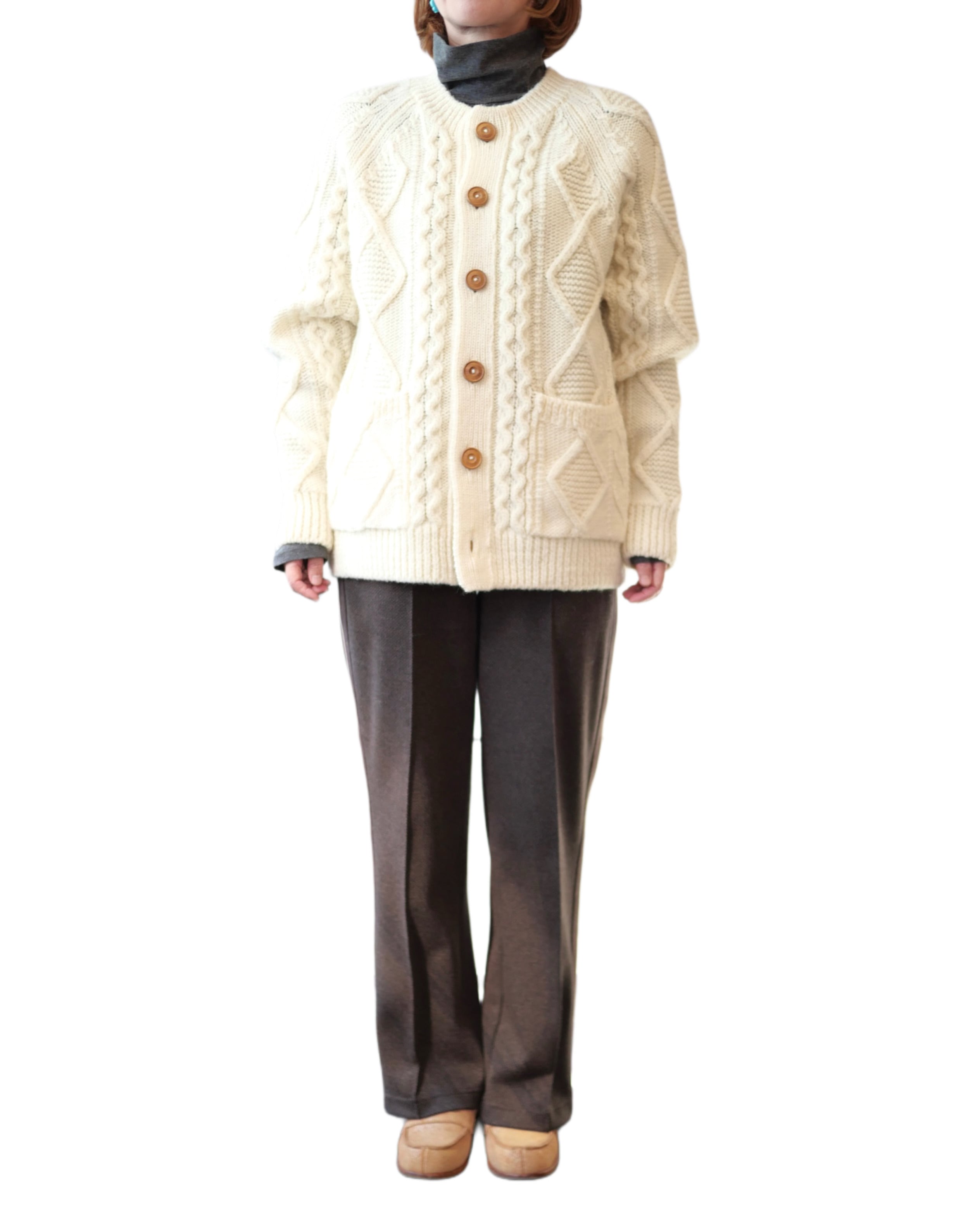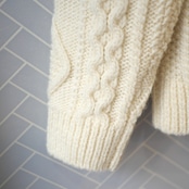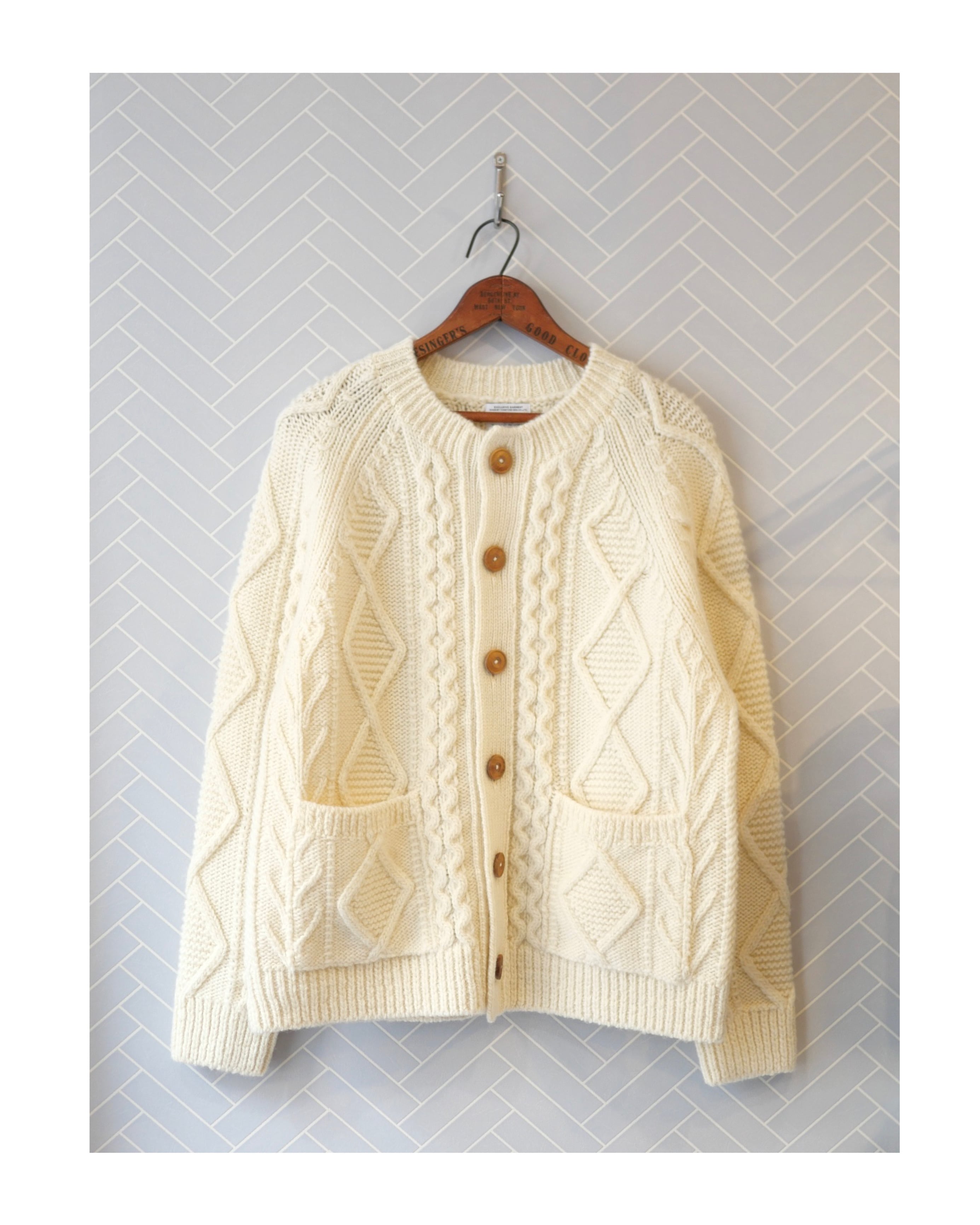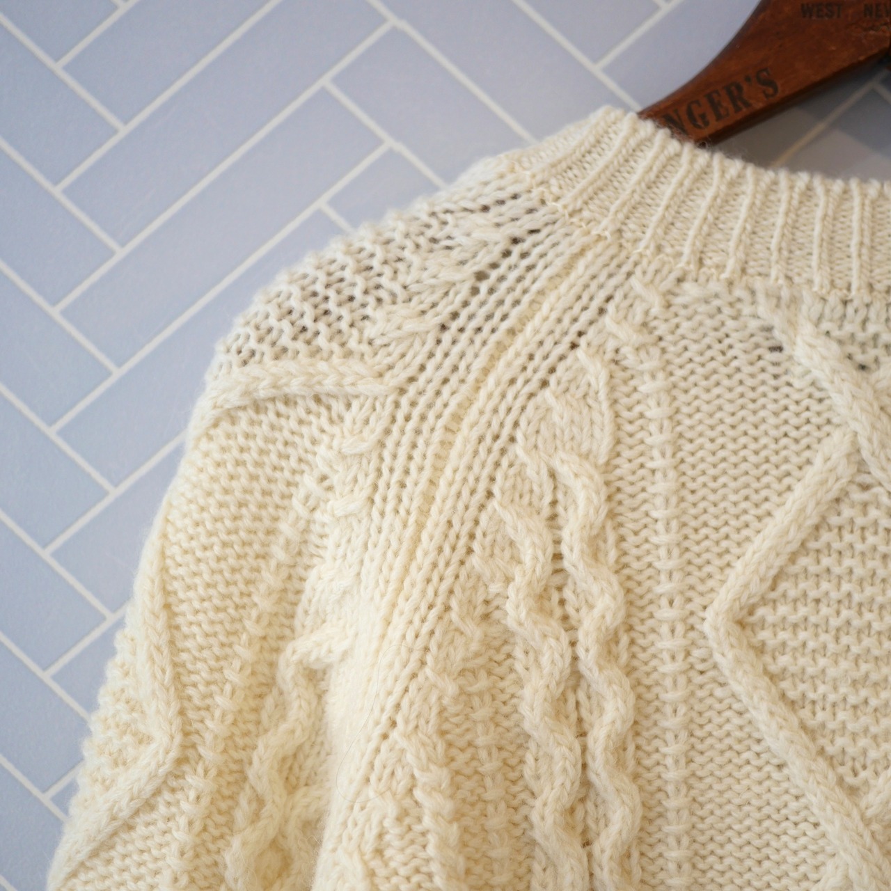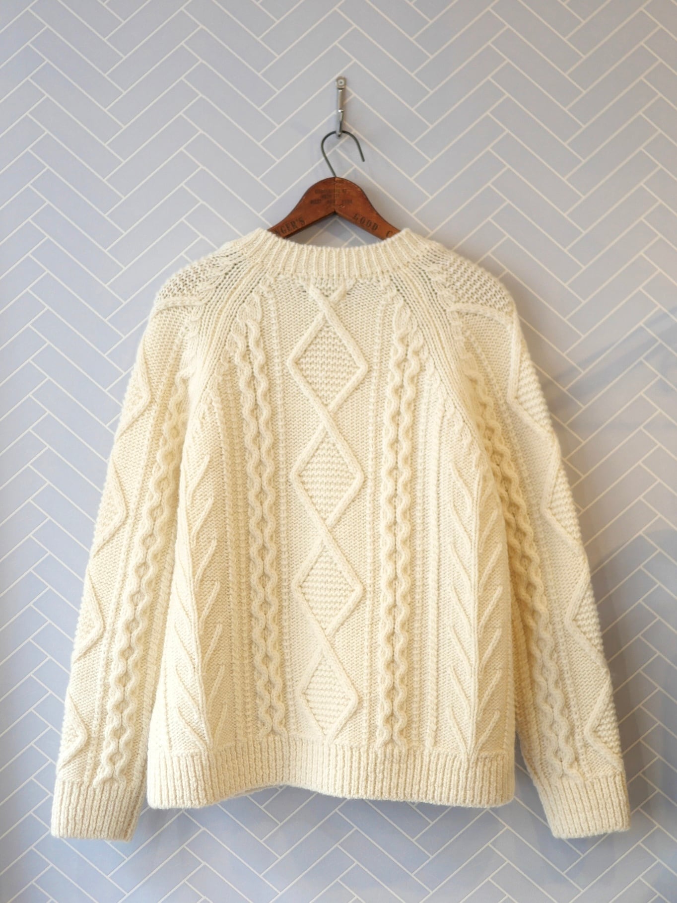 オーセンティックなアランセーターを機械編みで表現しました。素材は膨らみに富んだ甘撚りの極太ウールを使用し、アランセーターらしいややカサっとした風合いがあります。