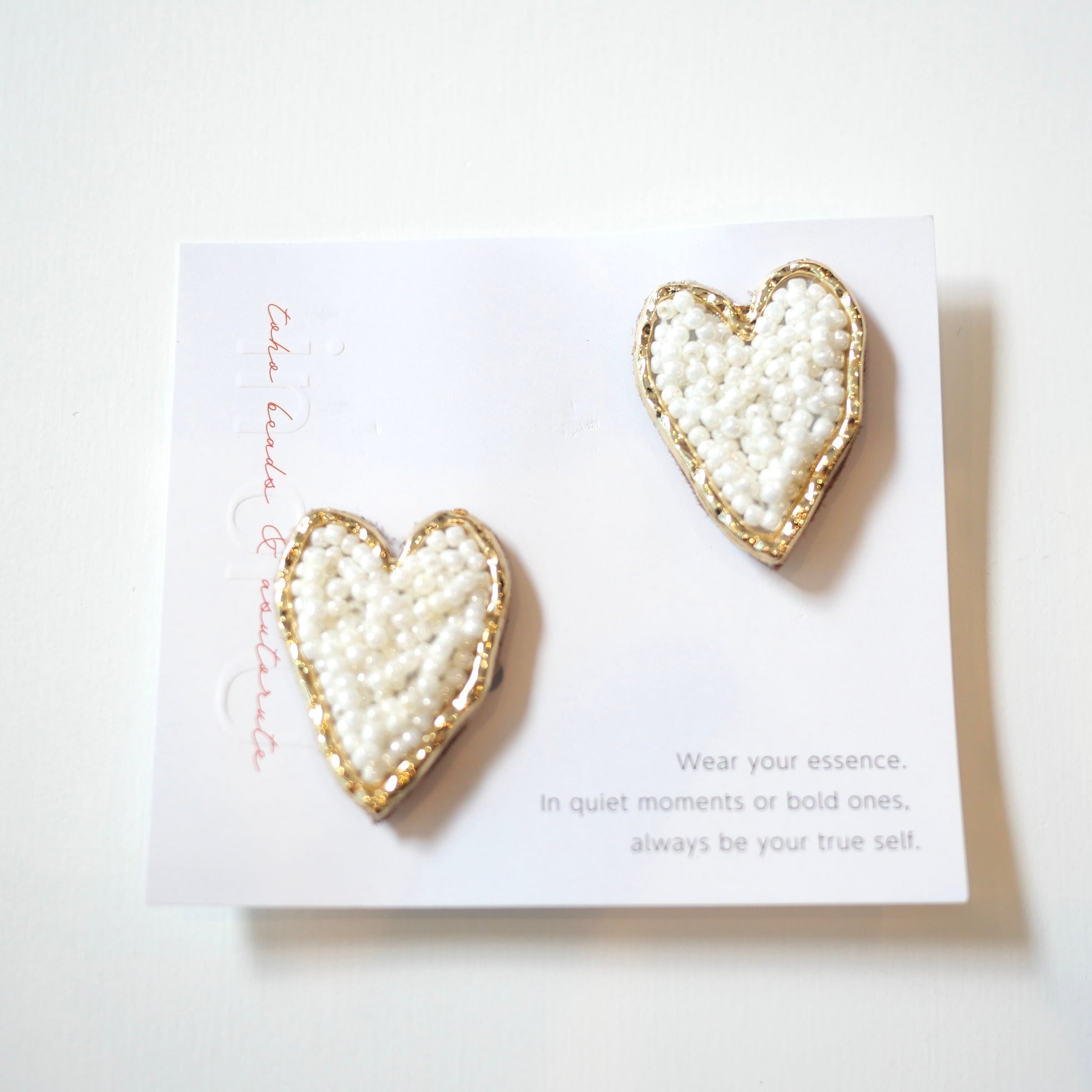ビーズで編み込まれたハートがかわいいイヤリング。どんなコーディネートにも合わせやすいモチーフです。お顔周りを明るく見せてくれる人気色です。