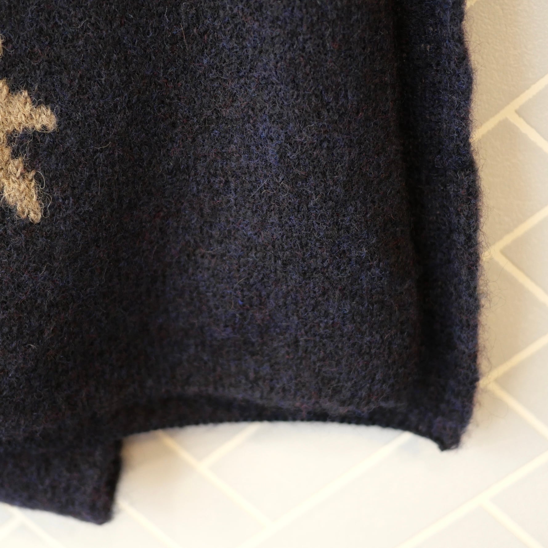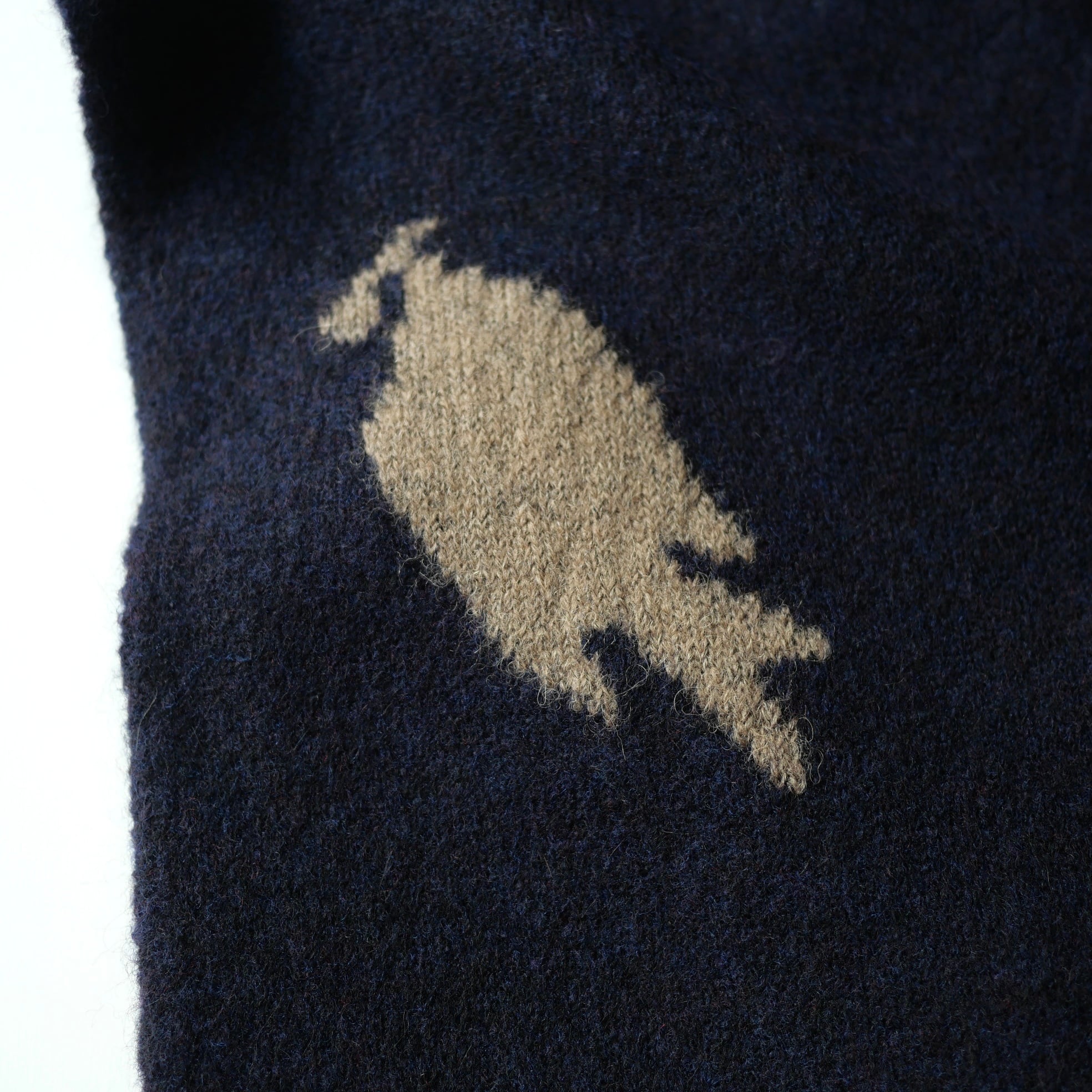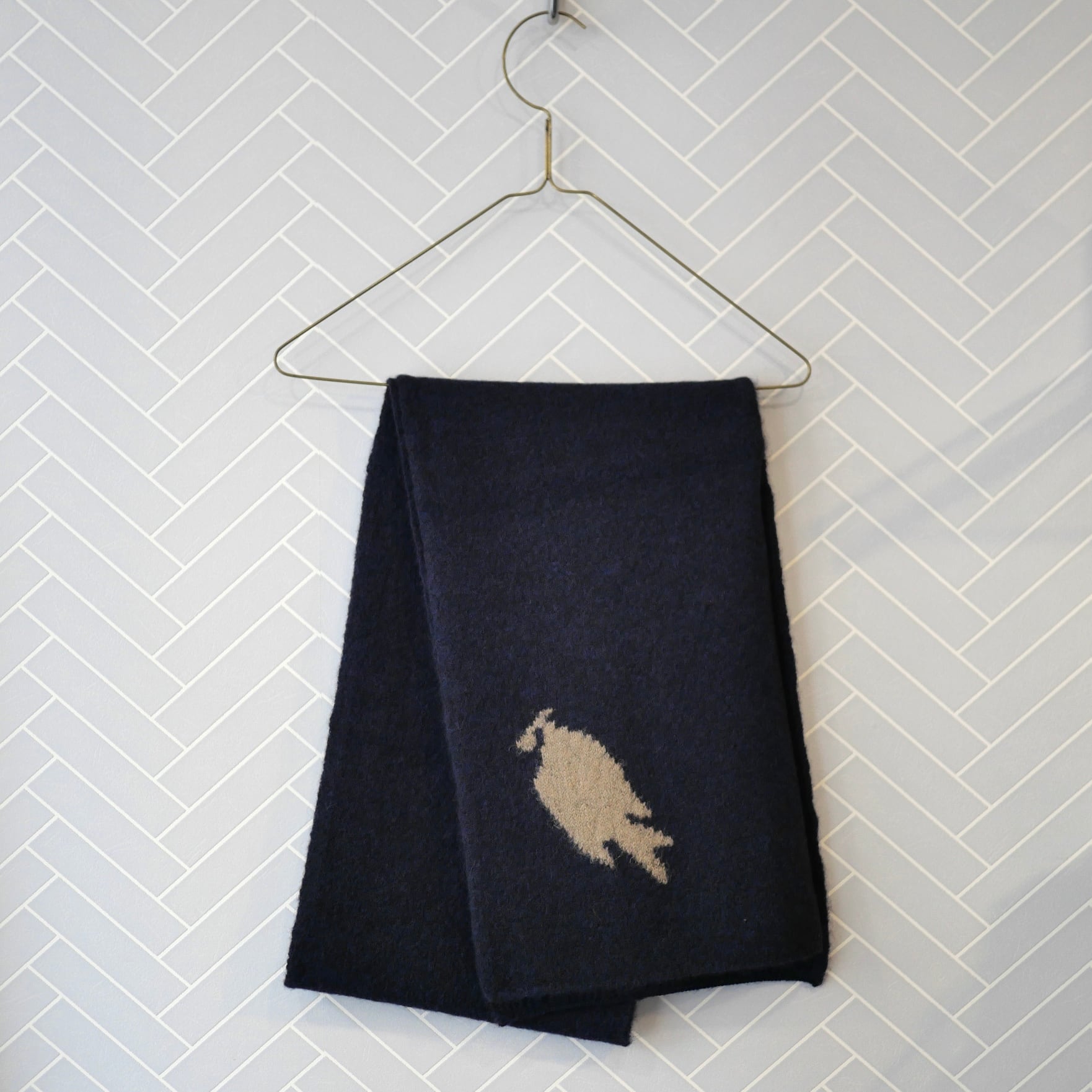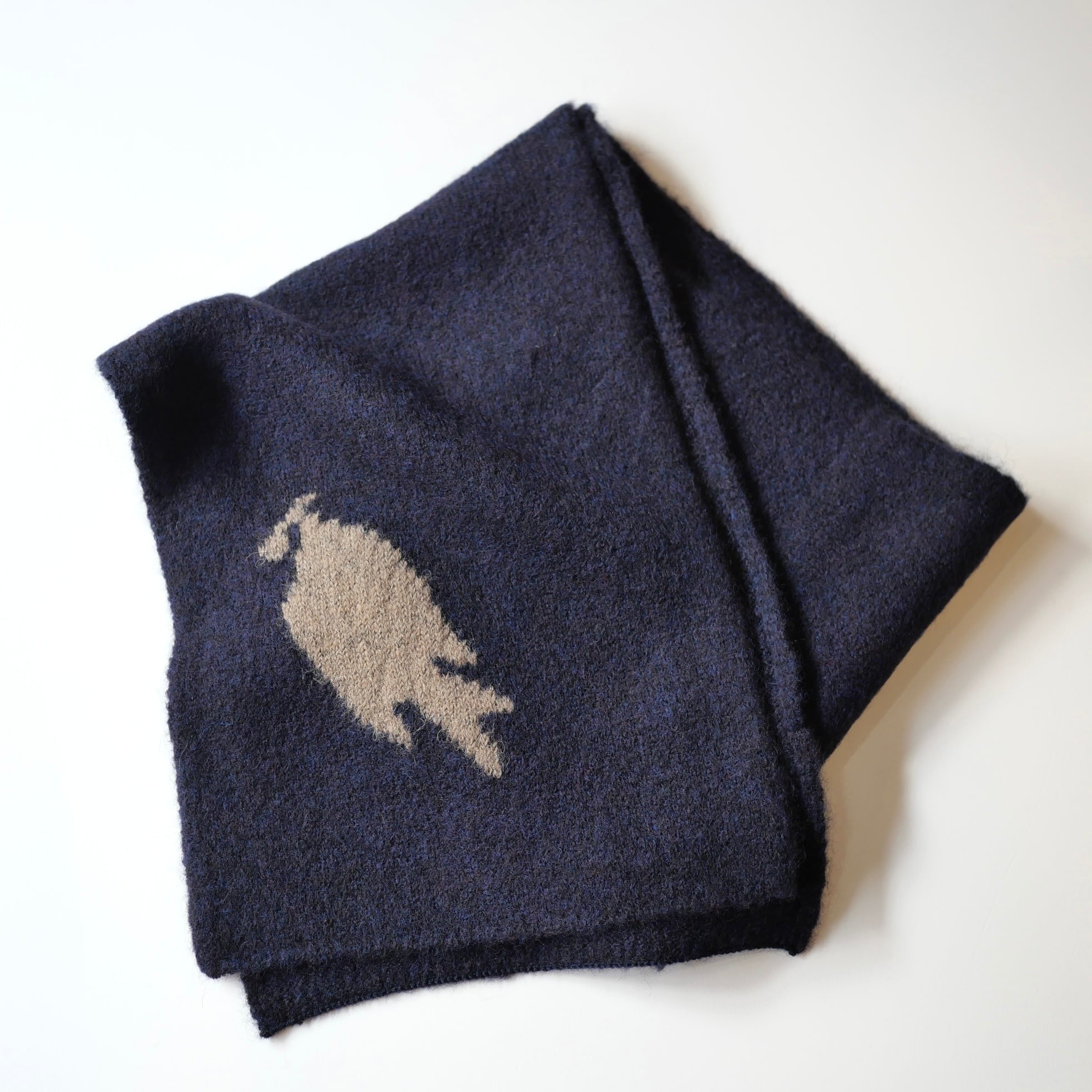 ベビーアルパカとウールを使用したマフラーです。ジャガード織りの技法を用いて立体的に表現されたスワローがポイント。ネイビー地にベージュのスワローがかわいいニットマフラーです。プリントとは違う高級感と上品な色調が大人な雰囲気です。