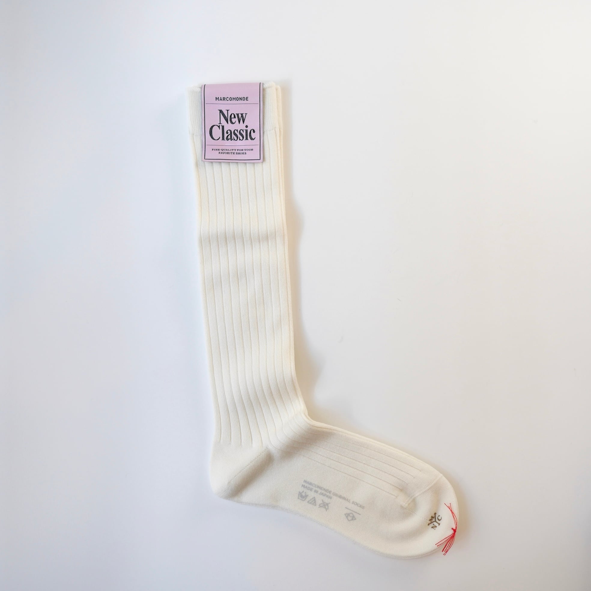 細番手のウール糸SUPER120(ウール100%)を表糸に使用した太めのリブハイソックス。つま先はリンキング仕様で、上下の編み目を丁寧に一目ずつ合わせて縫っています。そのため縫い目にゴロ付きが出ない快適な履き心地です。数少ない職人だけが行える高級ソックスの仕様です。