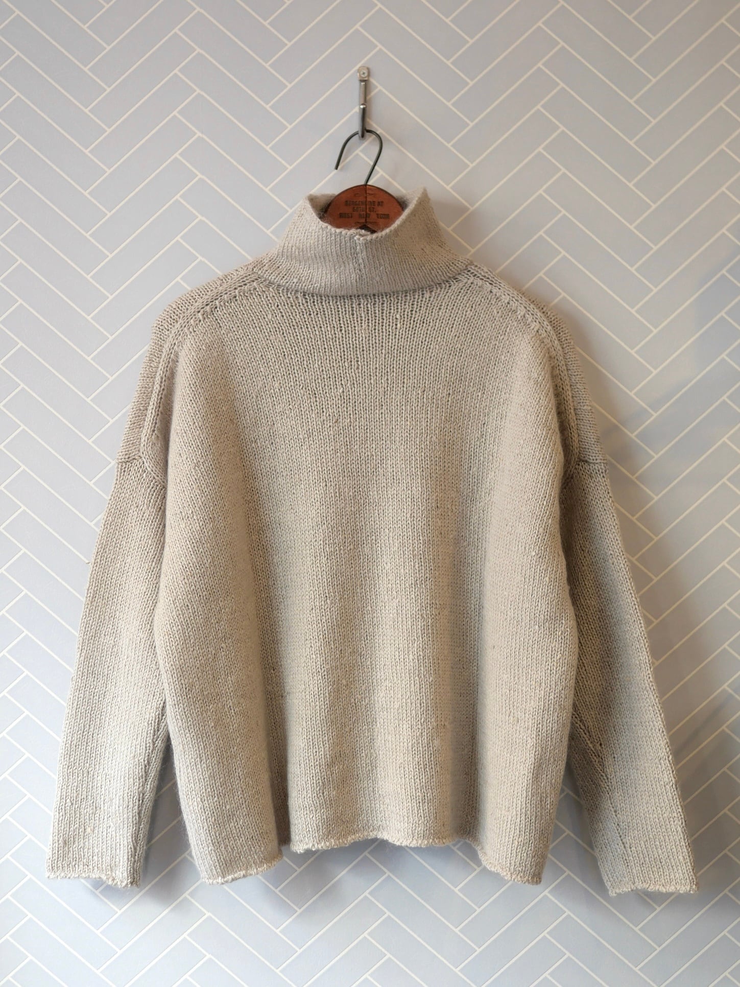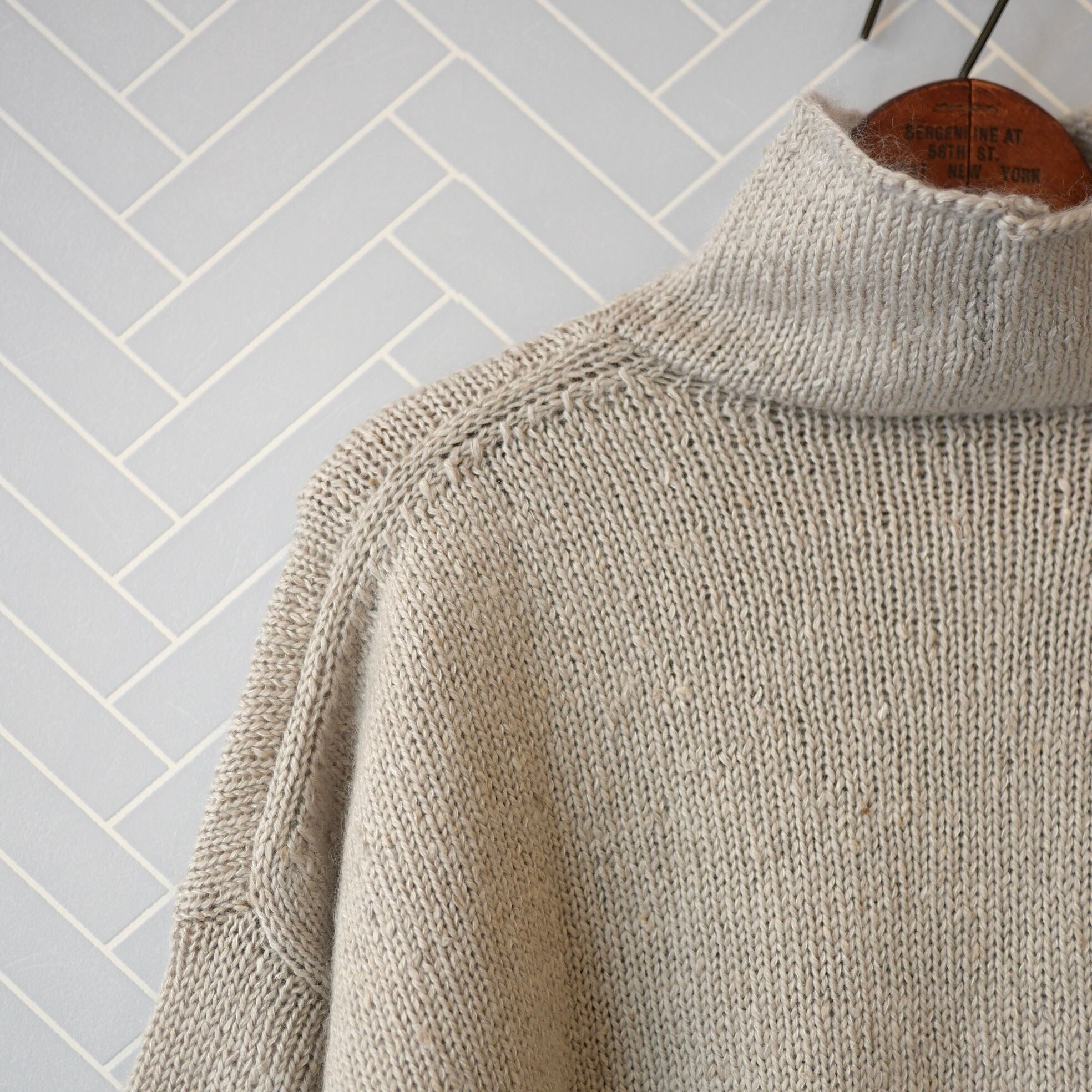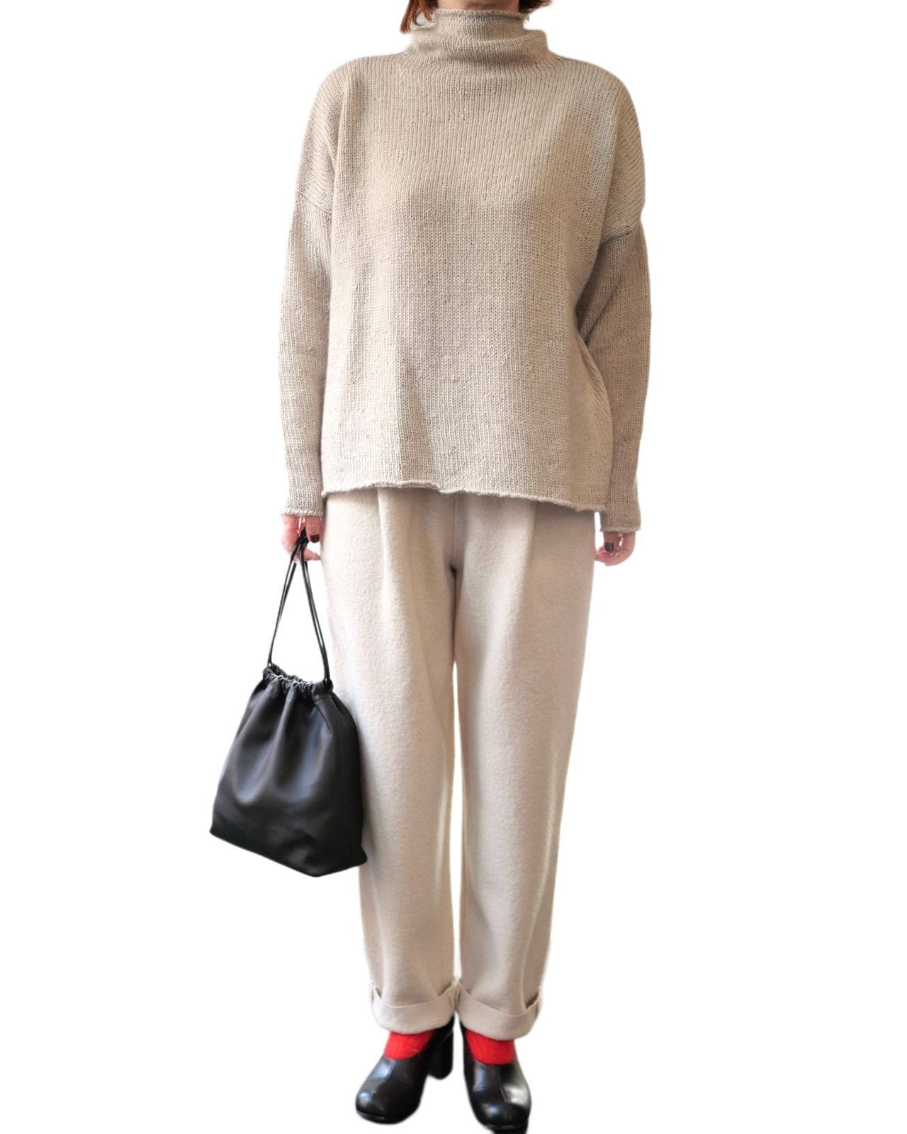 メリノウールとスーピマコットンを繭毛羽にブレンドした糸にシルクモヘアの糸を撚糸した、表面が少し霞がかったような表情を持つ素材です。タートルネックはやさしく首を包みこみます。