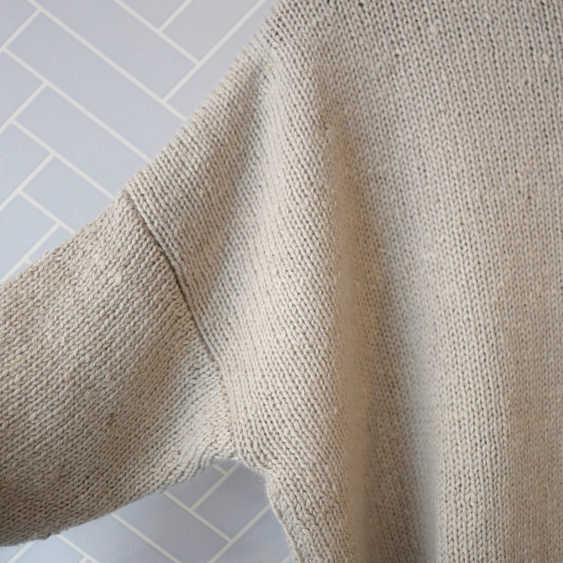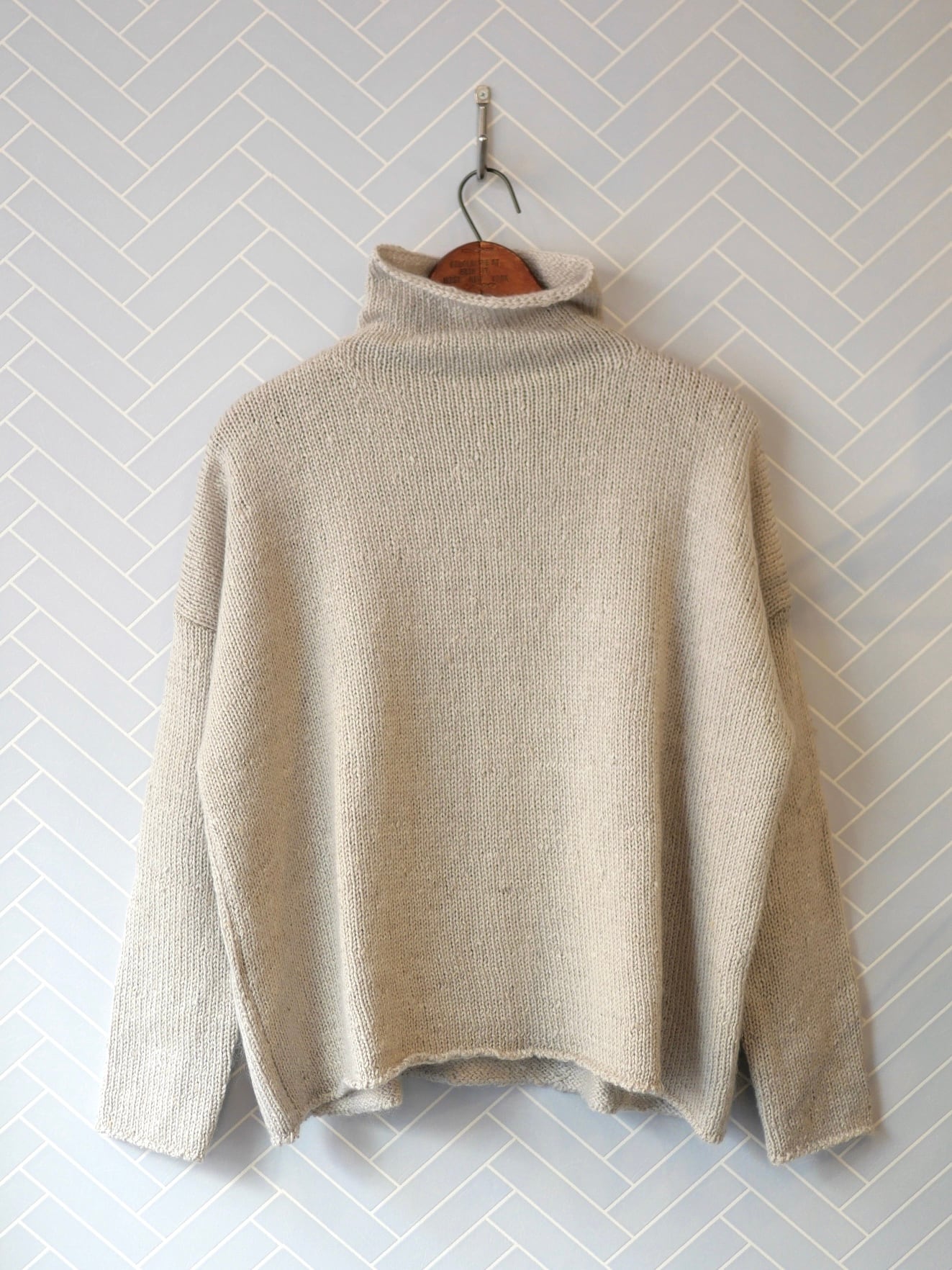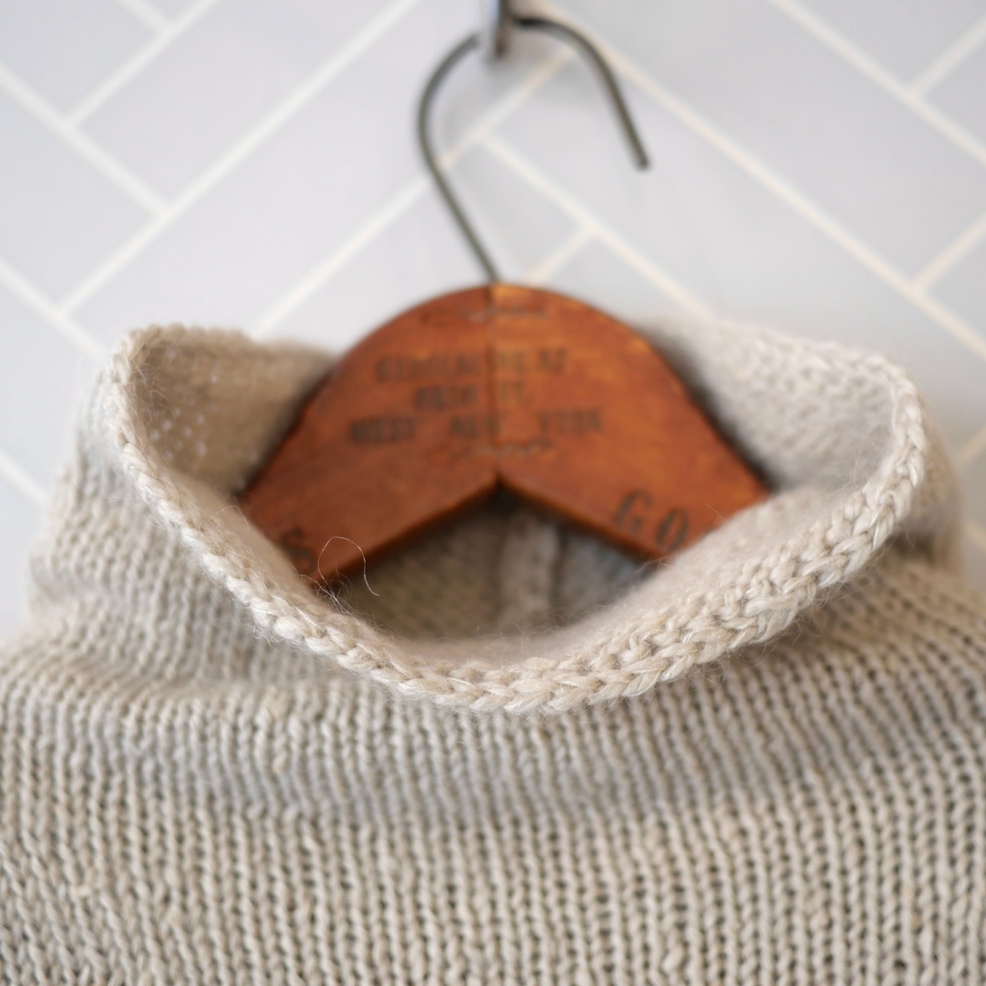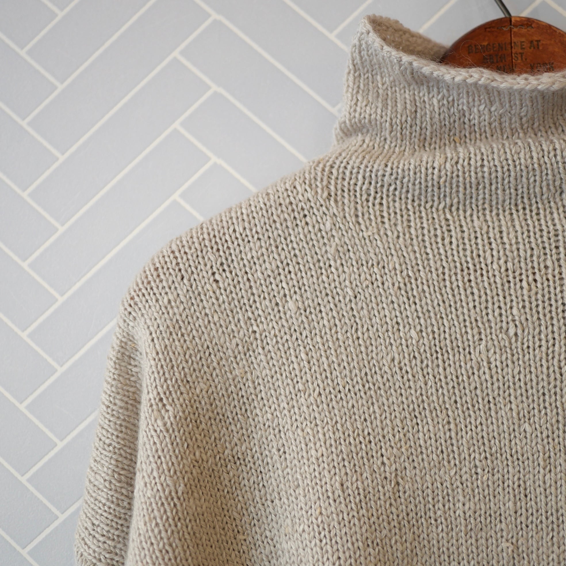 メリノウールとスーピマコットンを繭毛羽にブレンドした糸にシルクモヘアの糸を撚糸した、表面が少し霞がかったような表情を持つ素材です。タートルネックはやさしく首を包みこみます。
