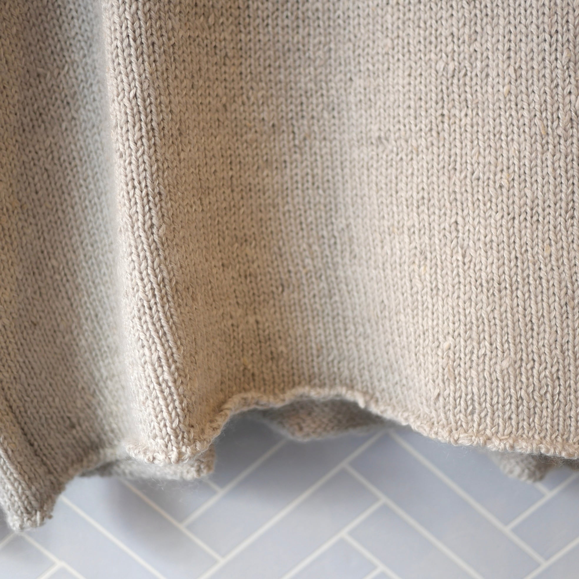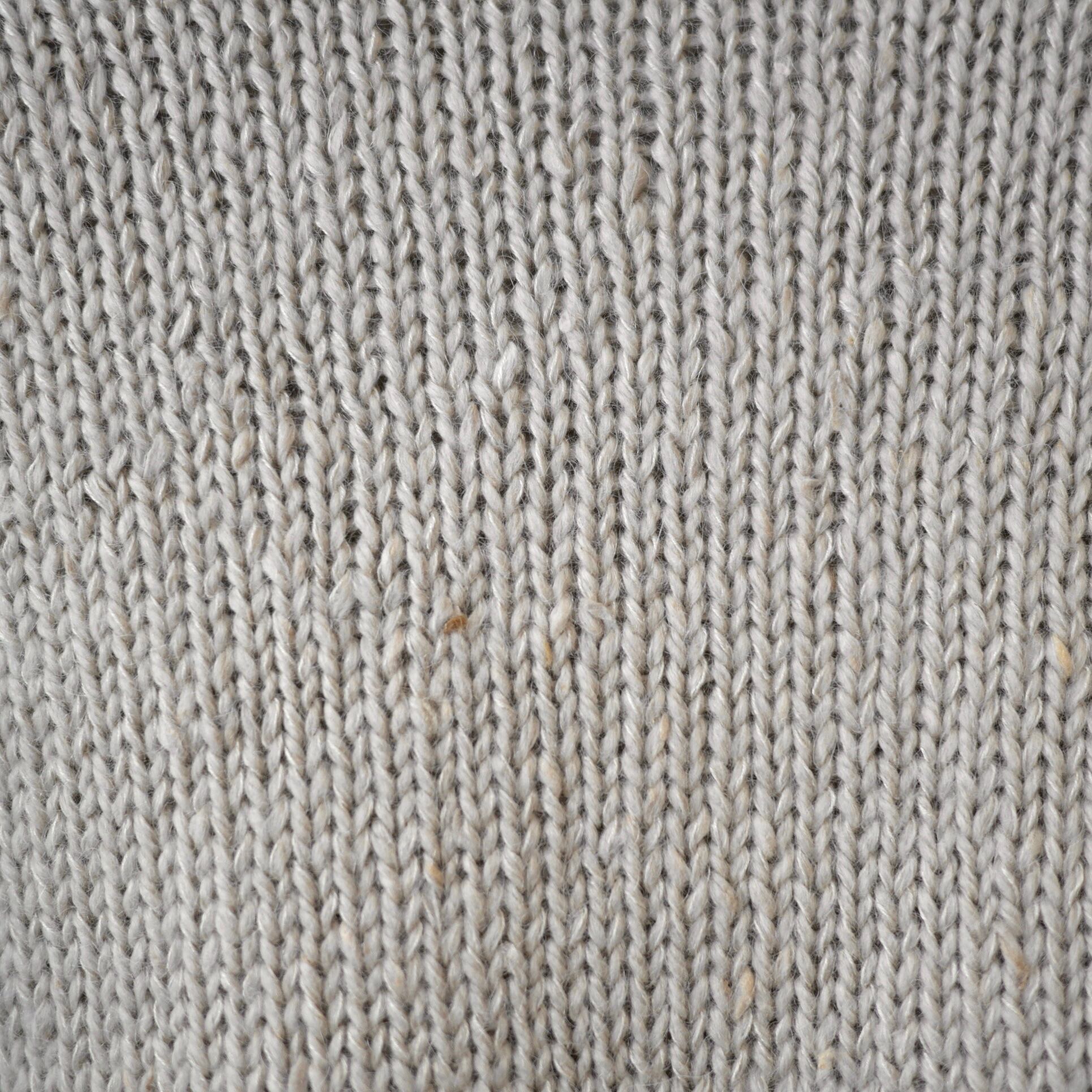 シルクの繭を取り出す際に、本来なら除去されてしまう「繭毛羽」と呼ばれる繭の外側の綿を使用しています。地元の養蚕農家より譲り受けた材料を使い、無駄のない使用方法を思考し、素朴な表情のあるニットに仕上げました。evam evaらしいナチュラルな風合いが魅力的です。