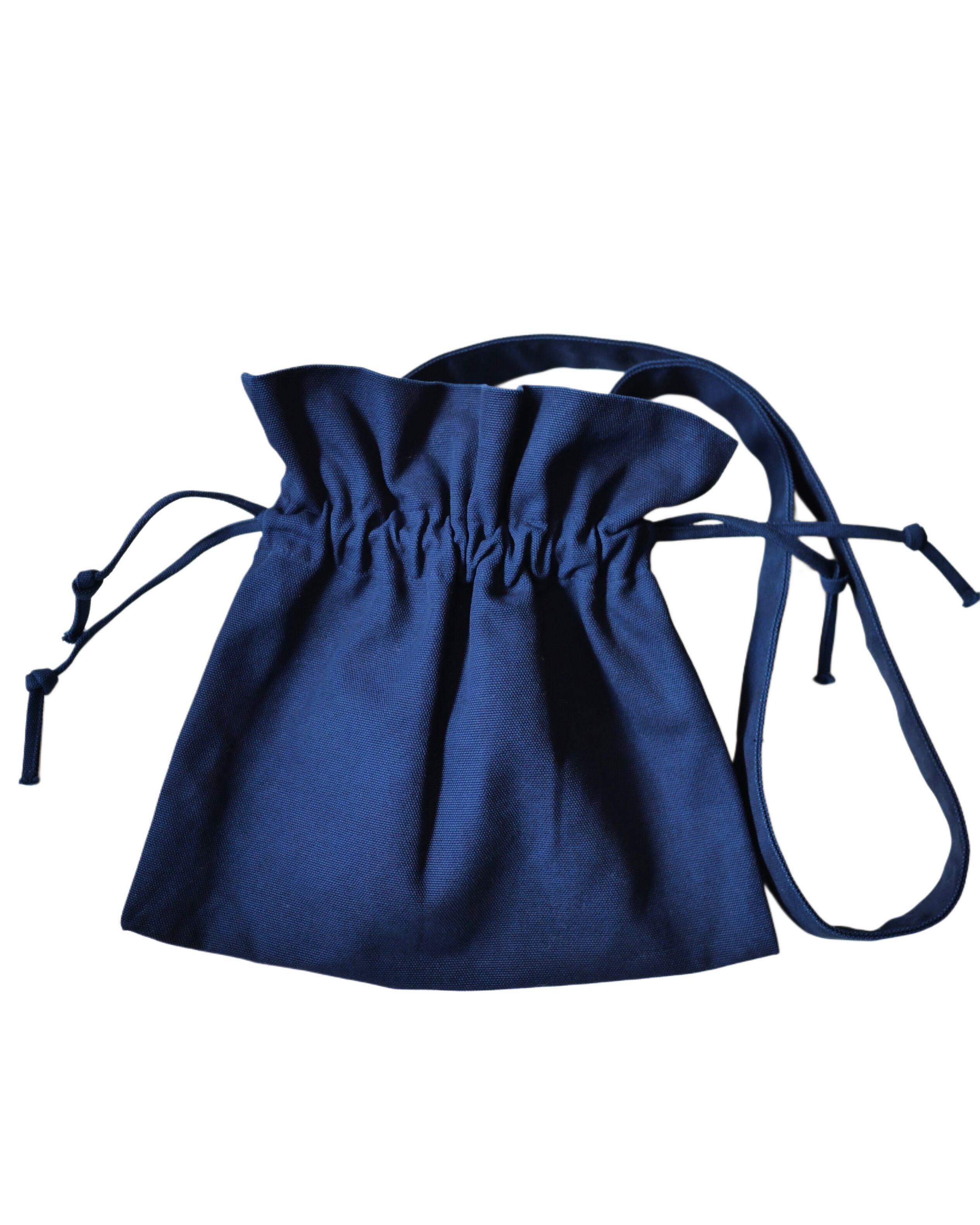 キャンバス素材の簡素なバック、しっかりとした厚い生地で型崩れしない質実剛健な作りです。斜めにかけると不思議と安定するデザイン、表側だけ立ち上がるギャザーで中身が見えにくく出し入れもしやすい作りとなっています。