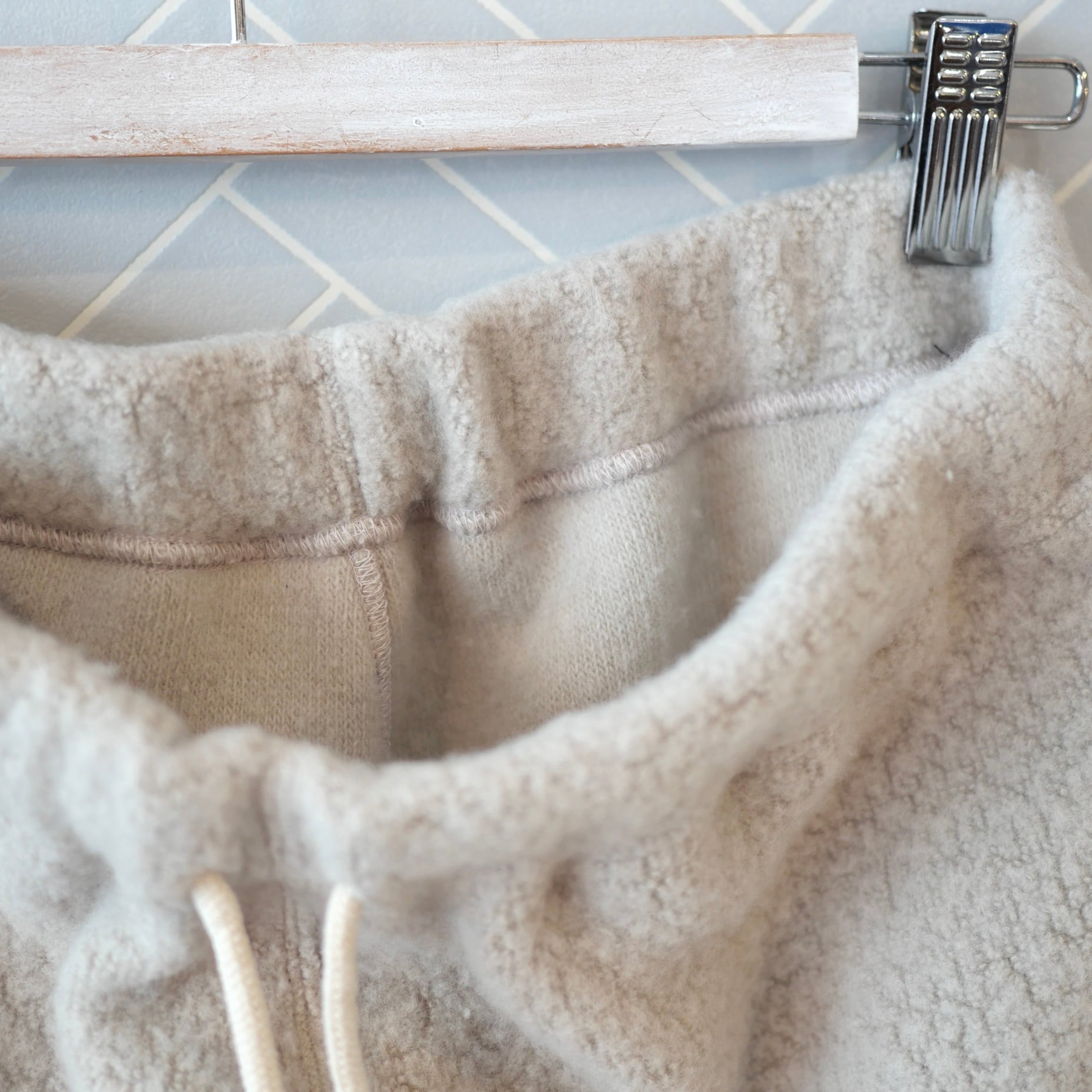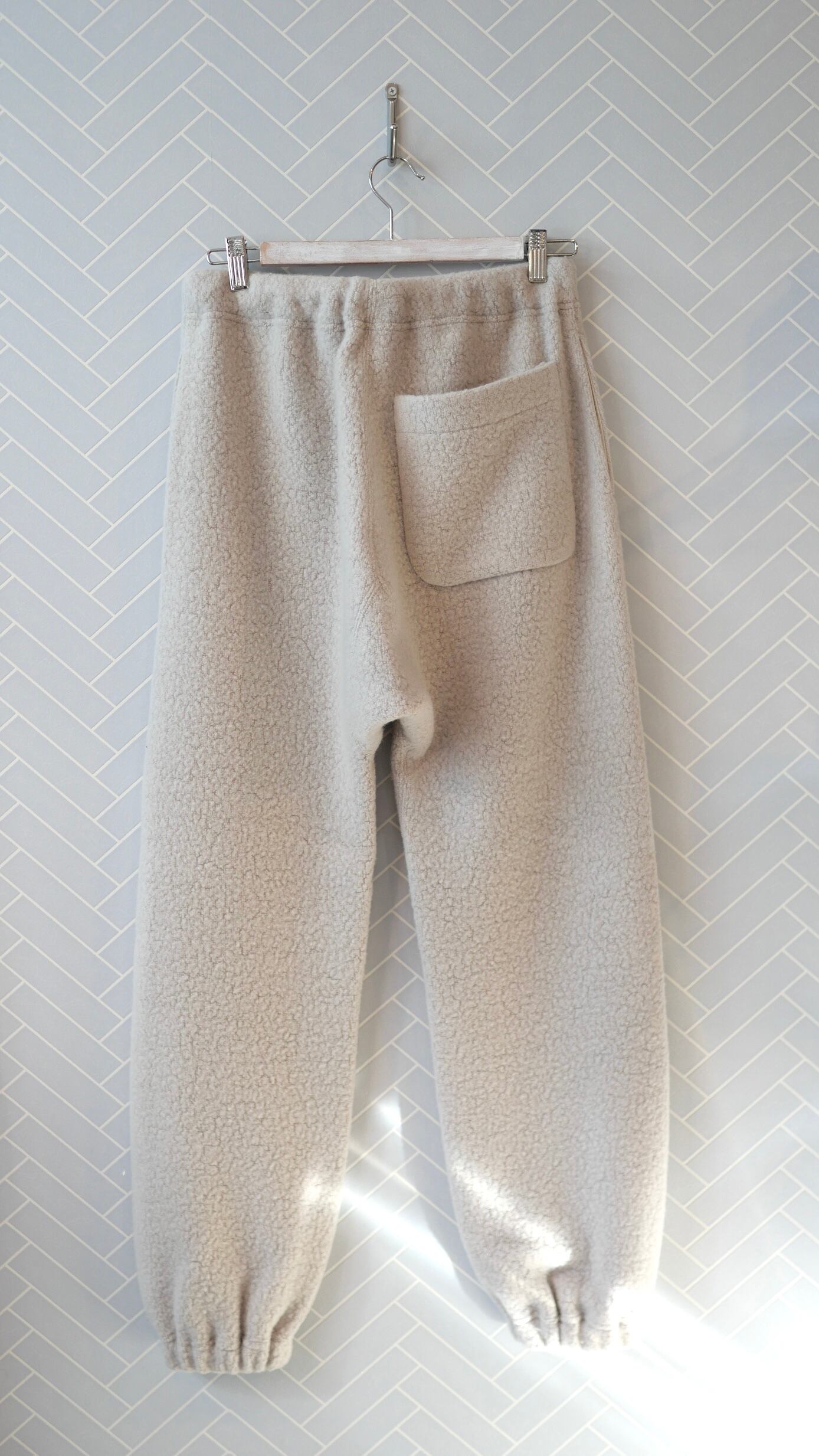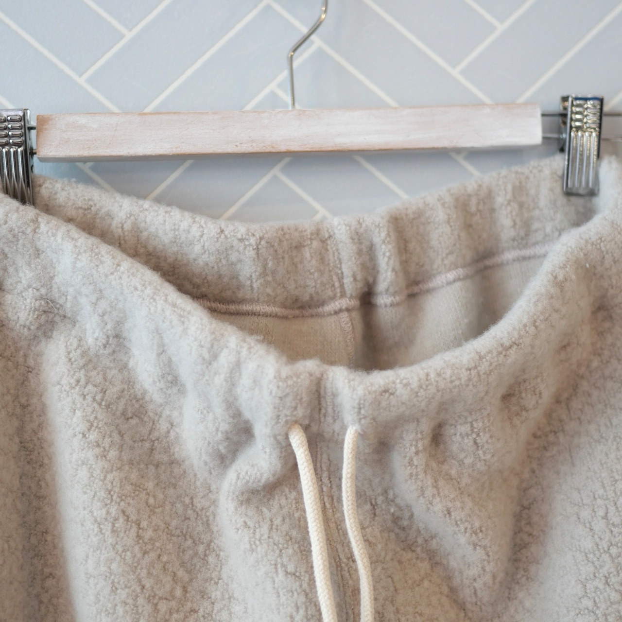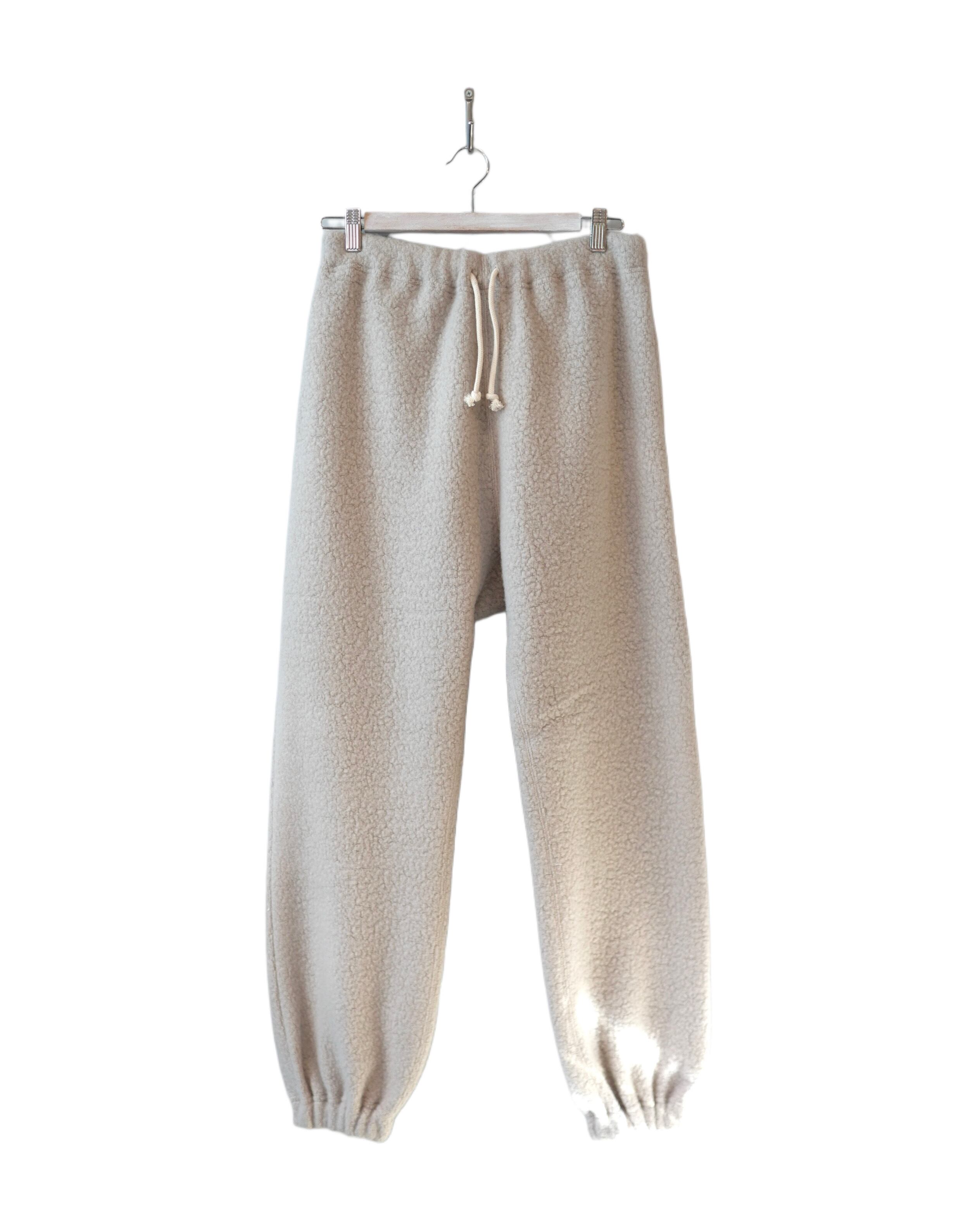 もこもこの羊みたいな生地、「シープボア」でできたスウェットパンツ。形の良いスウェット型なので色んなトップスと合わせていただけます。なんといってもとても暖かいので、寒がりさん、気温の低いところにお住まいの方に大変おすすめです。ゆったりめのフリーサイズになっています。