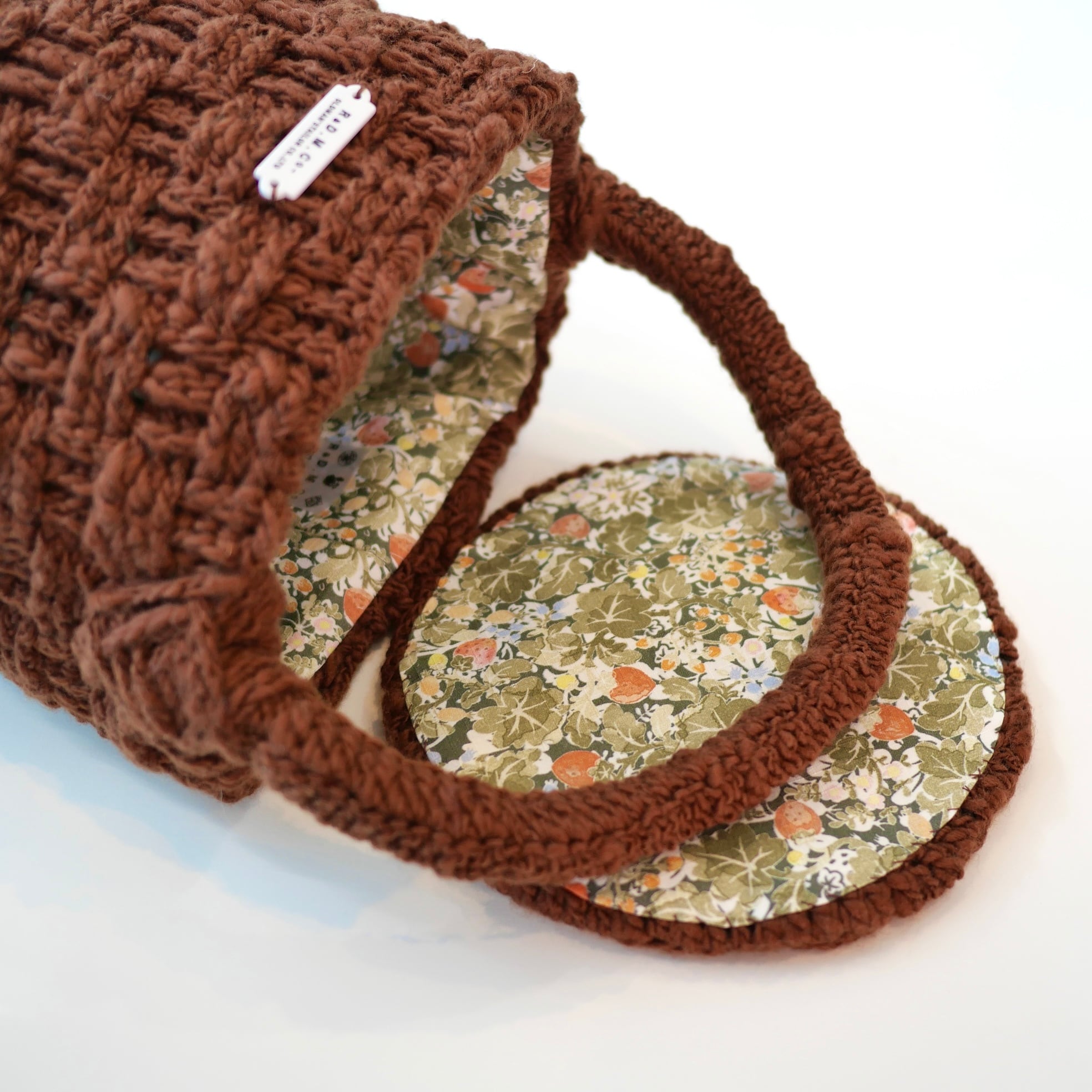 手編みでバスケット編みによるバスケット型のころんとしたバック。内側にはワイルドベリーフィールド柄の生地が縫い付けられていて開けたところも可愛い。古き良きイギリスの田舎の農場婦が少し離れたお隣のお家に、お茶をしに行くときに持っていそうなイメージのバック。もちろん、中には焼きたてのスコーンが、、。なんて妄想膨らむとっても素敵なバックです。