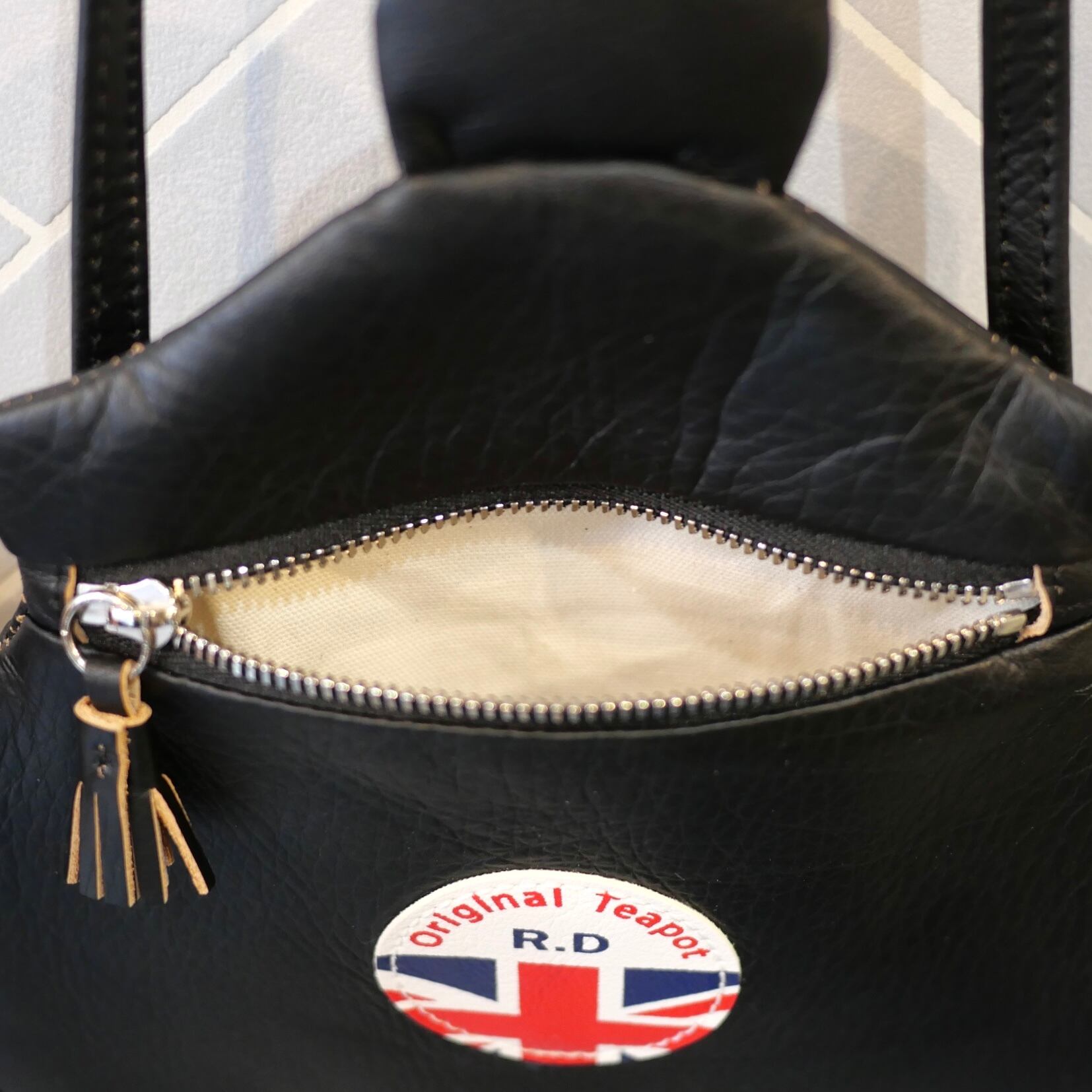 ティーポットがショルダーバックになりました。英国のティータイムに登場する大きめな陶器のティーポットを忠実に再現したバック。柔らかいレザーでポケットやファスナーまで丁寧に制作されています。R&D.M.Co-の遊び心と、日本の職人技が融合した素敵な逸品です。