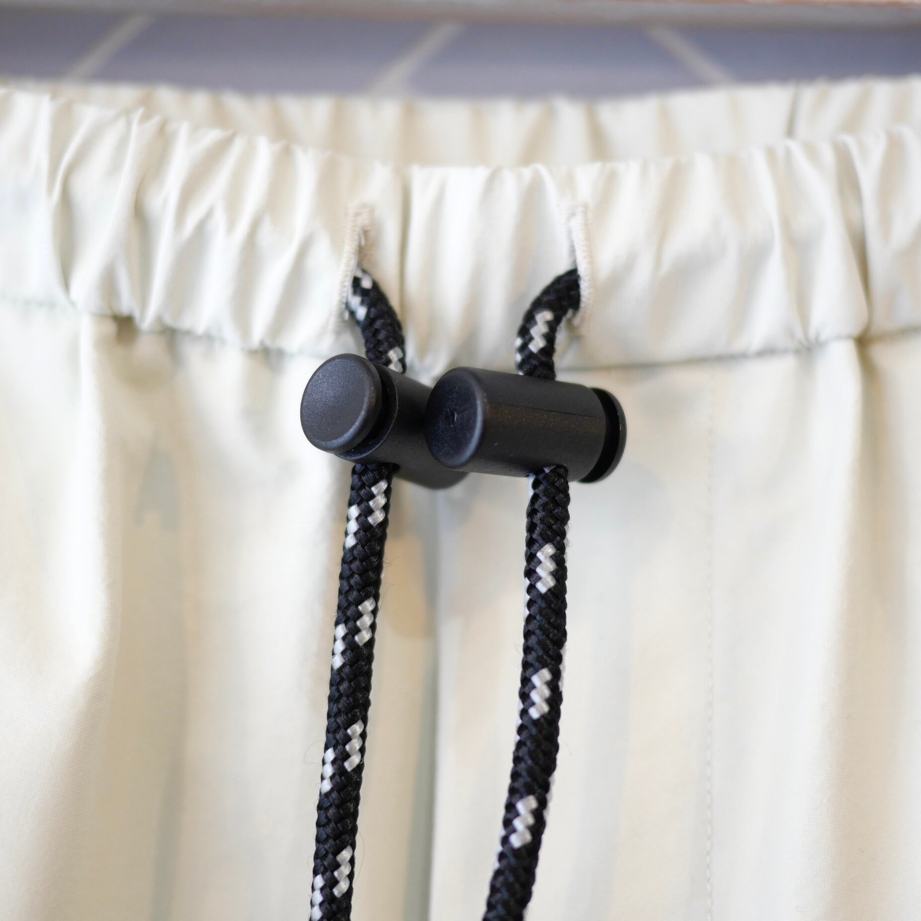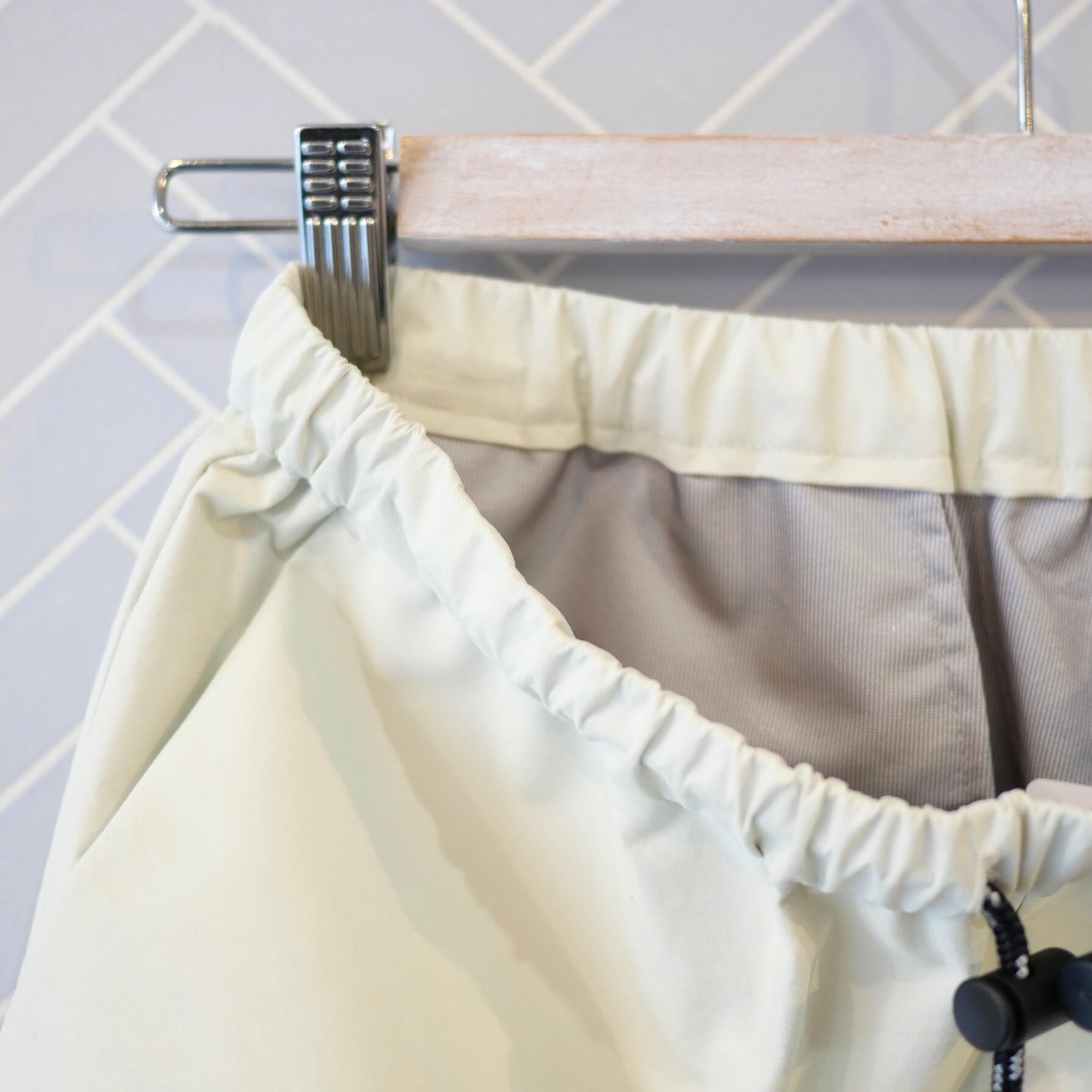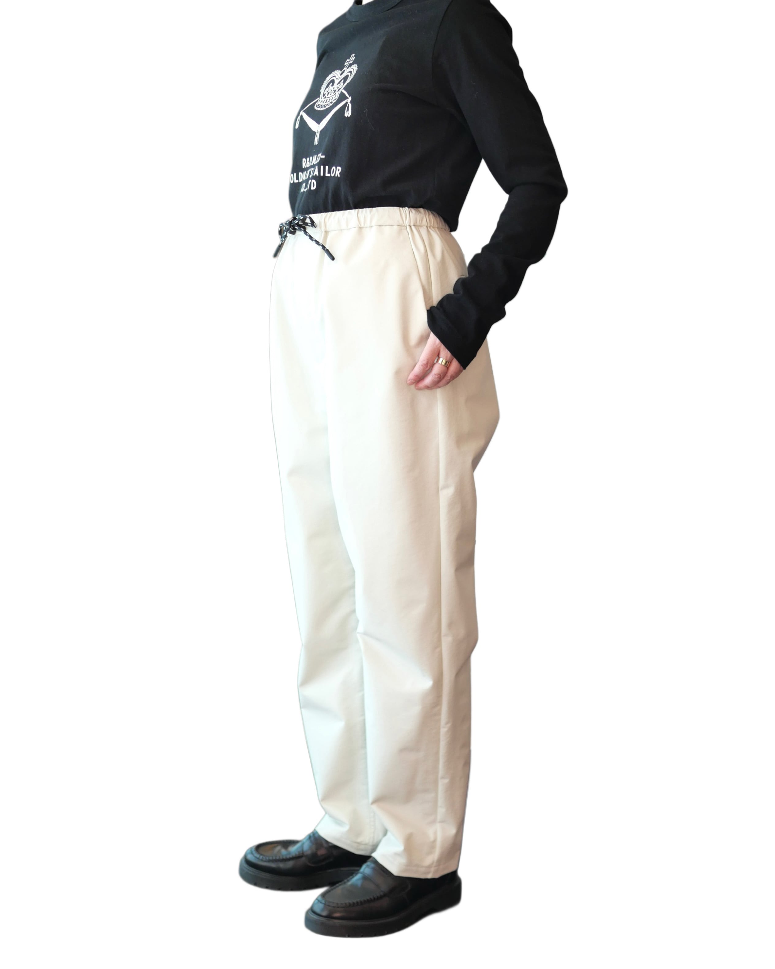 防水加工が施されたウォータープルーフシリーズのストリングパンツ。ウエストはゴムと紐仕様。股上が深く、すっきりとしたシルエットです。アウトドアのお出かけにはもちろん、雨の日の通勤やお出かけにも便利です。