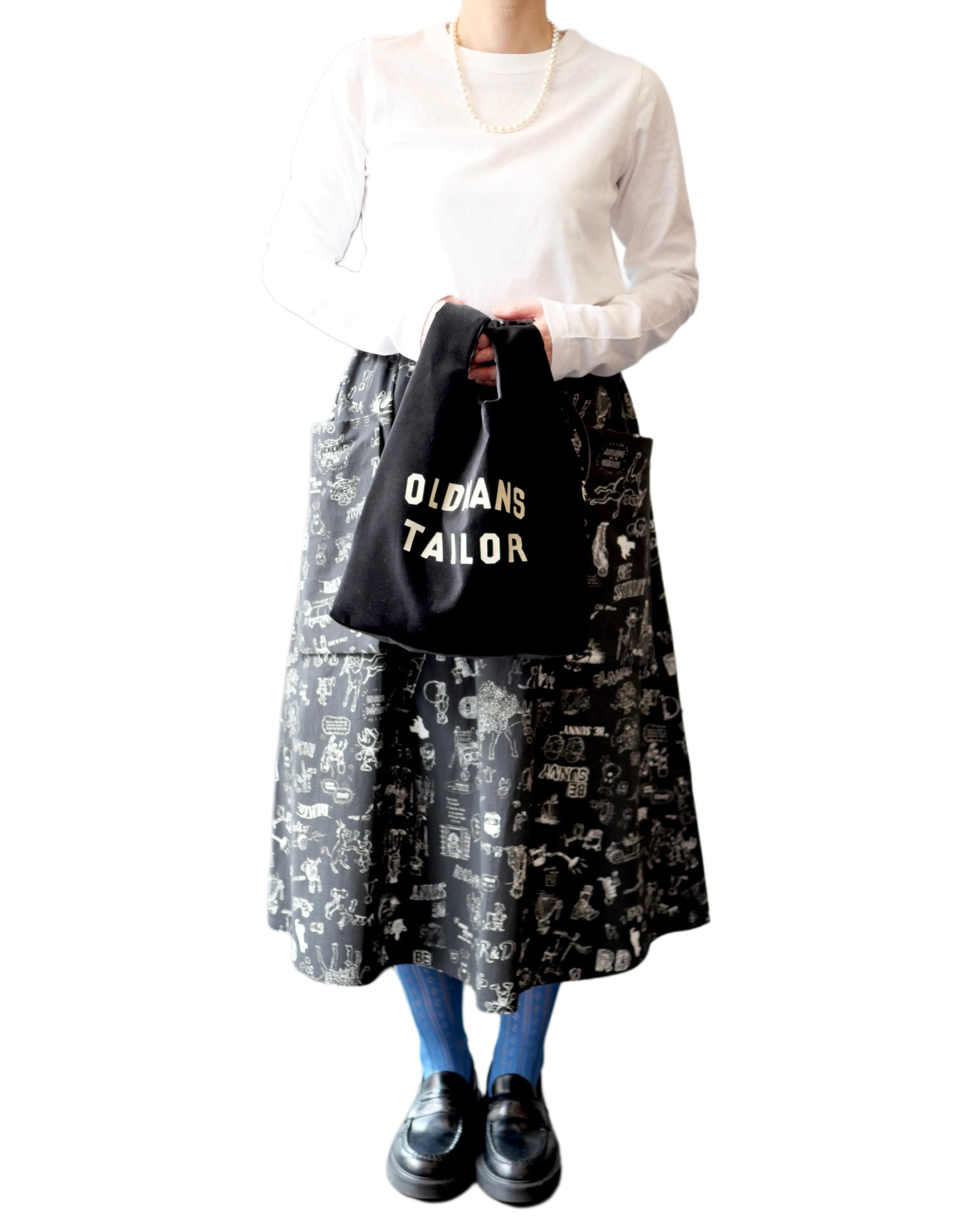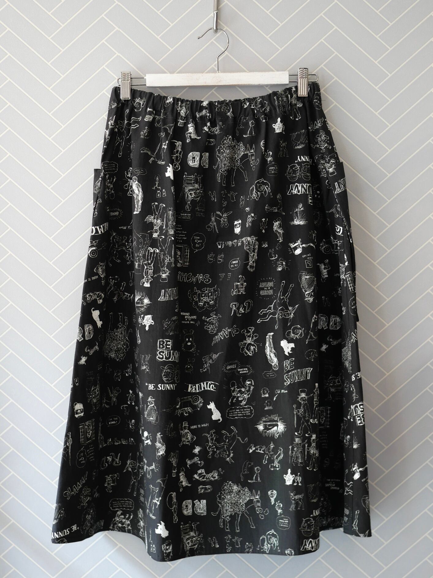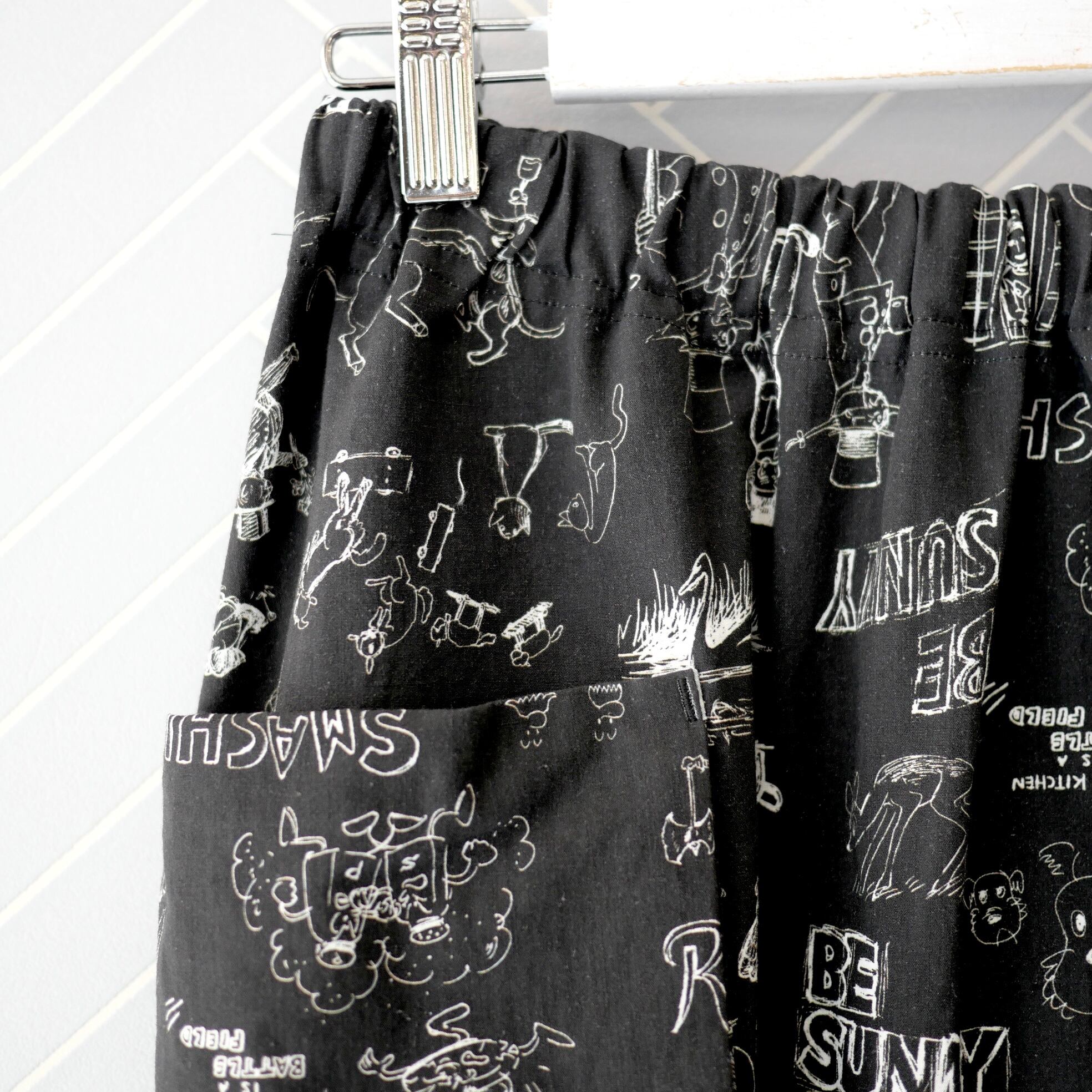 2026春の新柄「グラフィティー」。いろんな柄やキャラクターの落書きがそのまま柄の名前になっています。鉛筆画タッチの繊細な描写や、力強い陰影が高密度コットン生地に表現されています。その期の限定の生地を使ったポケットスカート。使用された生地の中に可愛い柄を存分に楽しむ事が出来、贅沢なボトムスに仕上がっています。おさえめなフレアと、サイドポケットの立体感の効果で、スッキリとしたスタイリングに仕上がります。