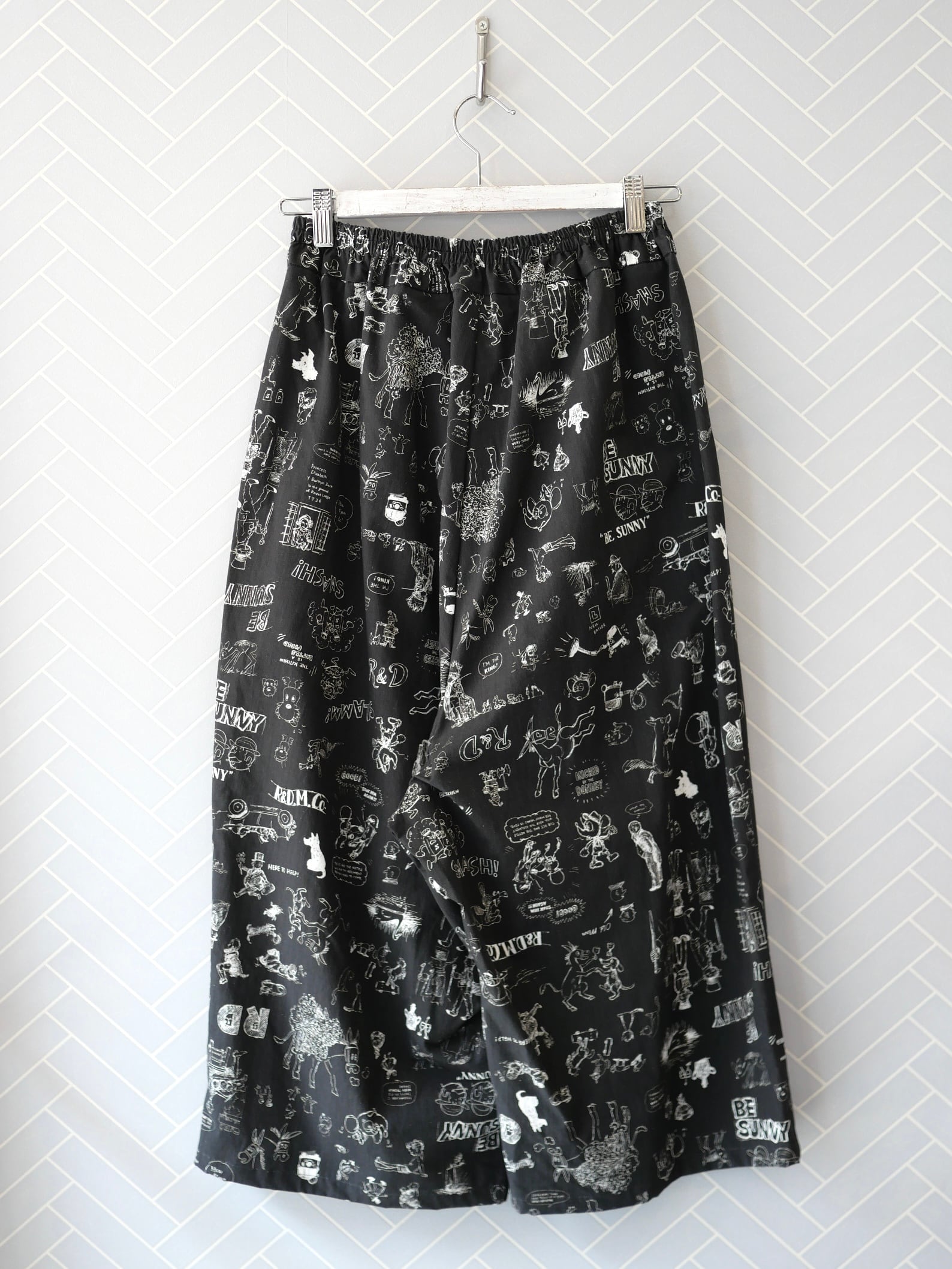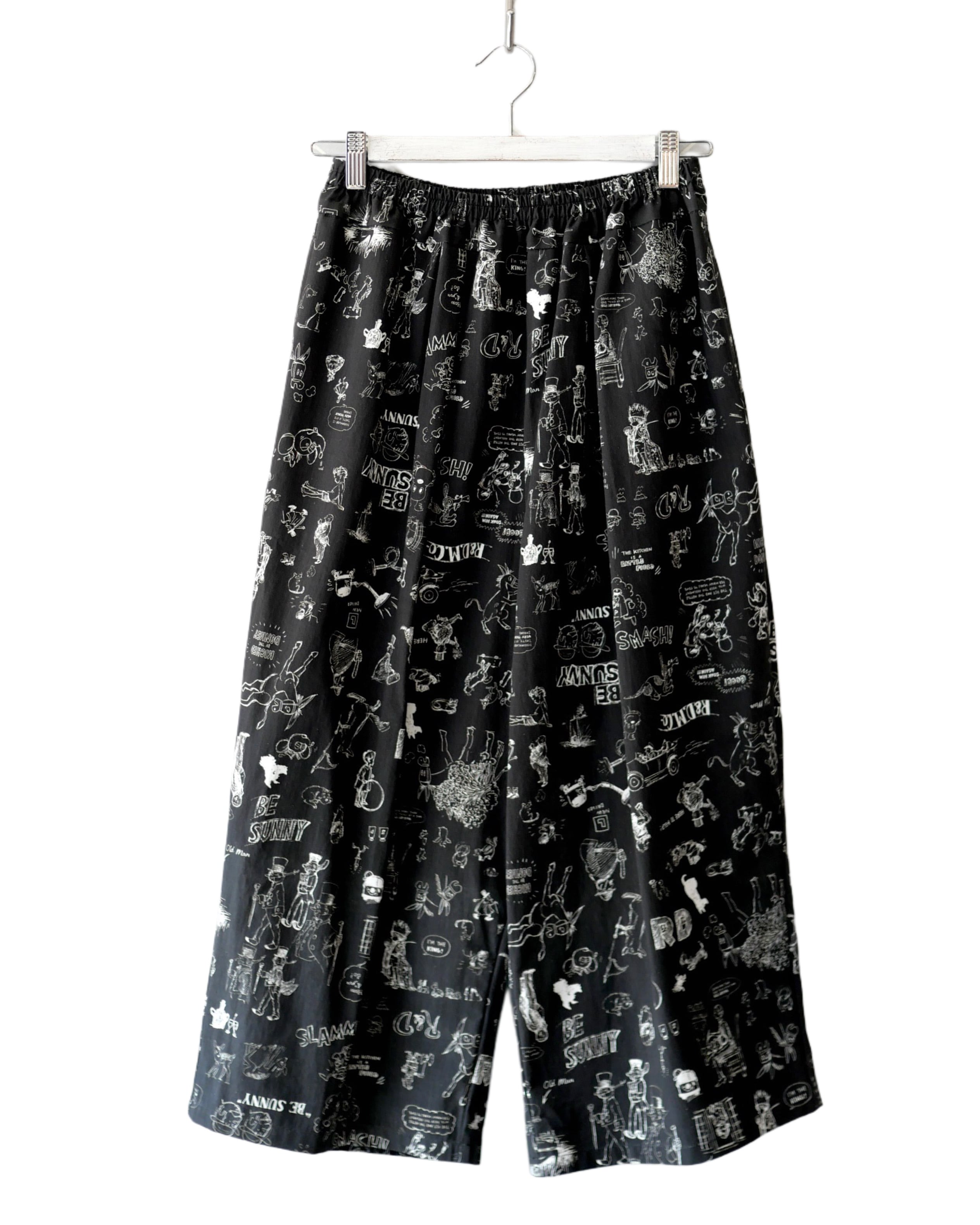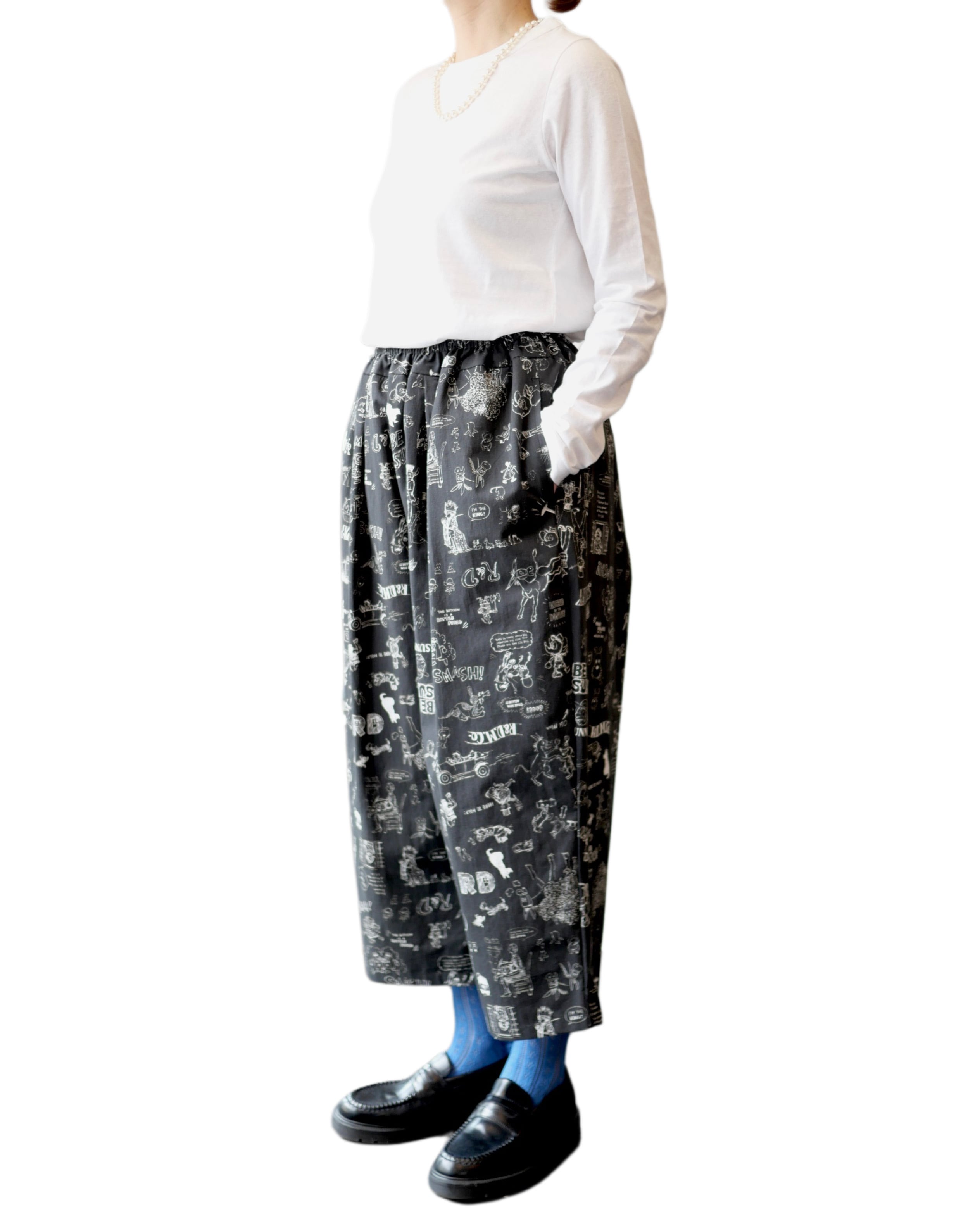 2026春の新柄「グラフィティー」。いろんな柄やキャラクターの落書きがそのまま柄の名前になっています。鉛筆画タッチの繊細な描写や、力強い陰影がコットン生地に表現されています。その期の限定の生地を使ったゴムパンツ。使用された生地の中に可愛い柄を存分に楽しむ事が出来、贅沢なボトムスに仕上がっています。