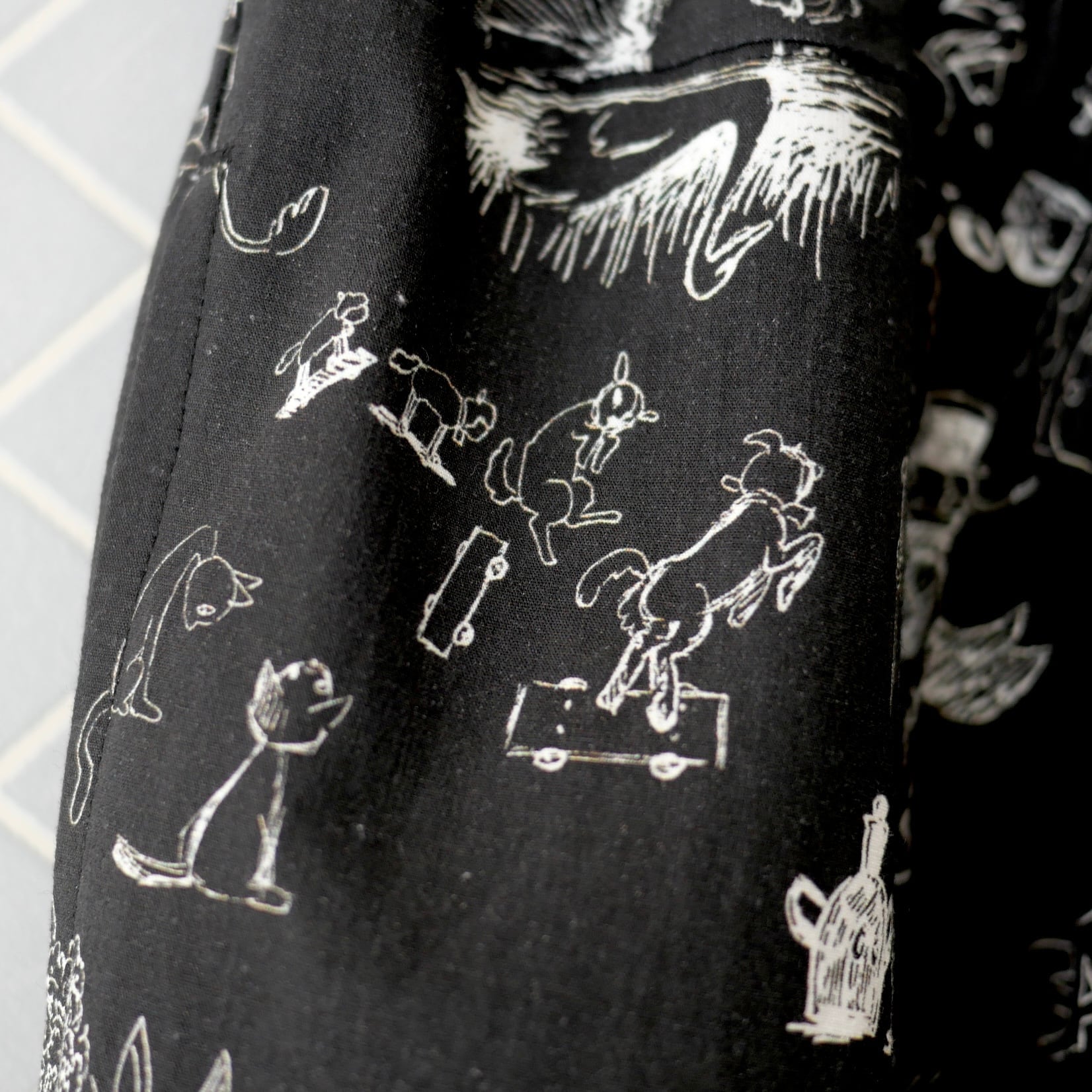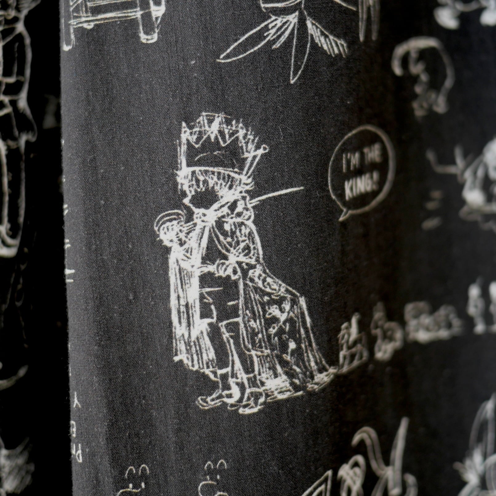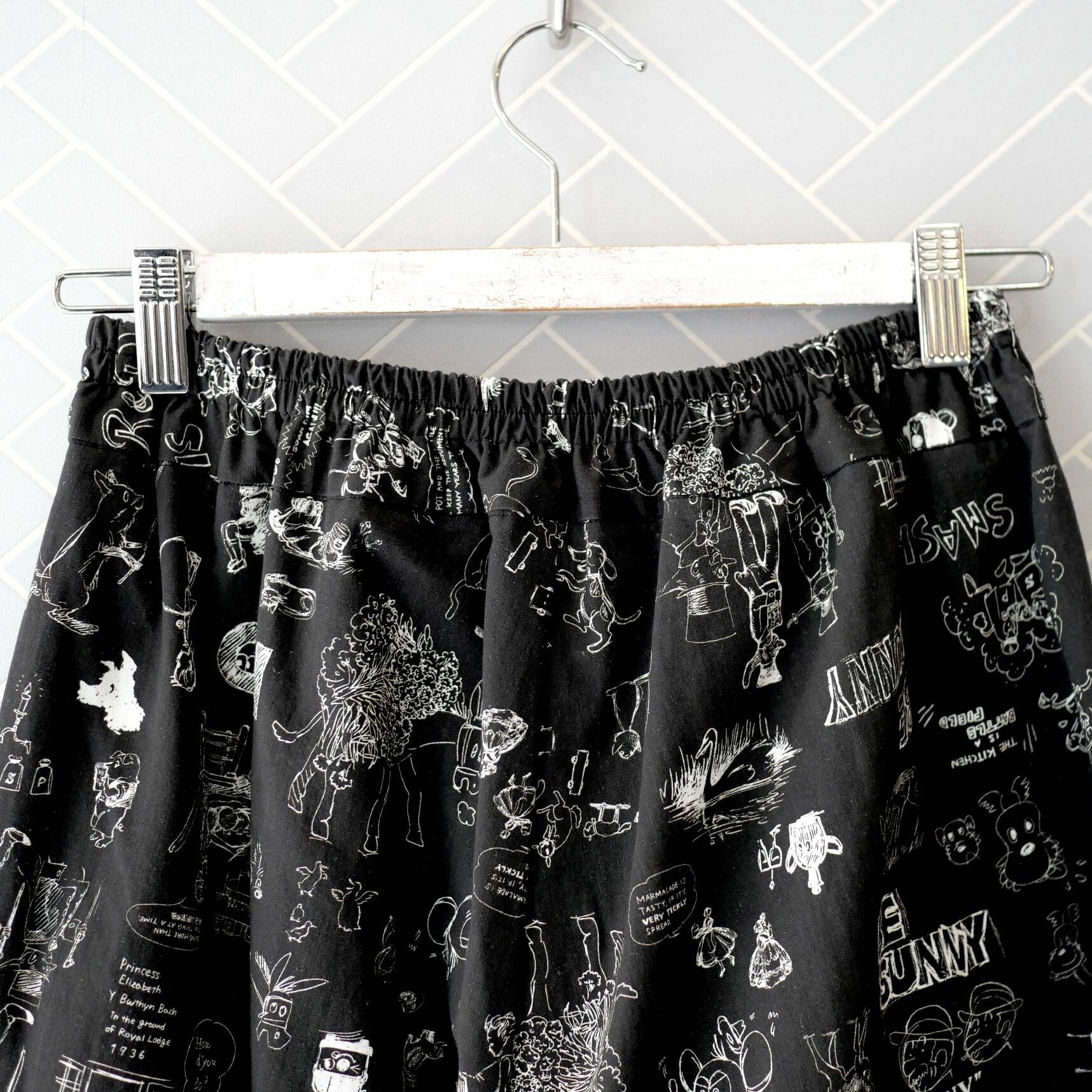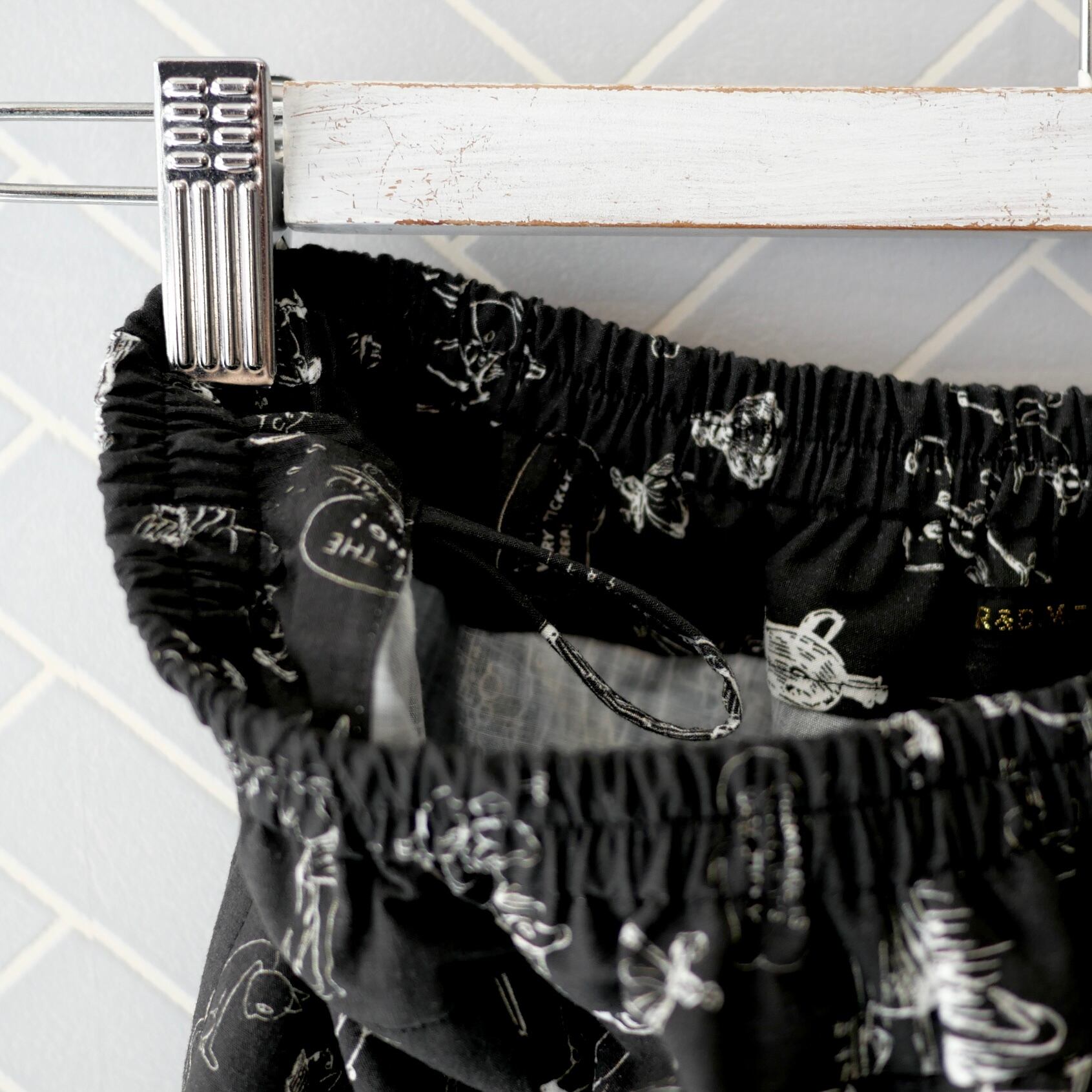 2026春の新柄「グラフィティー」。いろんな柄やキャラクターの落書きがそのまま柄の名前になっています。鉛筆画タッチの繊細な描写や、力強い陰影がコットン生地に表現されています。その期の限定の生地を使ったゴムパンツ。使用された生地の中に可愛い柄を存分に楽しむ事が出来、贅沢なボトムスに仕上がっています。