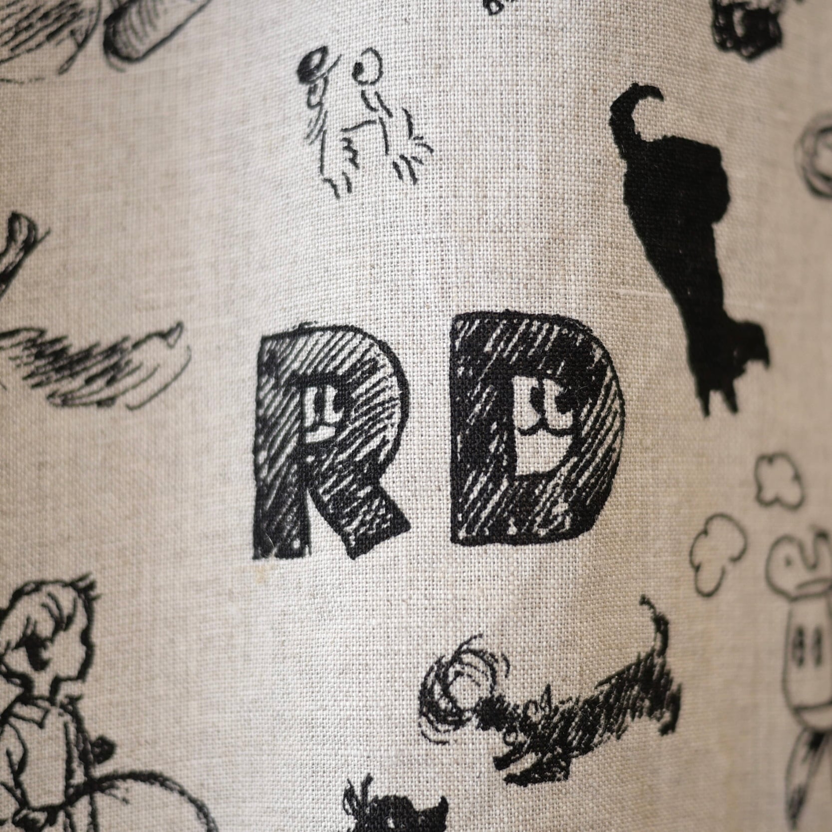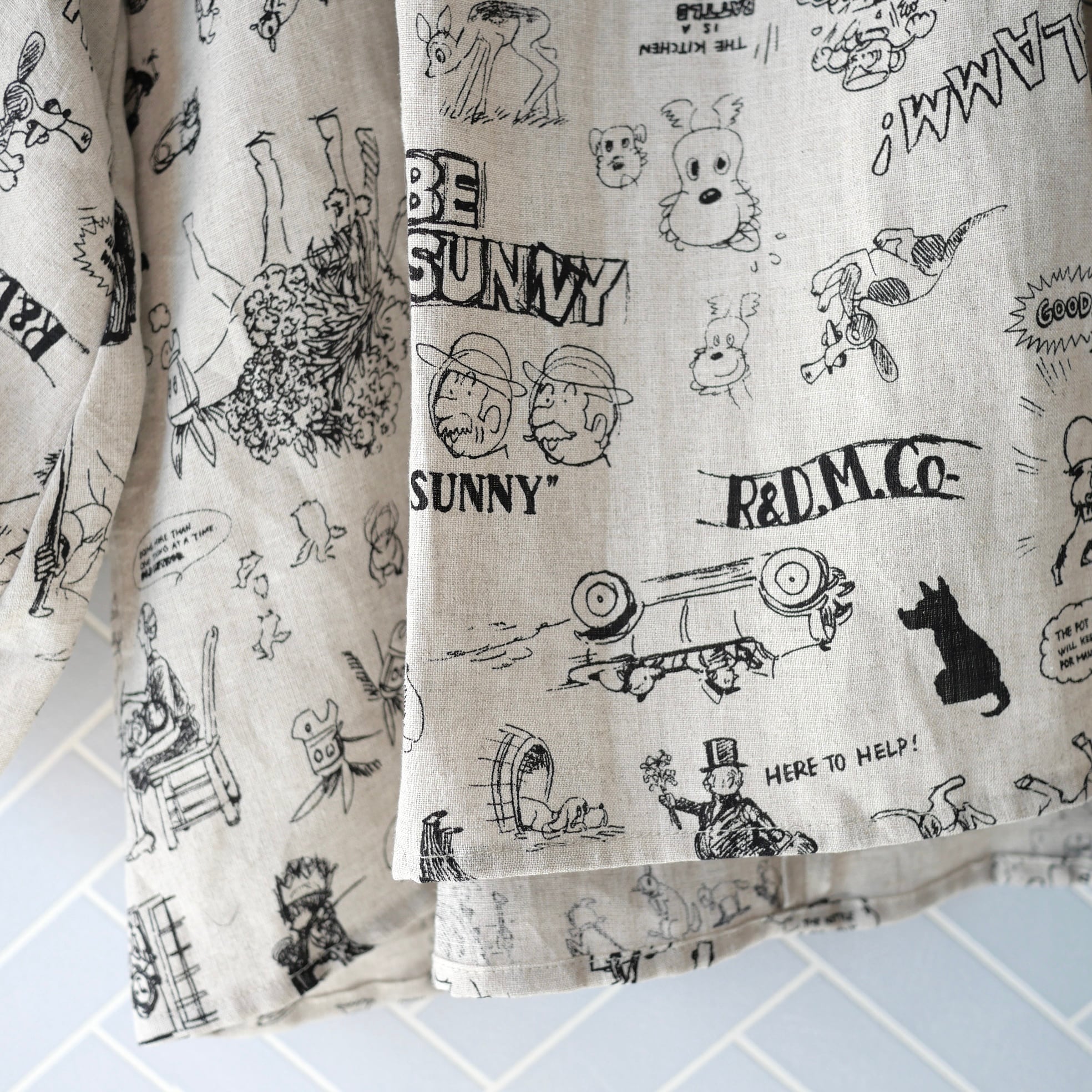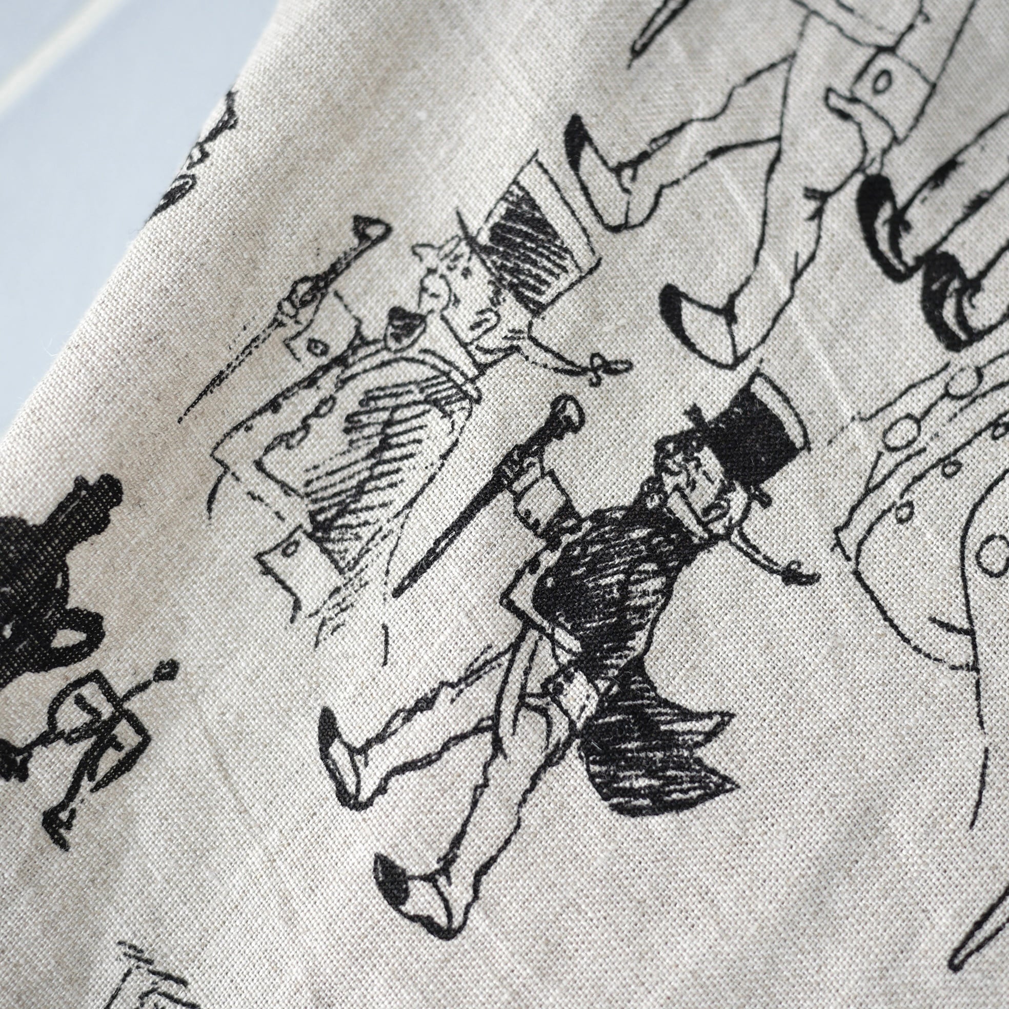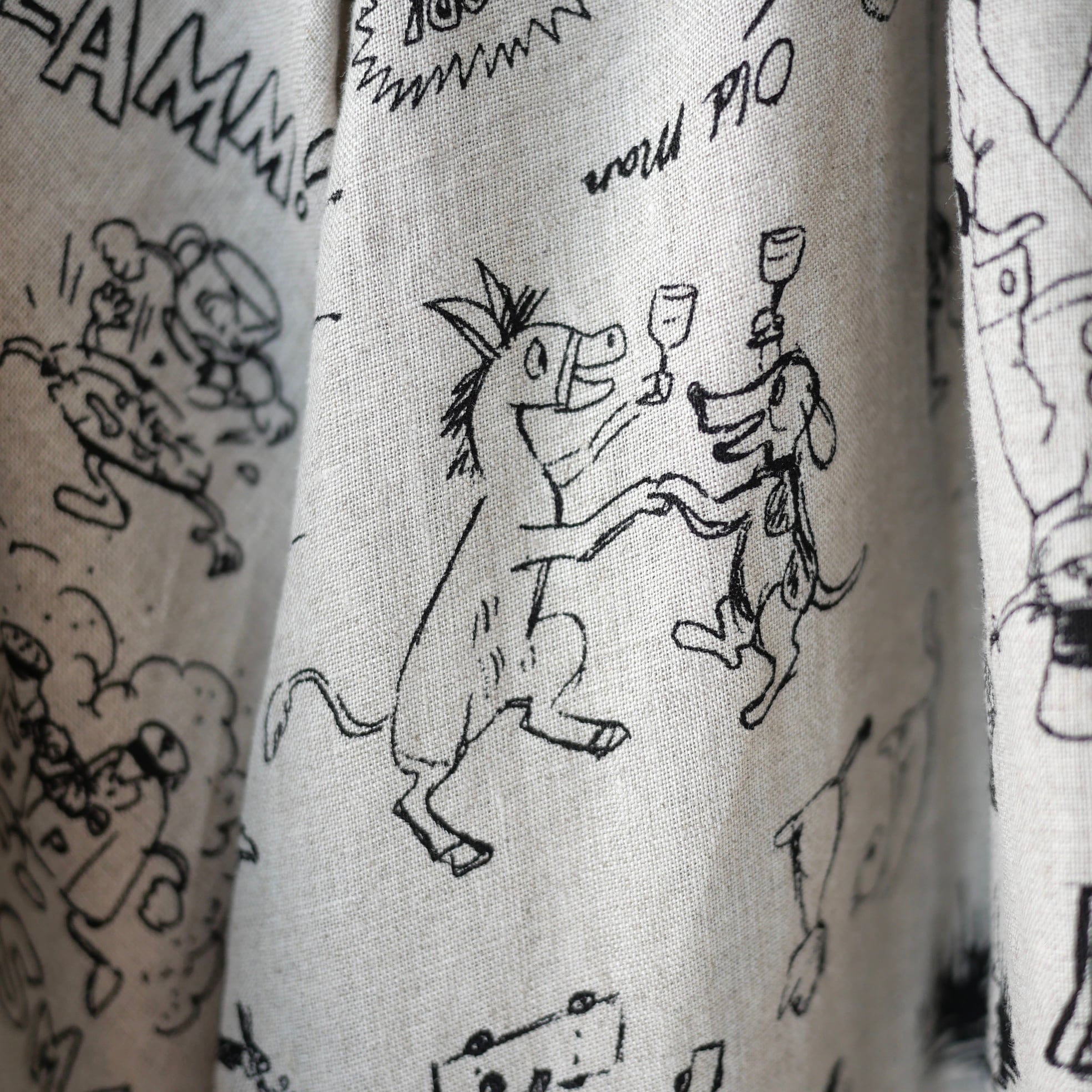 2026春の新柄「グラフィティー」。いろんな柄やキャラクターの落書きがそのまま柄の名前になっています。鉛筆画タッチの繊細な描写や、力強い陰影がリネン生地に表現されています。