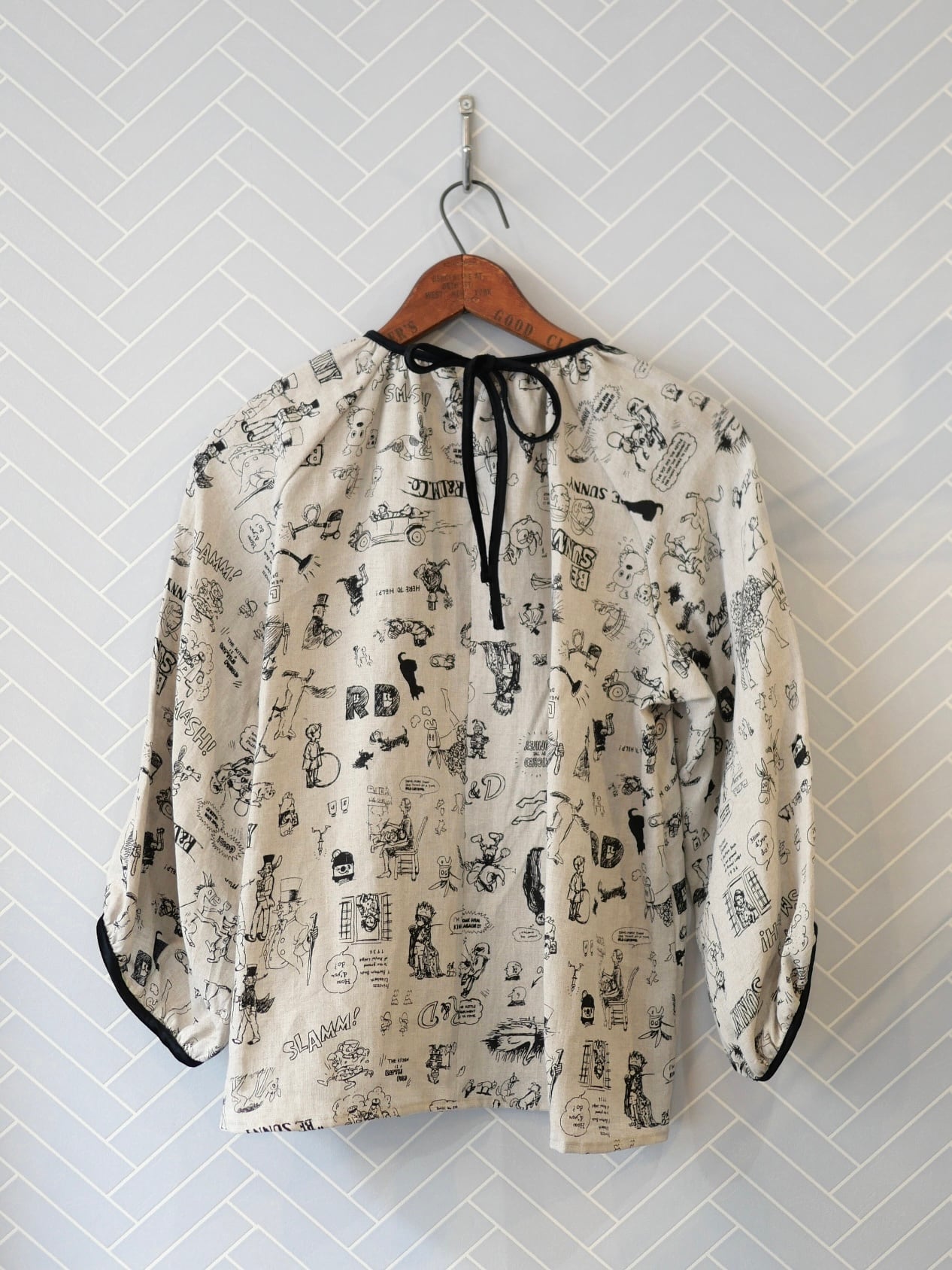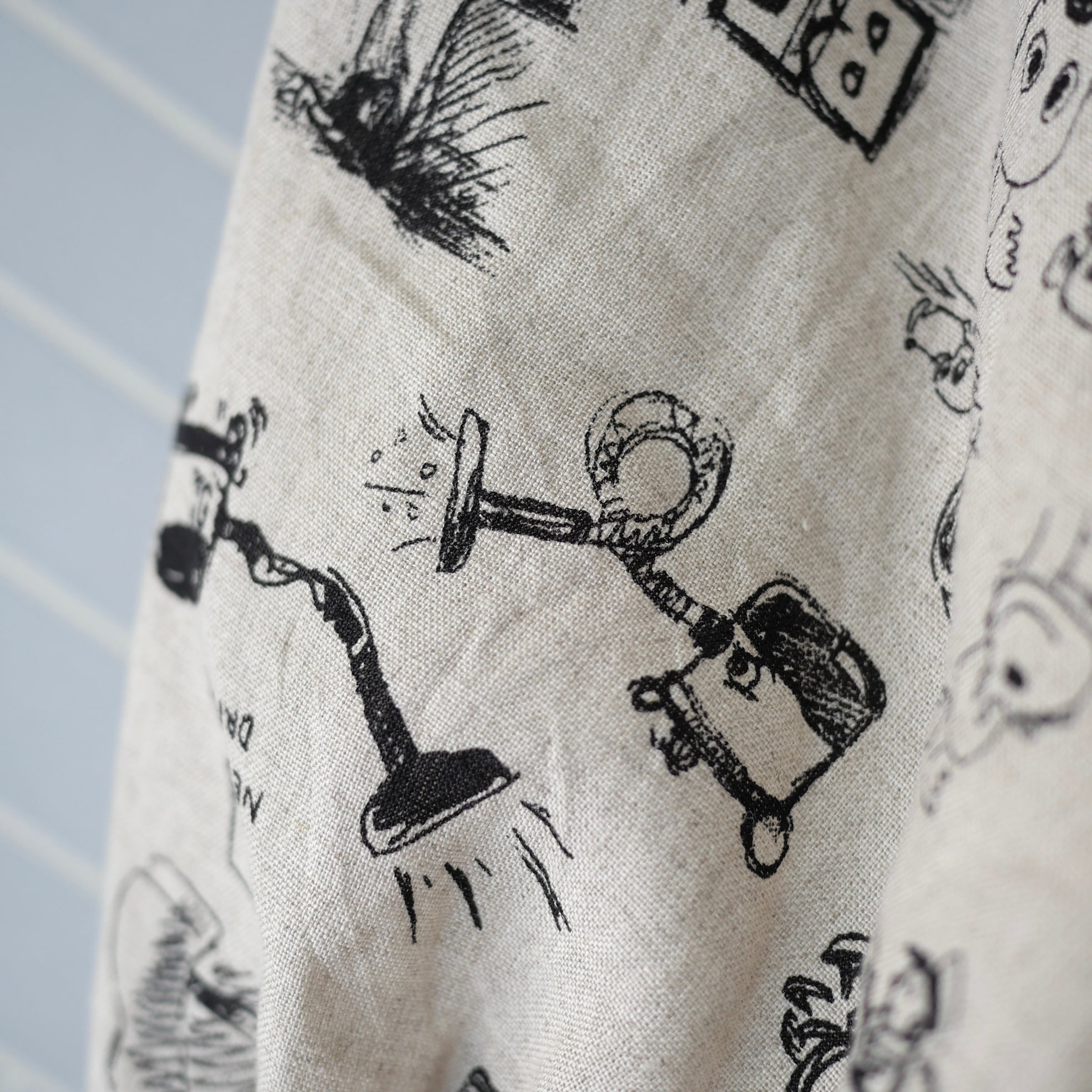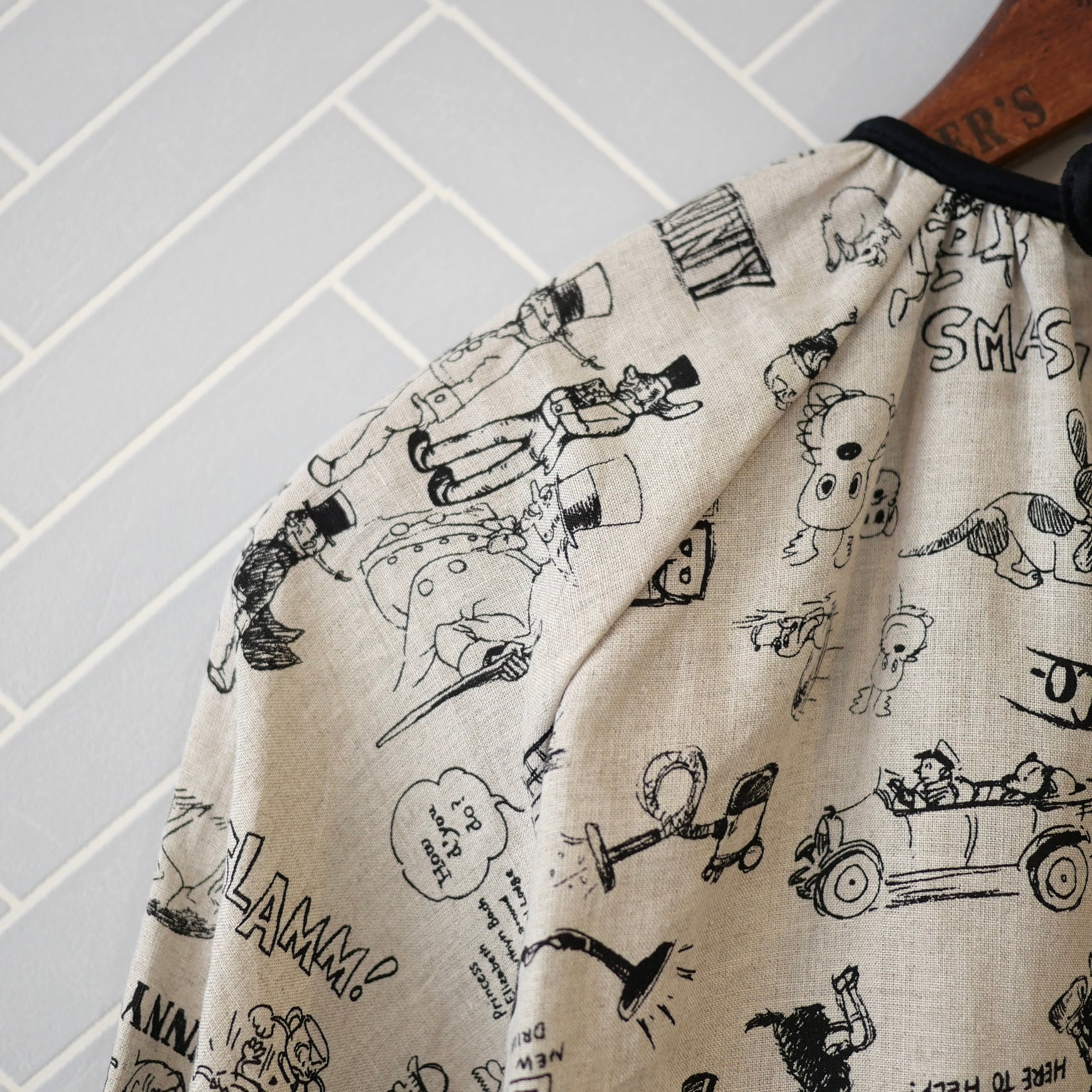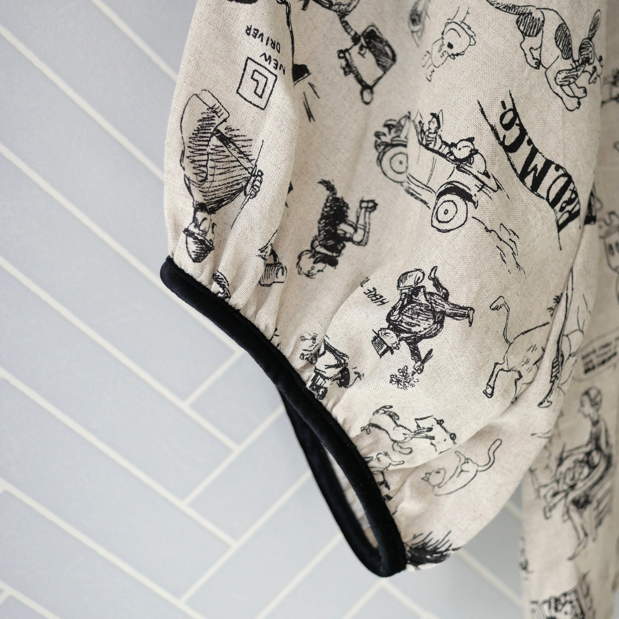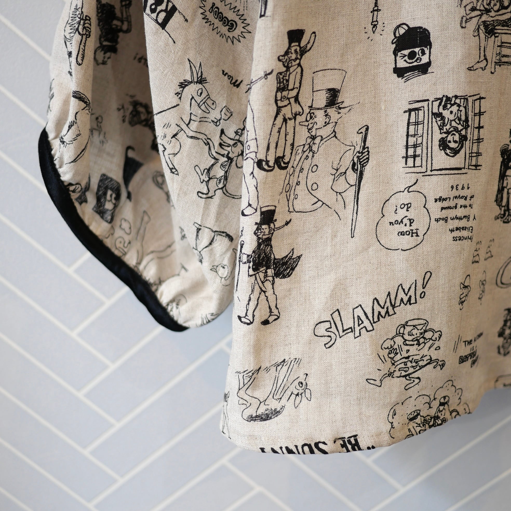 2026春の新柄「グラフィティー」。いろんな柄やキャラクターの落書きがそのまま柄の名前になっています。鉛筆画タッチの繊細な描写や、力強い陰影がリネン生地に表現されています。