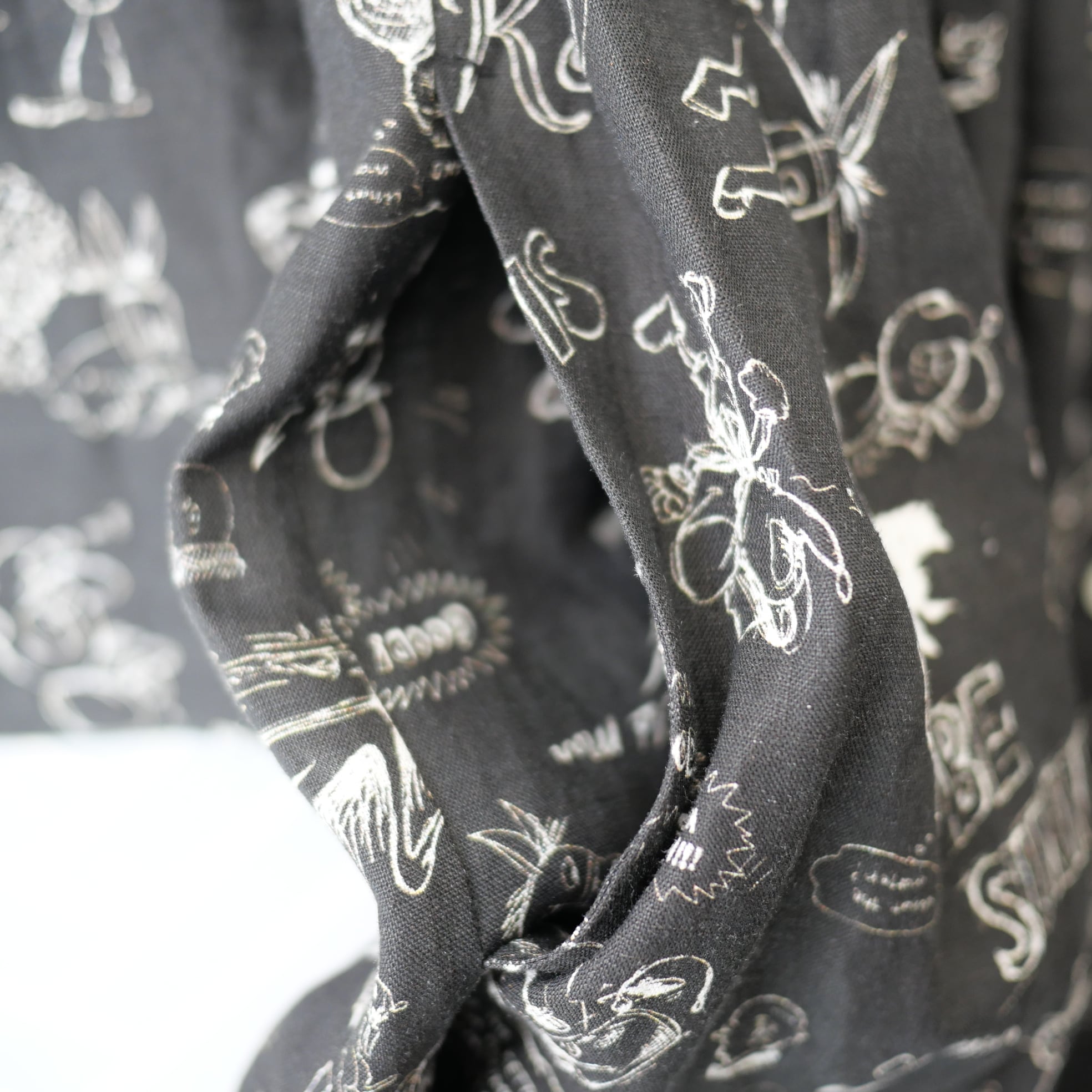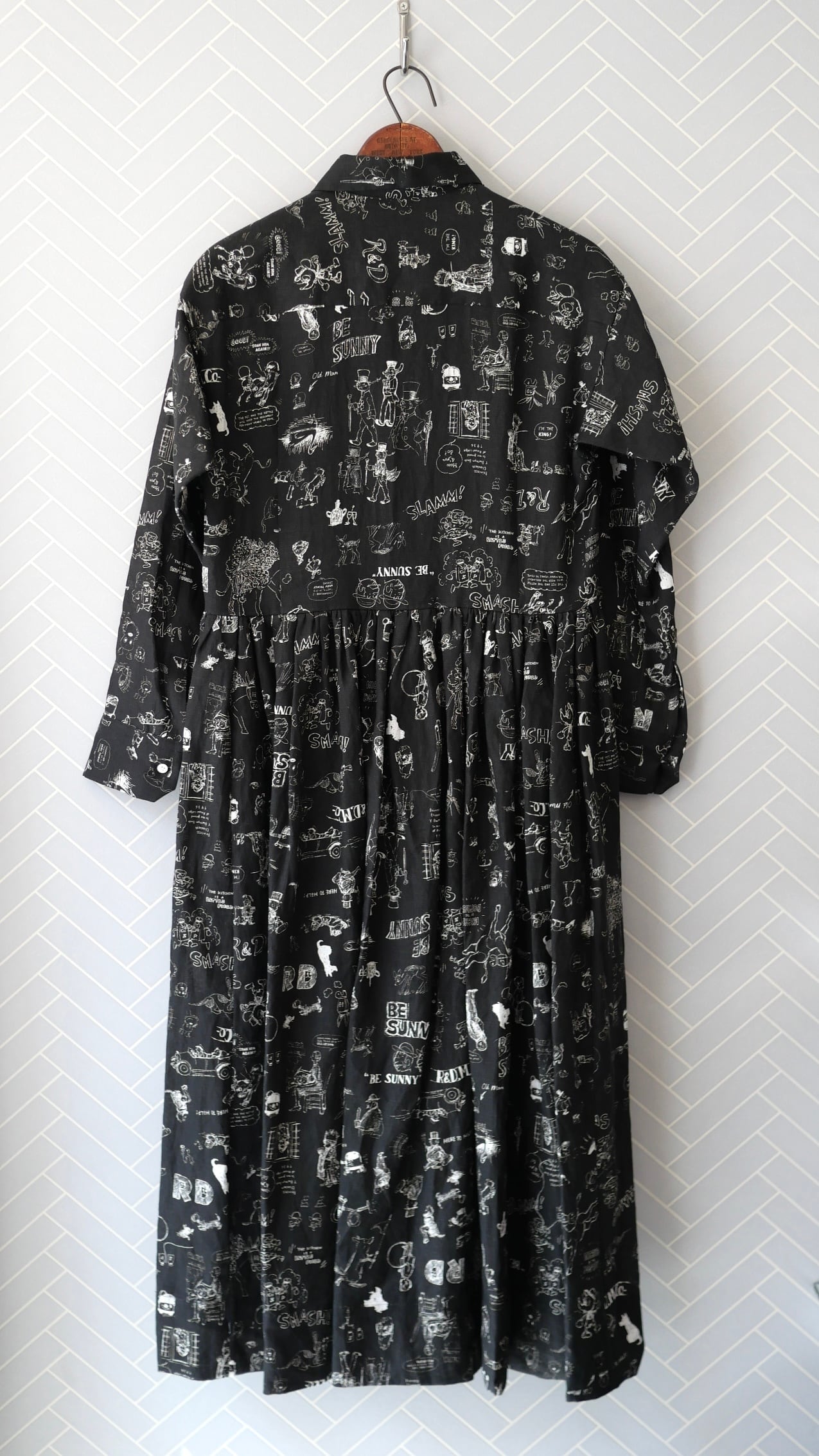2026春の新柄「グラフィティー」。いろんな柄やキャラクターの落書きがそのまま柄の名前になっています。鉛筆画タッチの繊細な描写や、力強い陰影がリネン生地に表現されています。その期の限定の生地が出来上がるたびに作られるロングシャツドレス。たっぷり使用された生地の中に可愛い柄を存分に楽しむ事が出来、贅沢なドレスに仕上がっています。ワンピースとして着ると可愛らしく、コートの様に羽織るとかっこよくなる、2wayのドレスです。