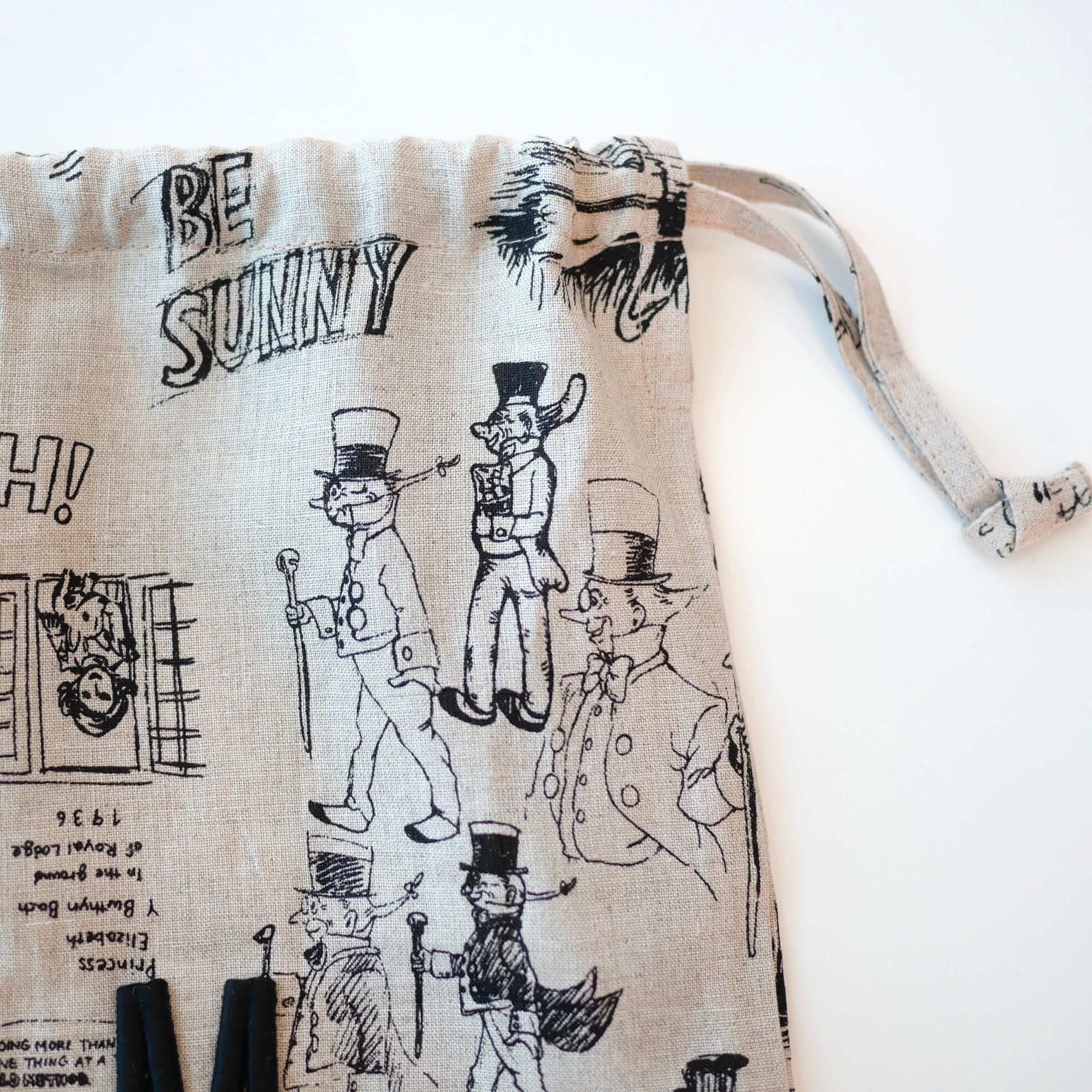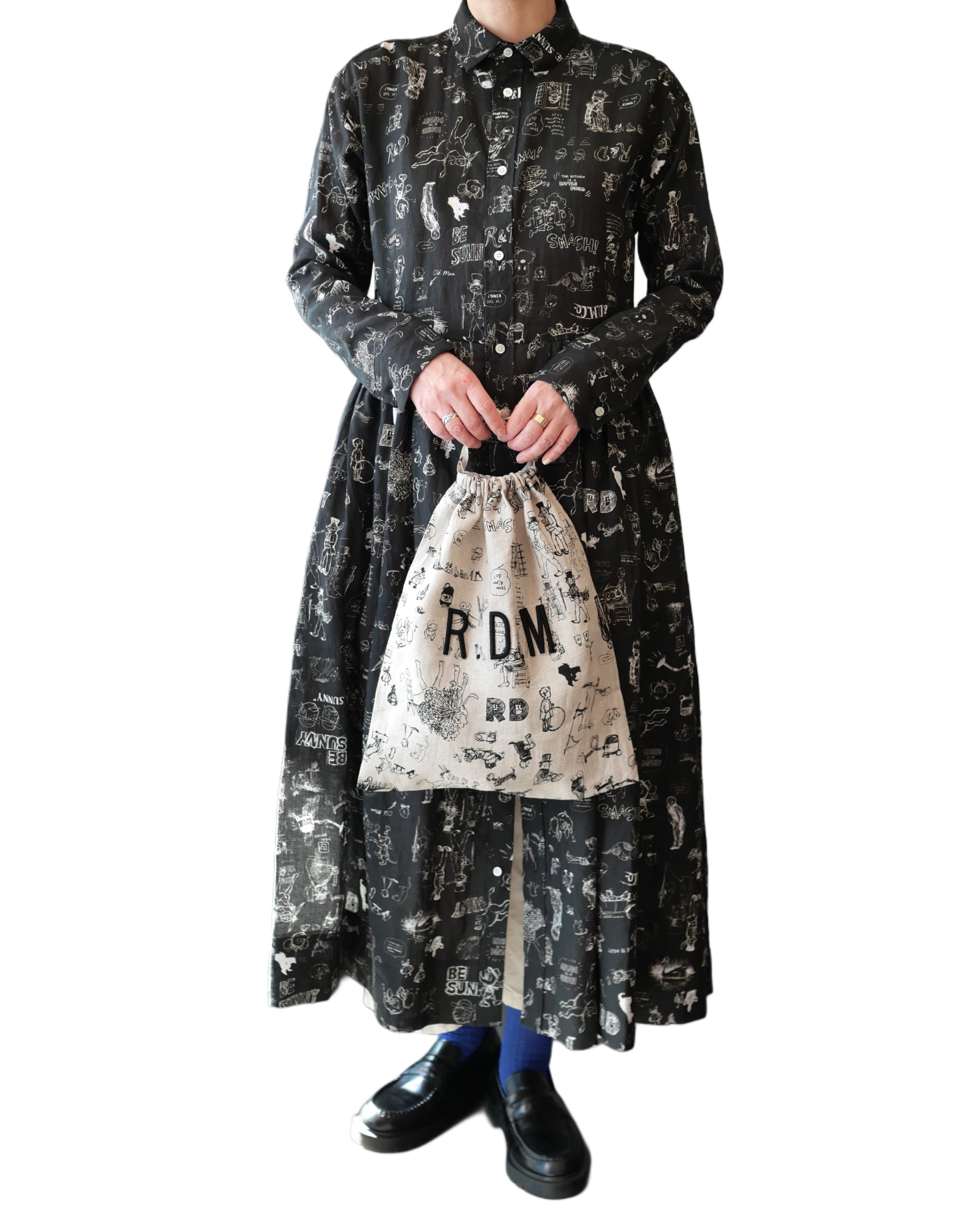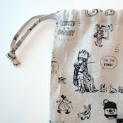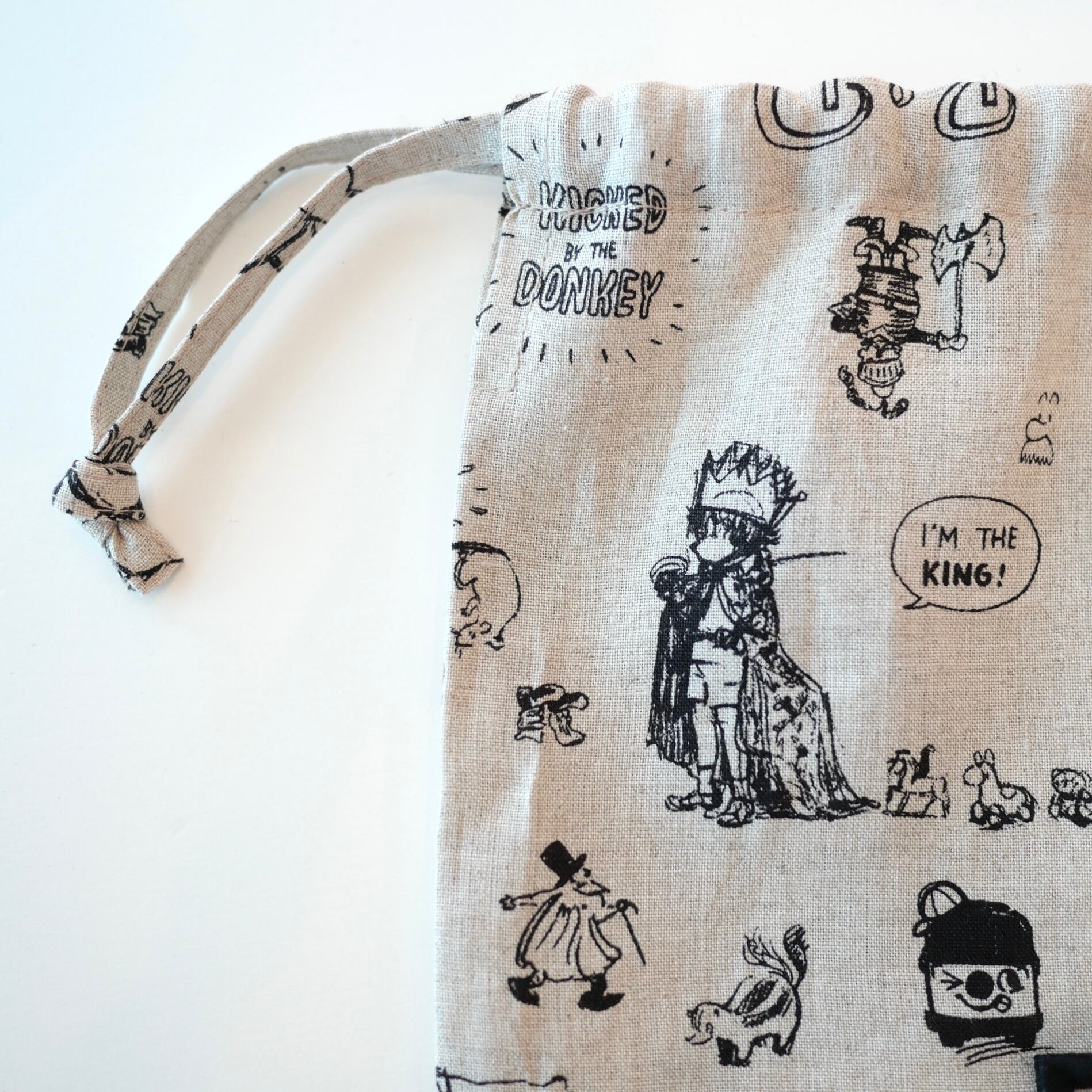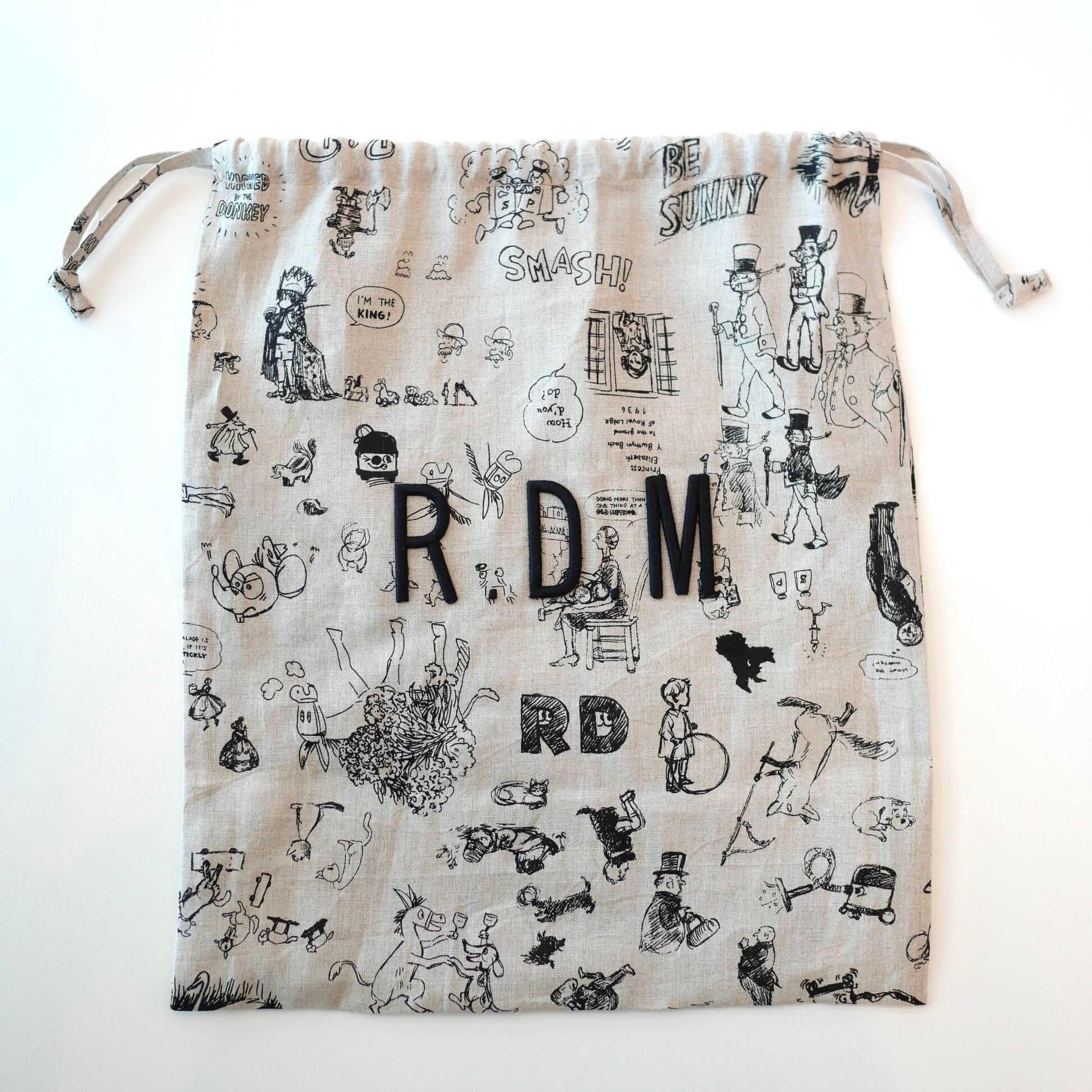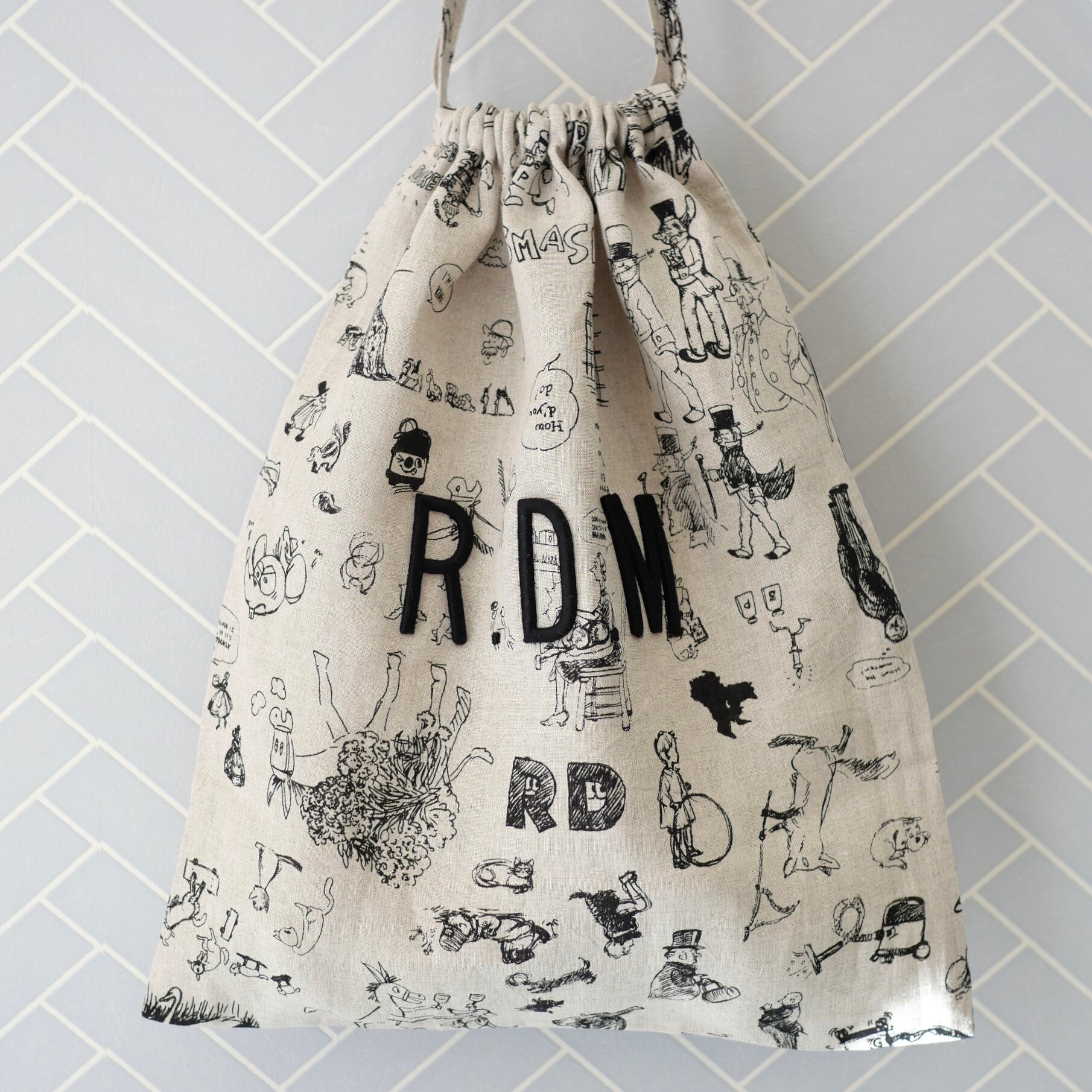 2026春の新柄「グラフィティー」。いろんな柄やキャラクターの落書きがそのまま柄の名前になっています。鉛筆画タッチの繊細な描写や、力強い陰影がリネン生地に表現されています。RDMの刺繍が素敵なフォローストリングバック。メインバックとしてはもちろん、カゴバックと合わせて持ったり、旅行の着替え用にも可愛いです。
